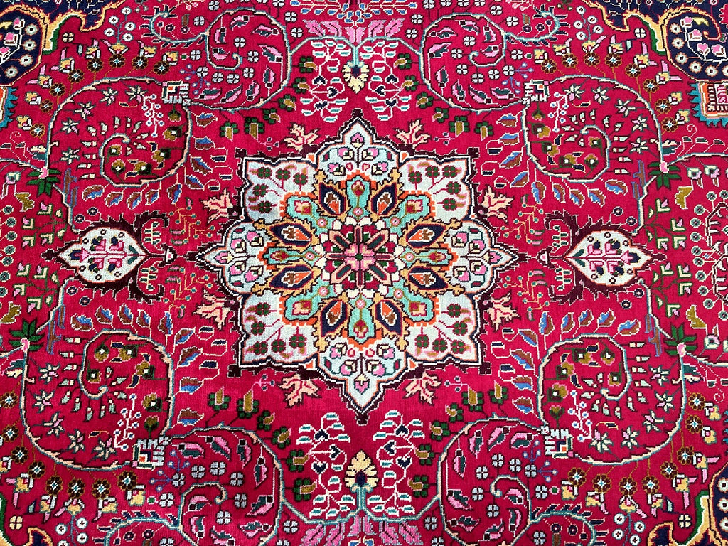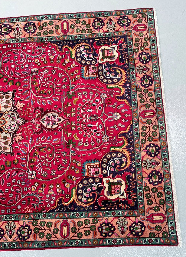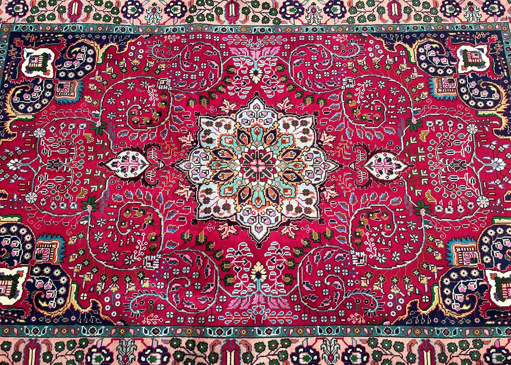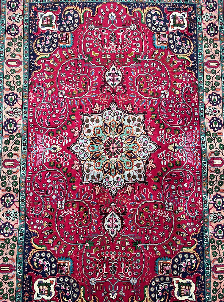 Fine Handmade Authentic Persian Tabriz Carpet. Above All It Is Hard To Get This Quality Original Handmade Rugs From City Of Tabriz. Pure Lamb’s Wool Pile On Cotton Base. It Also Has A Beautiful Red, Beige, Indigo Blue, Green, Peach And Gold Dyed Using Traditional Methods.