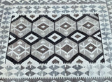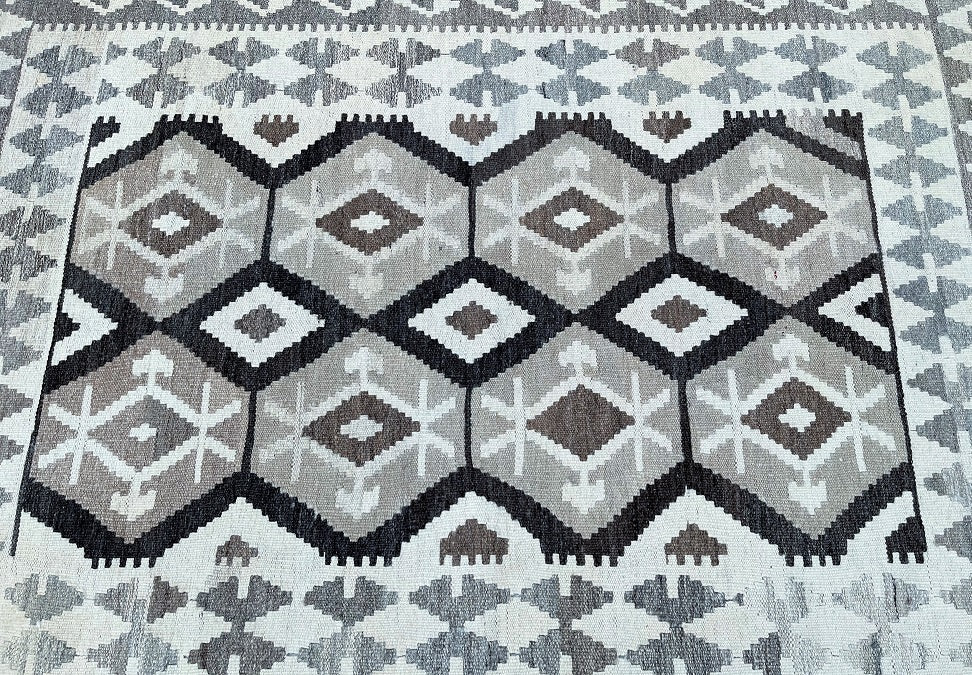 What sets this rug apart is its captivating geometric design with a modern twist. The intricate patterns and symmetrical motifs are reminiscent of traditional Afghan kilim rugs, but they are cleverly reimagined with contemporary elements to give it a fresh and trendy appeal.