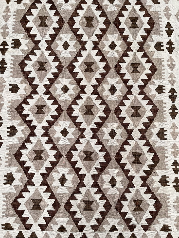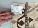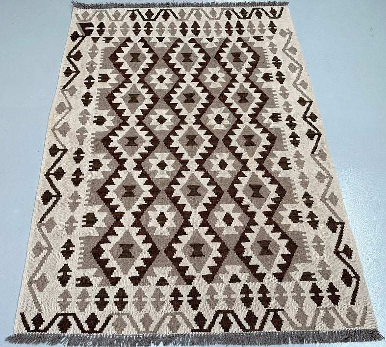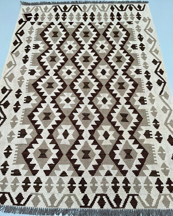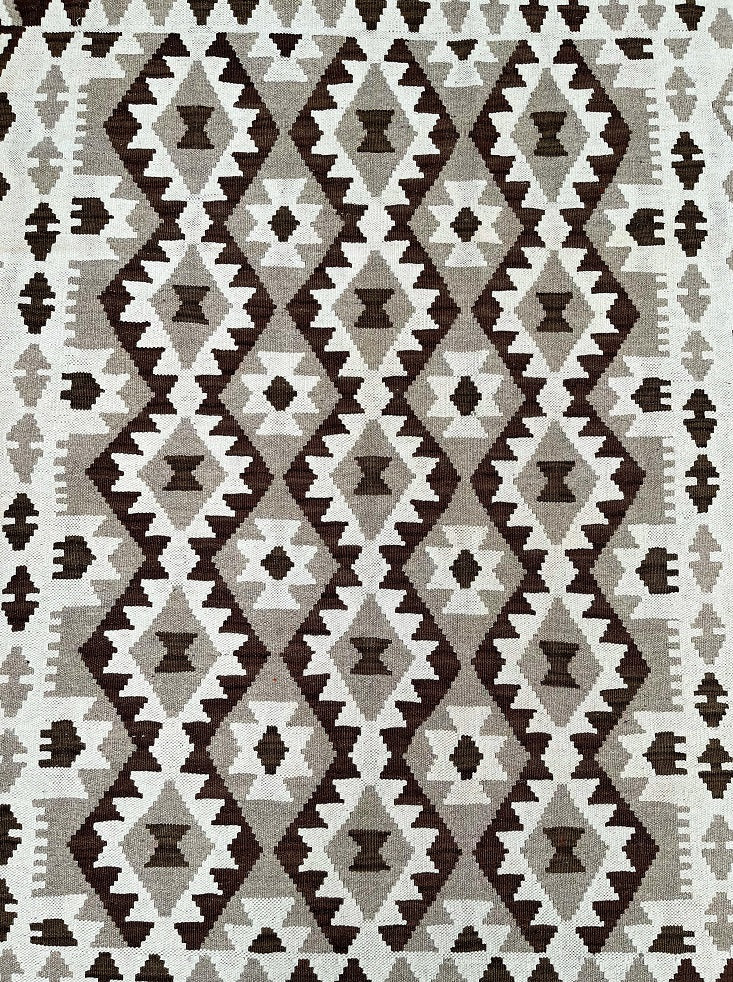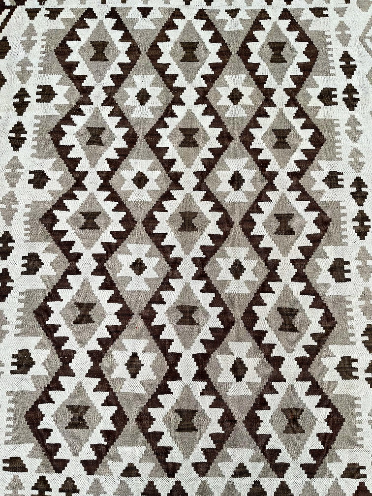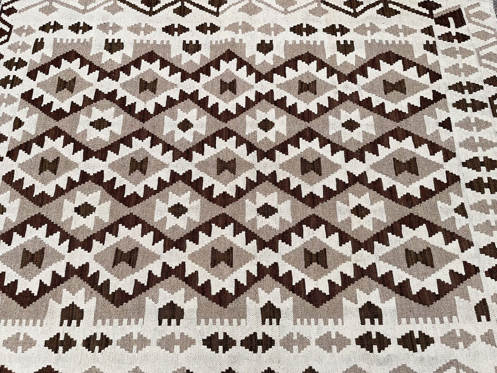 Coffee Table Size Nomadic Hand Woven Afghan Meymana Kilim. Above All It Is A Very Versatile Size. It Also Has A Pure Hand Spun Wool Pile On Wool Base. Neutral Beige And Brown Tone Dyed Using Traditional Methods.