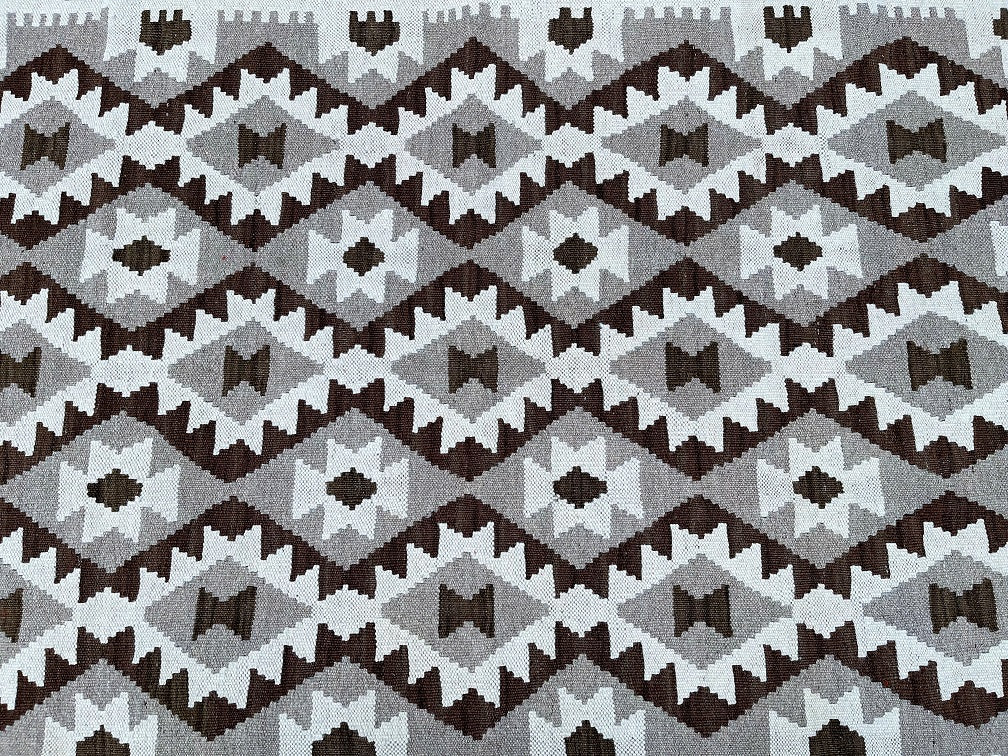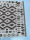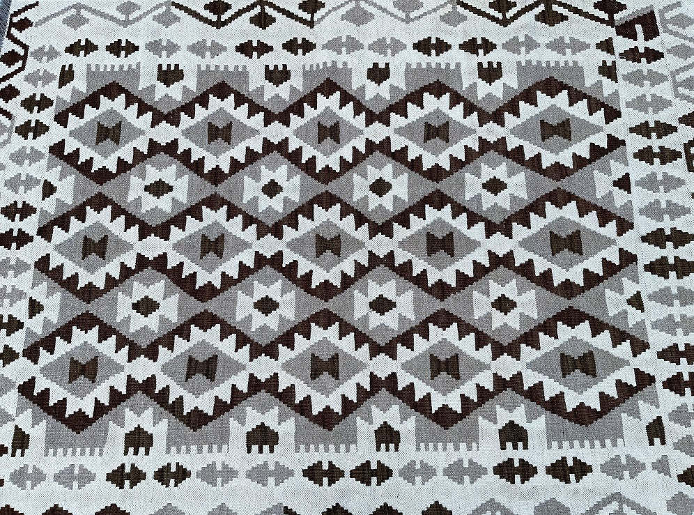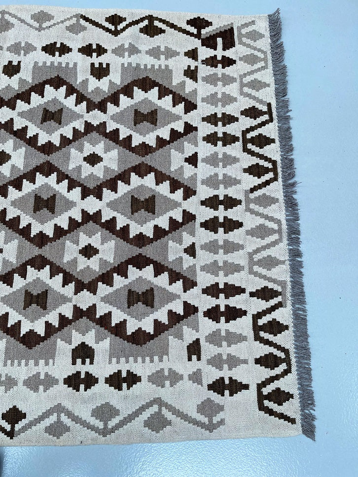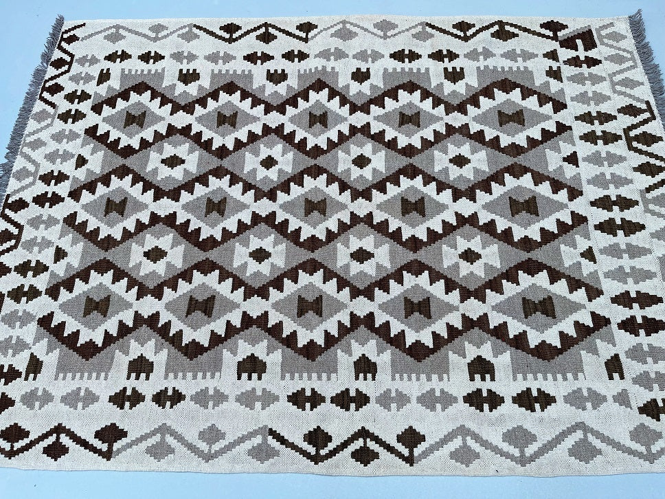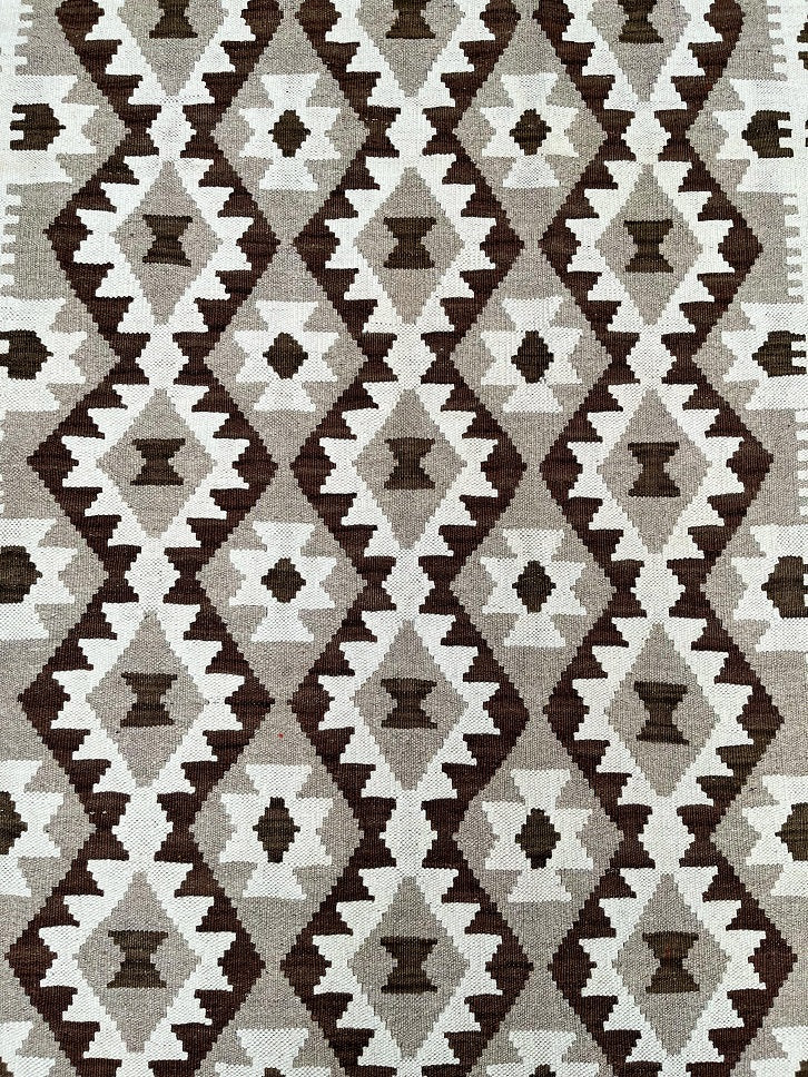 Coffee Table Size Nomadic Hand Woven Afghan Meymana Kilim. Above All It Is A Very Versatile Size. It Also Has A Pure Hand Spun Wool Pile On Wool Base. Neutral Beige And Brown Tone Dyed Using Traditional Methods.