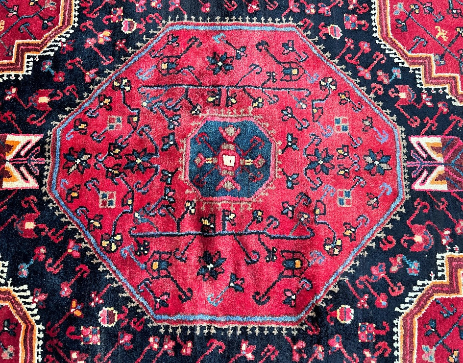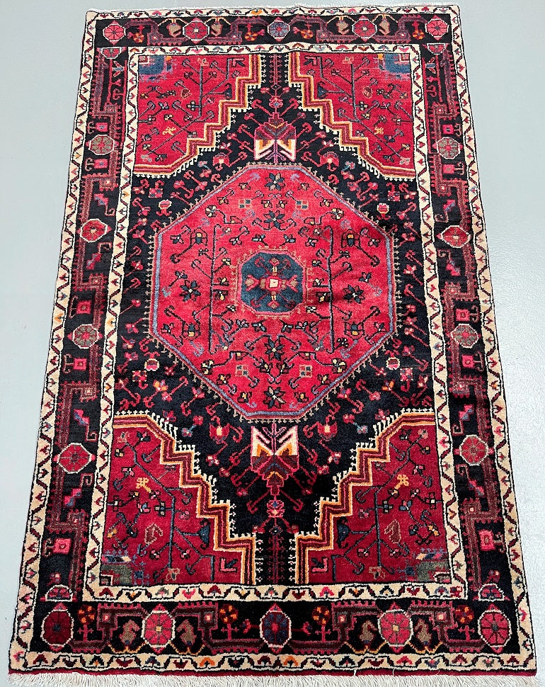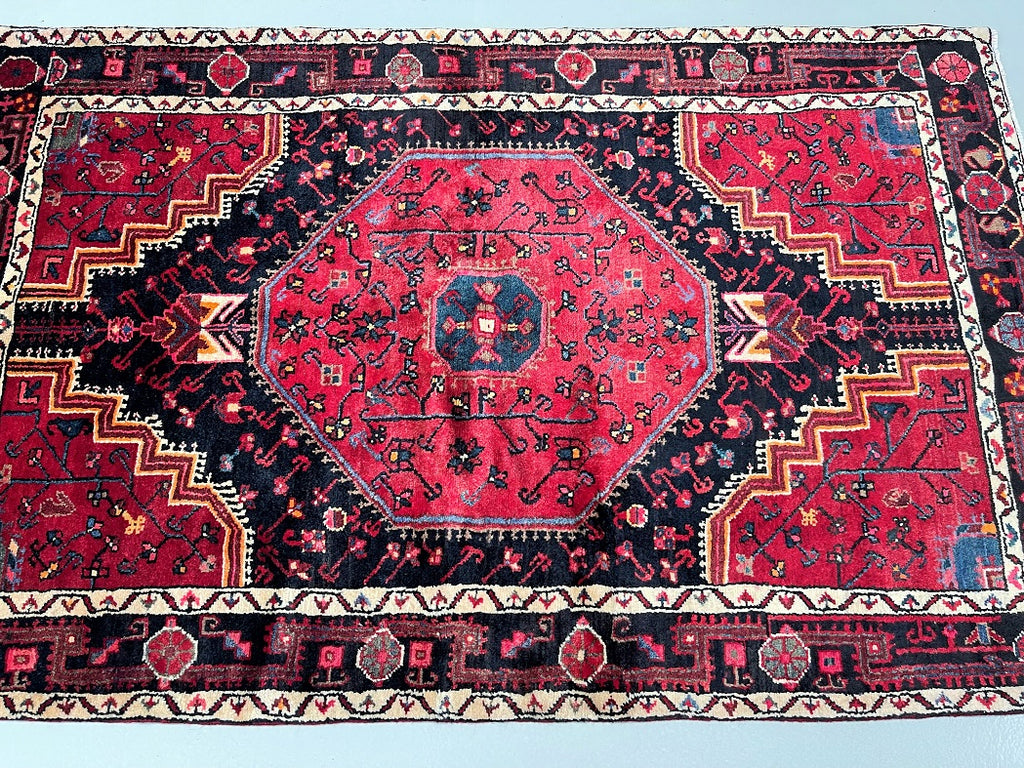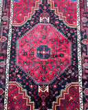Collectible Coffee Table Size Genuine Handmade Persian Village Nahavand Rug. Above All It Is A Very Hard Wearing Rug. Pure Hand Spun Wool Pile On Cotton Base. It Also Has a Deep Indigo Blue/Black And Red Tone Dyed Using Traditional Methods.