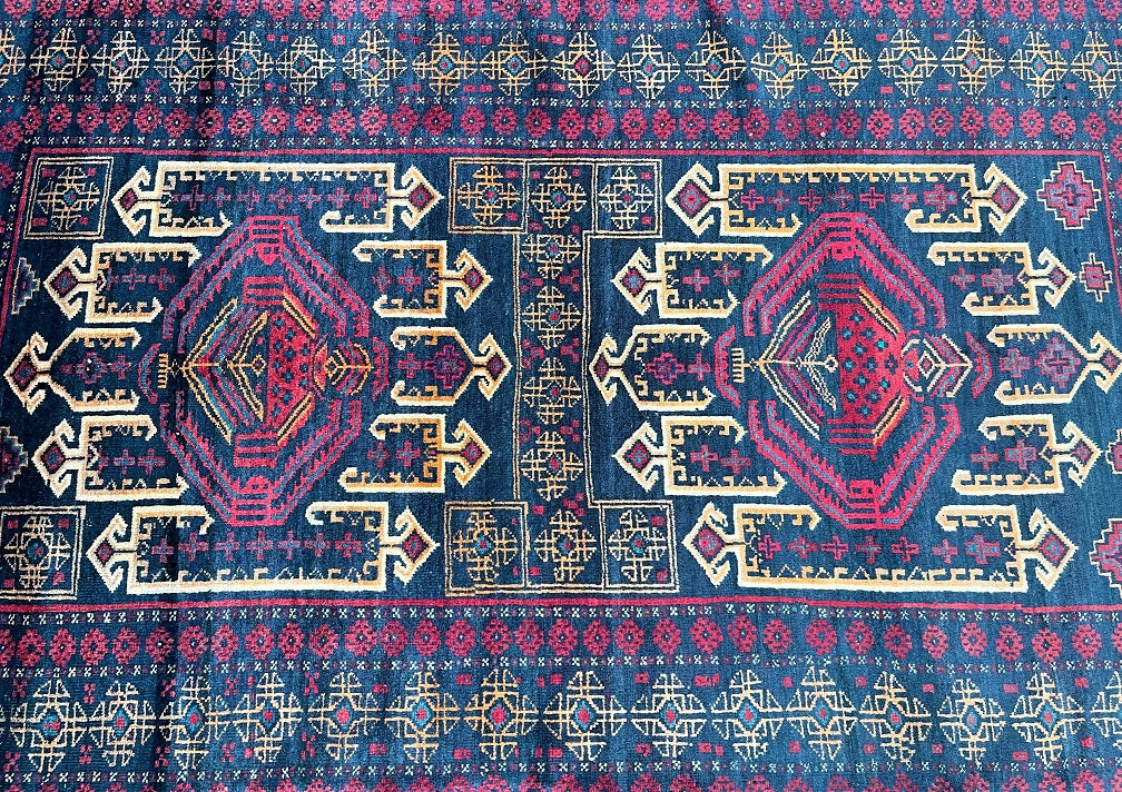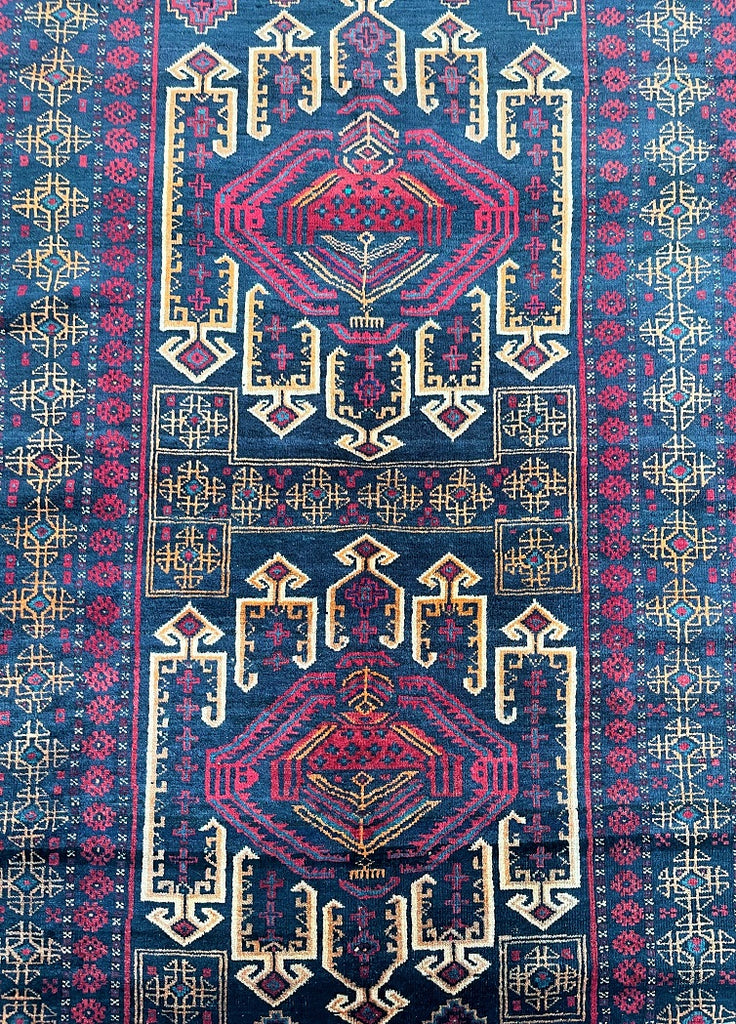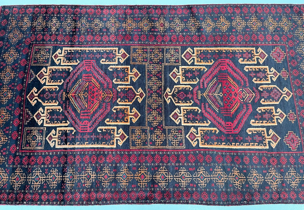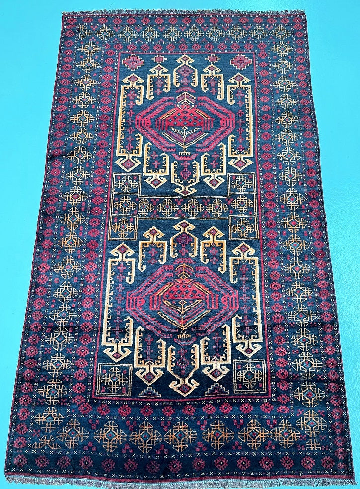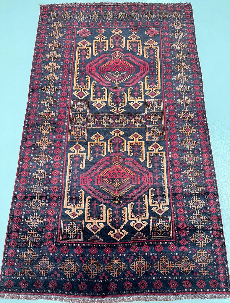 Hand-woven in Afghanistan by nomadic Balouchi weavers, this carpet carries the essence of Afghan craftsmanship and cultural heritage. With dimensions of 182 x 110 cm, it is perfectly sized for various purposes, whether as a decorative carpet or a functional runner.