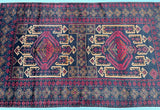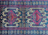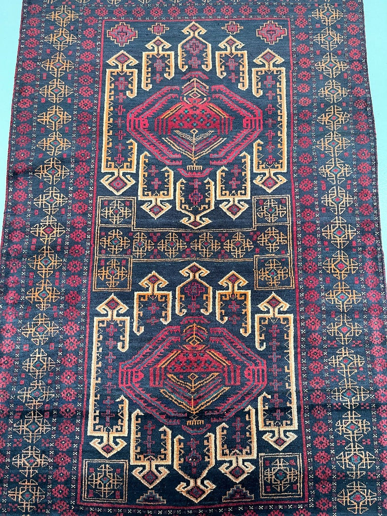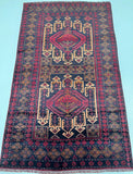Vintage Afghan Balouchi Carpet, a versatile piece that can be used as both a carpet and a short runner. Crafted with pure hand-spun wool on wool construction, this carpet guarantees exceptional quality and longevity. Its deep indigo blue, black, red, beige, and orange tones are dyed using traditional methods, adding a touch of authenticity and charm.