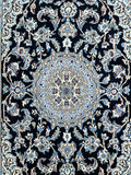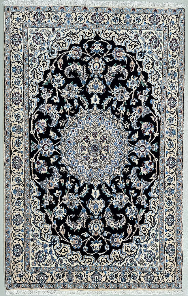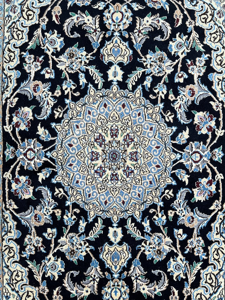 Superb Coffee Table Size Genuine Hand Knotted Persian Nain Carpet. Above All It Has A Lamb’s Wool Pile On Cotton Base. Indigo Blue, Beige, Burgundy, Green, Pink And Aqua Tones Dyed Using Traditional Methods.