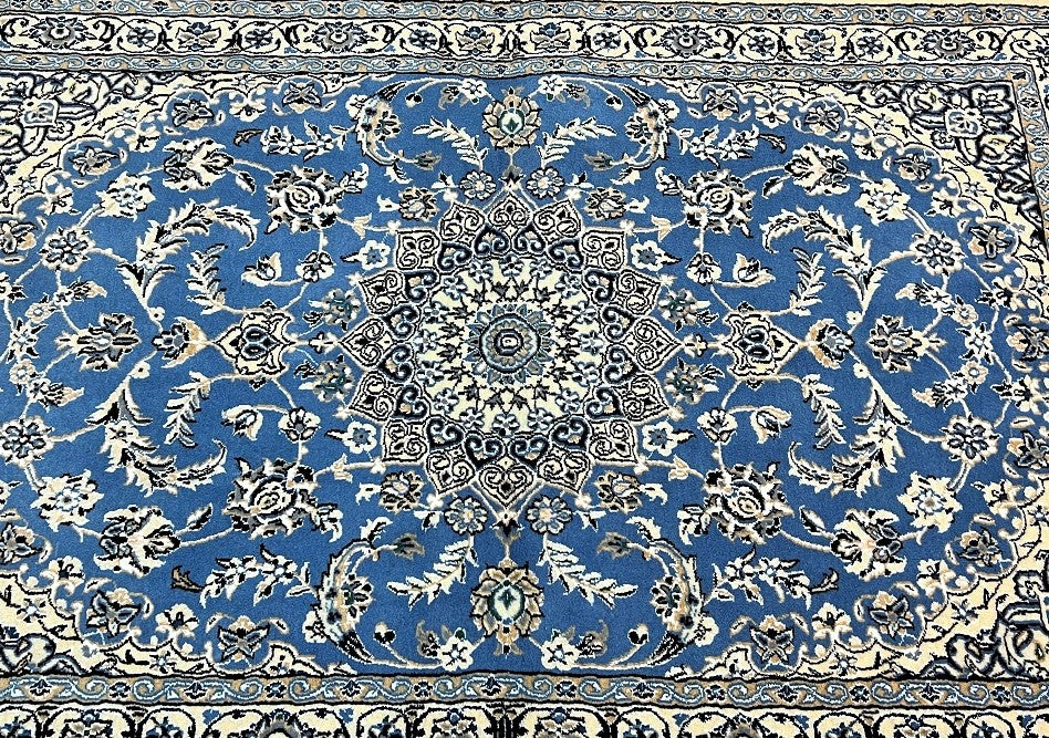 Superb Authentic Hand Knotted Persian Nain Rug. Above All This Is A Good Quality Nain Rug That Is Woven On A Fine 9la Base. Never The Less It Has a Lamb’s Wool Pile on Cotton Base. French Blue, Beige With Touch Of Indigo Blue/Black Tone Dyed Using Traditional Methods.