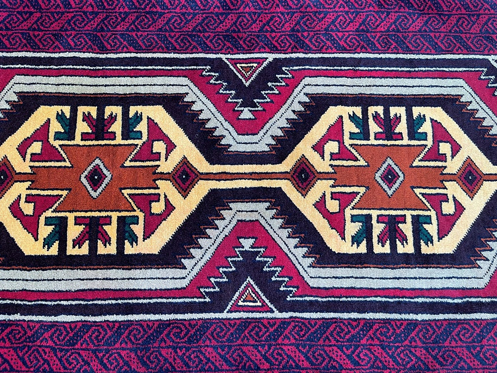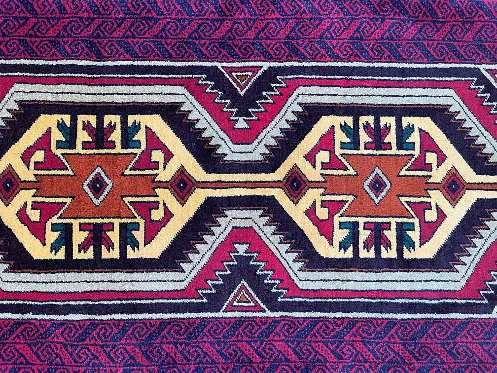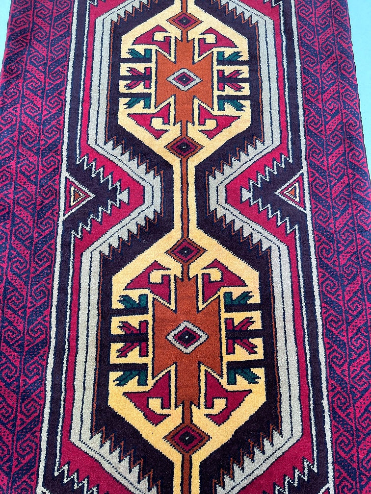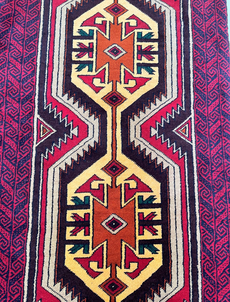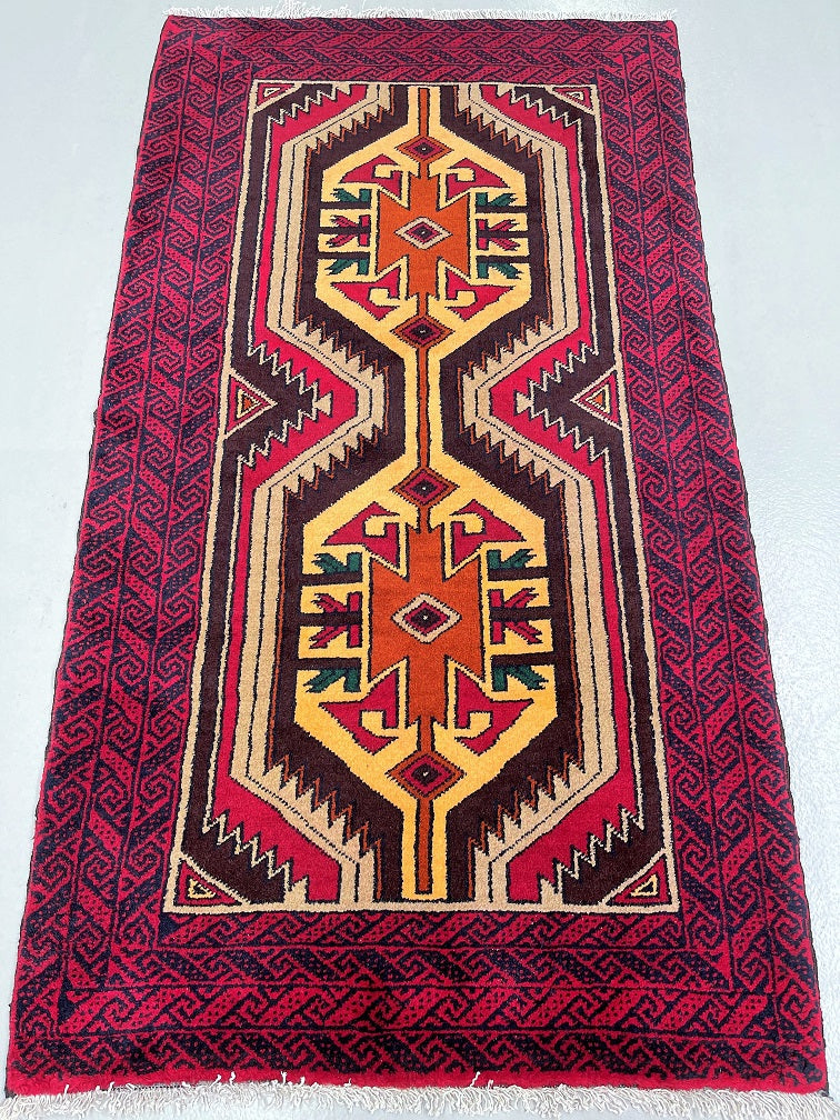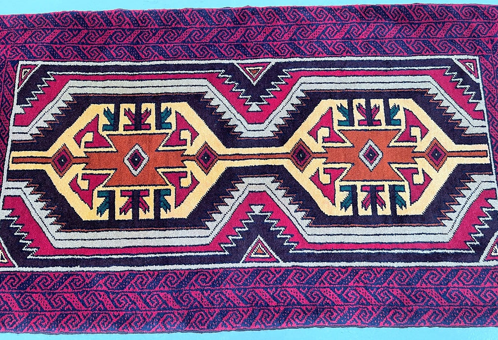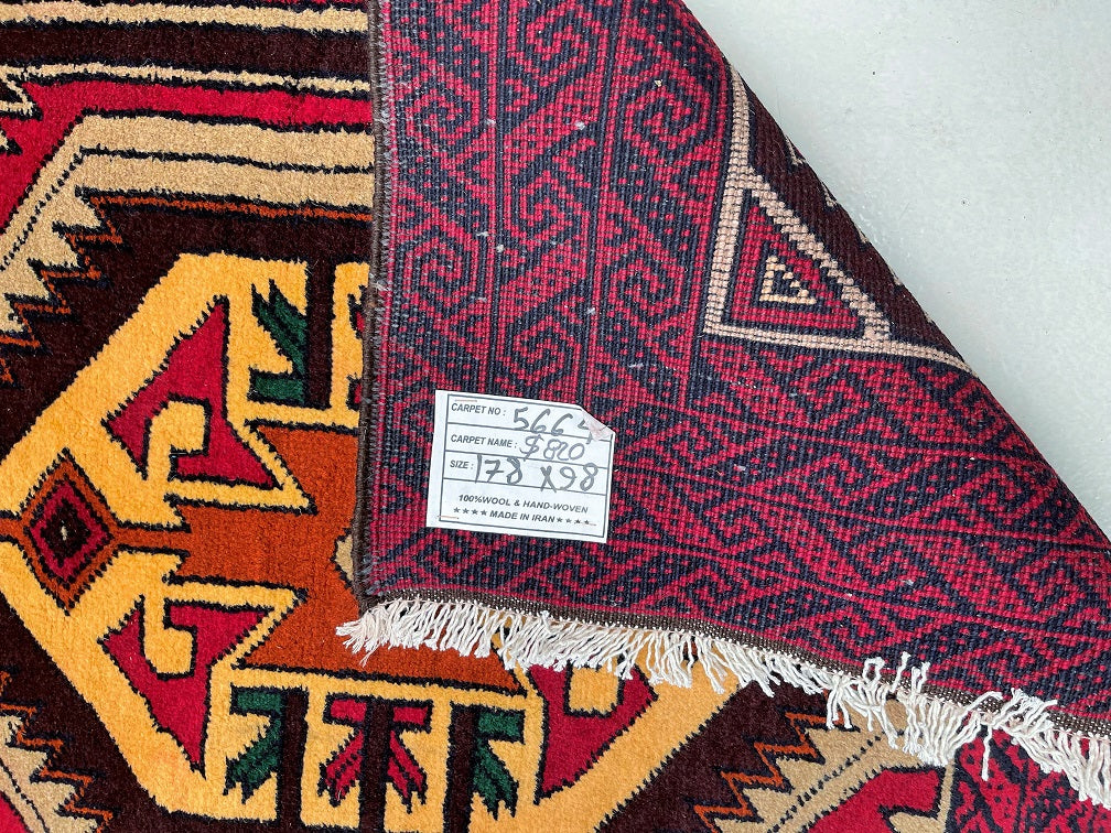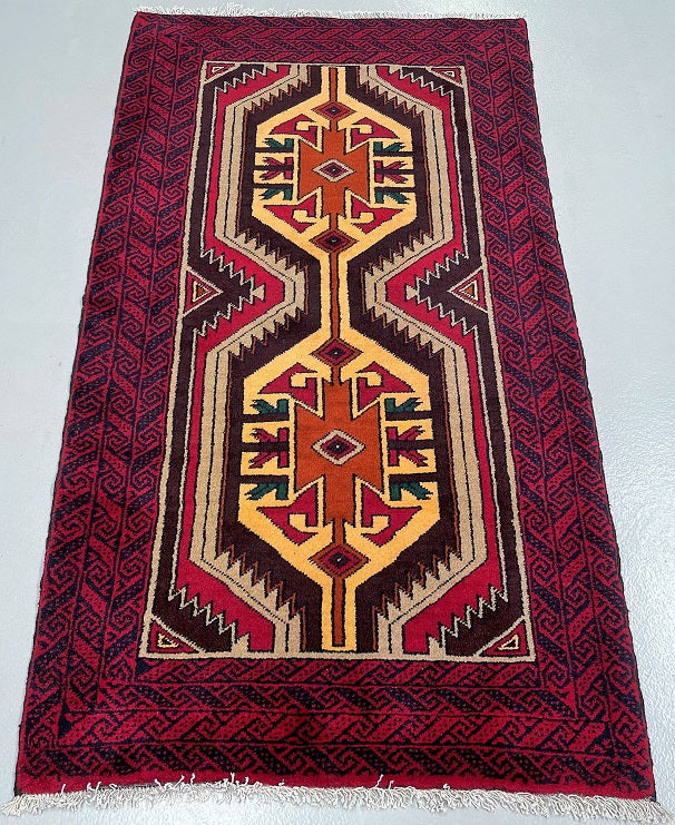 Dense Quality Coffee Table Size Handmade Persian Balouchi Rug. It Has A Pure Hand Spun Wool Pile On Cotton Base. Red, Beige, Blue, Yellow and Brown Colors Dyed Using Traditional Methods.