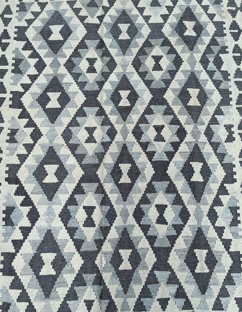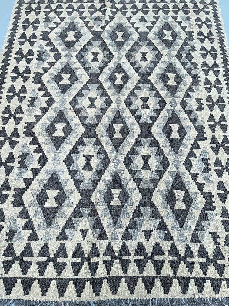 Coffee Table Size Nomadic Hand Woven Afghan Kyber Kilim Rug. Above All It Is A Very Versatile Size. It Also Has A Pure Hand Spun Wool Pile On Wool Base. Neutral Beige, Grey And Brown Tone Dyed Using Traditional Methods.