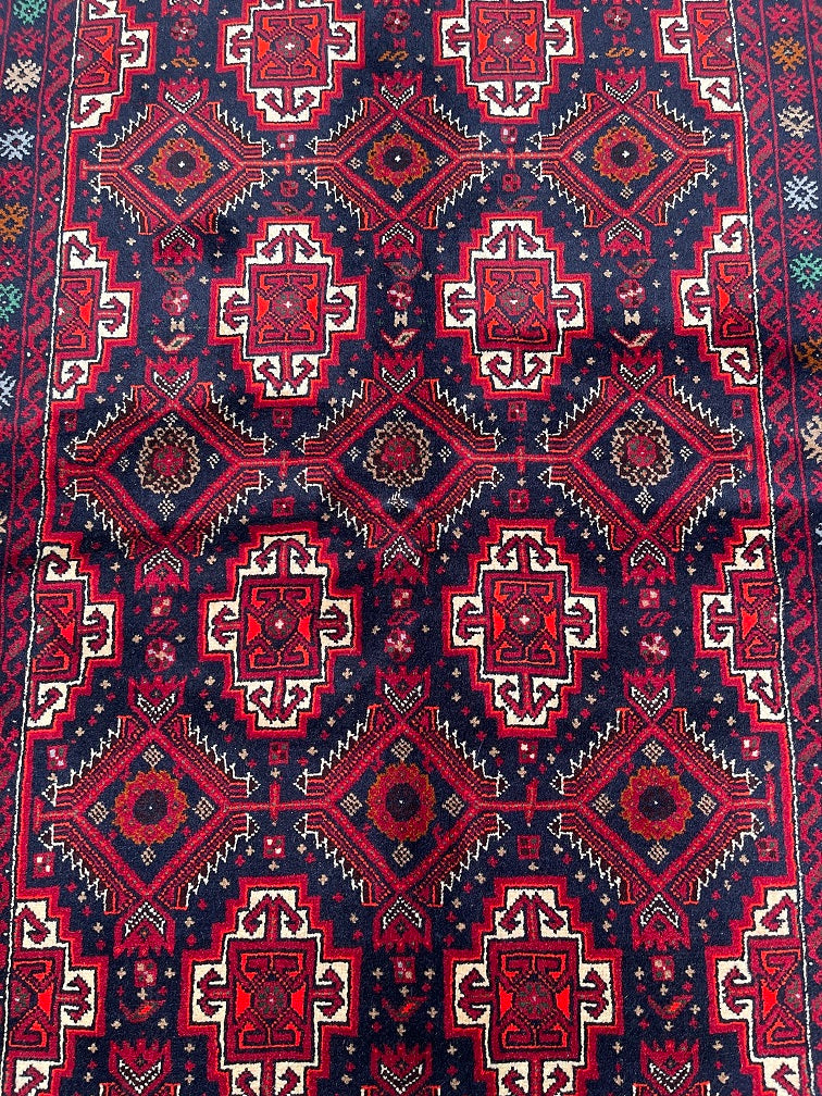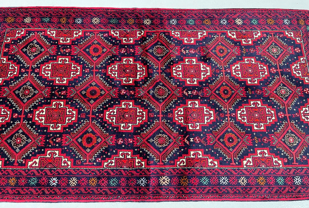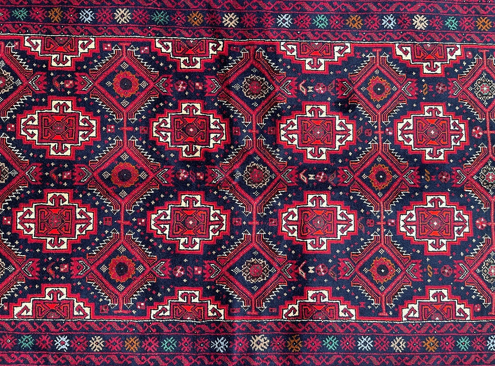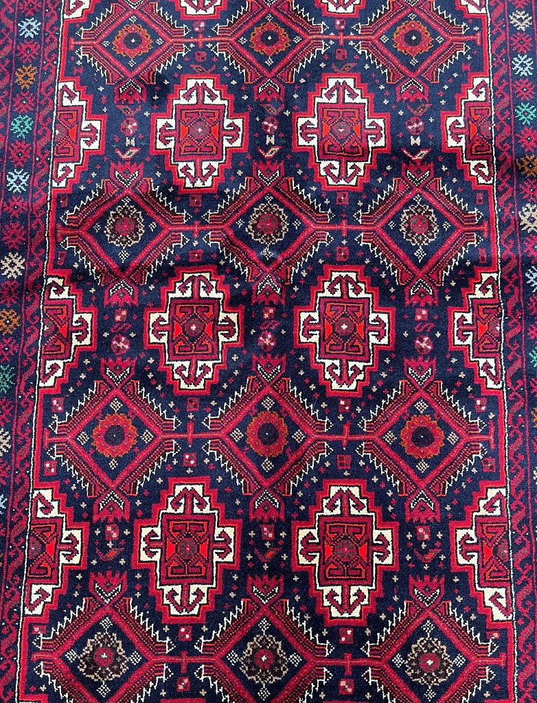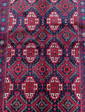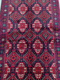 Durable Authentic Handmade Nomadic Persian Balouchi Rug Which Also Can Be Used As A Short Runner. It Has A Pure Hand Spun Wool Pile On Cotton Base. Indigo Blue, Maroon/Red, Orange, Green, Beige And Gold Tone Dyed Using Traditional Methods.