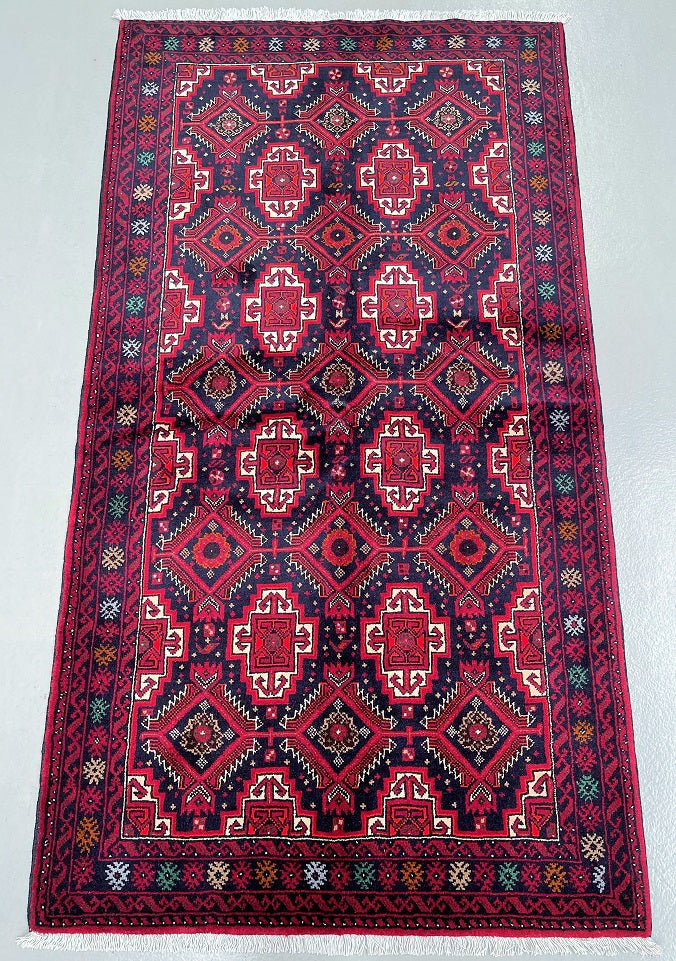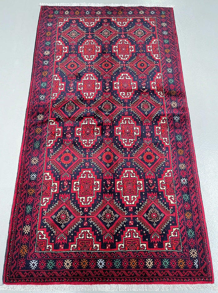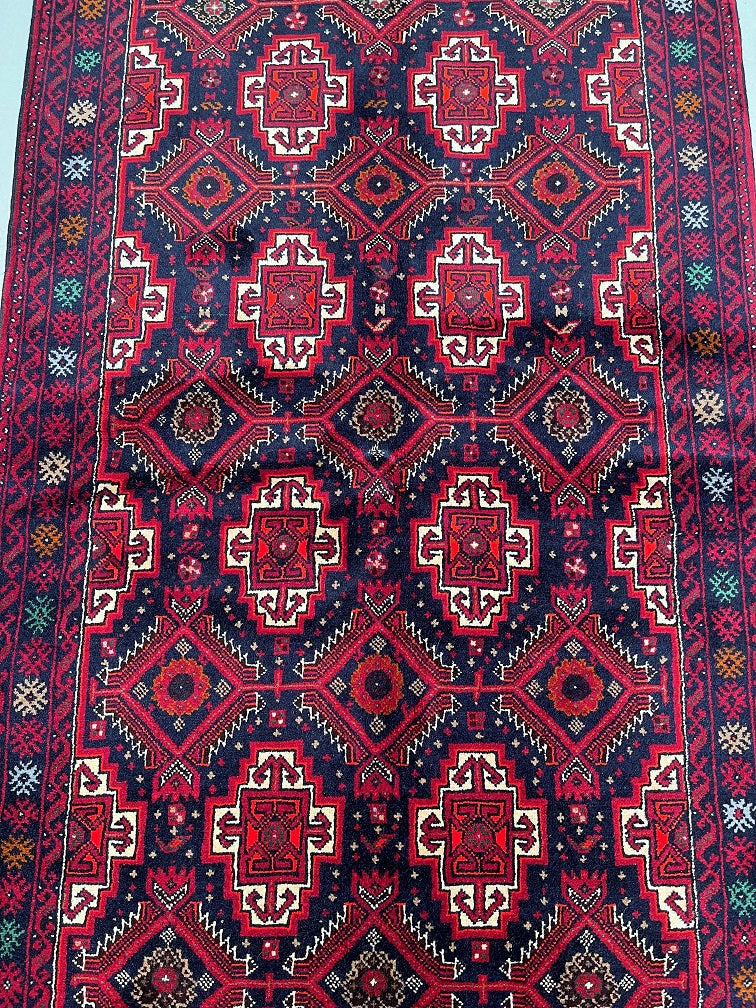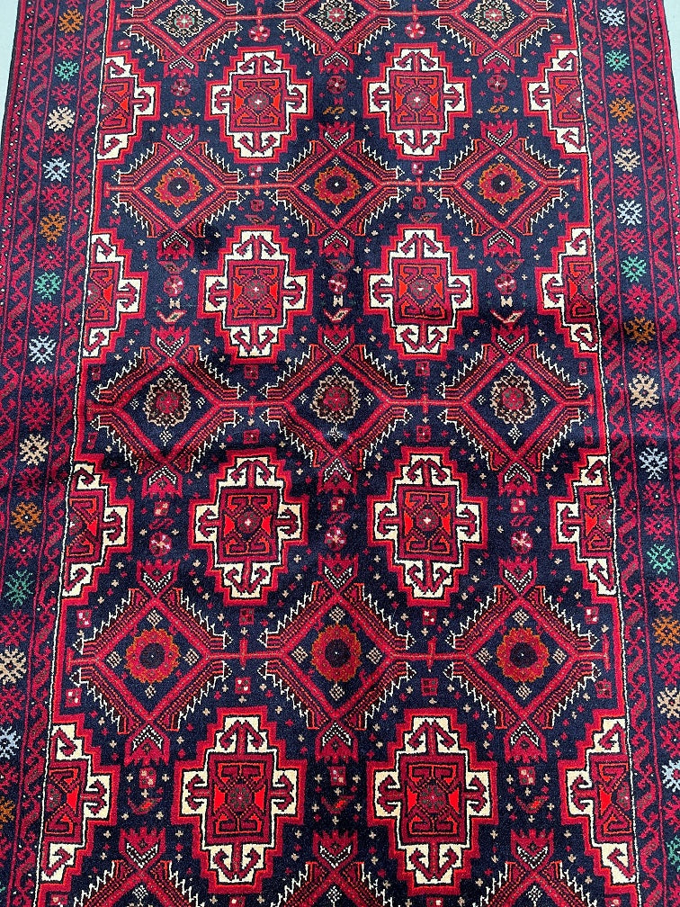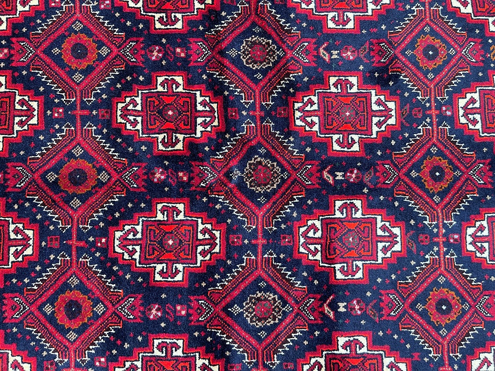 Durable Authentic Handmade Nomadic Persian Balouchi Rug Which Also Can Be Used As A Short Runner. It Has A Pure Hand Spun Wool Pile On Cotton Base. Indigo Blue, Maroon/Red, Orange, Green, Beige And Gold Tone Dyed Using Traditional Methods.