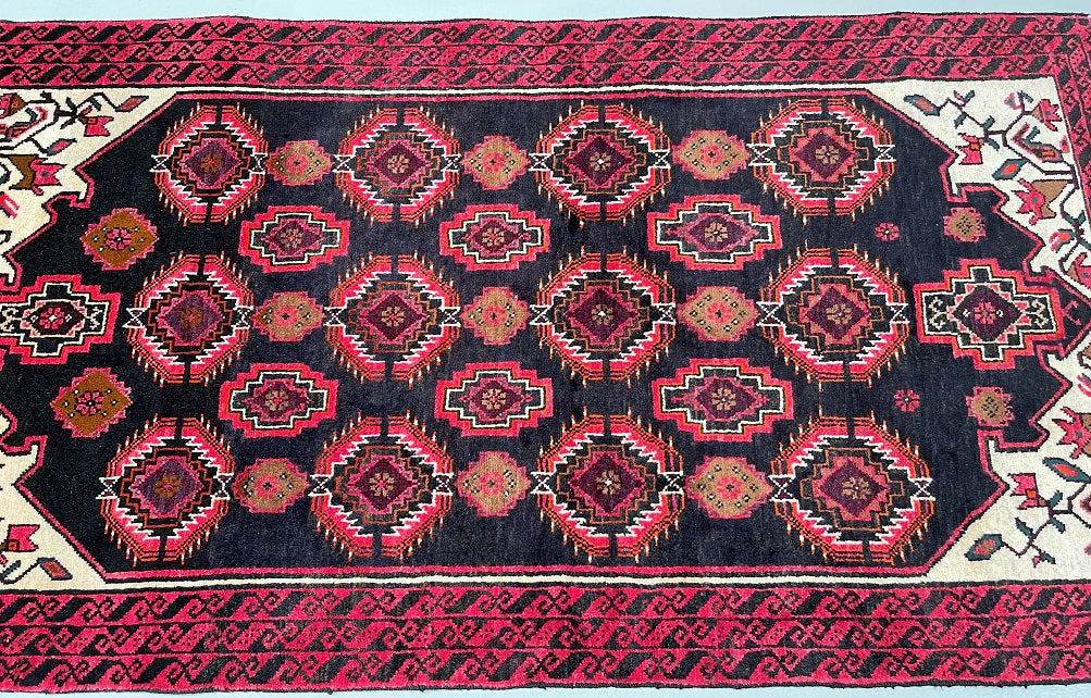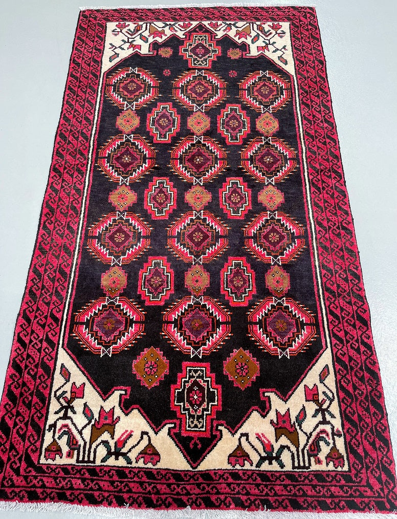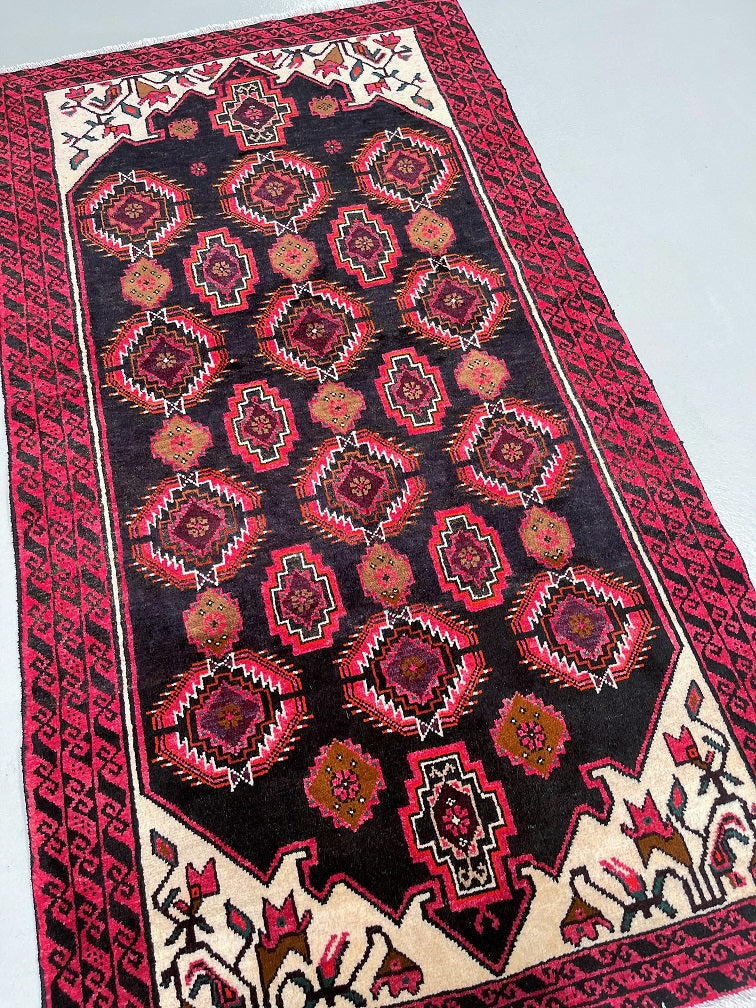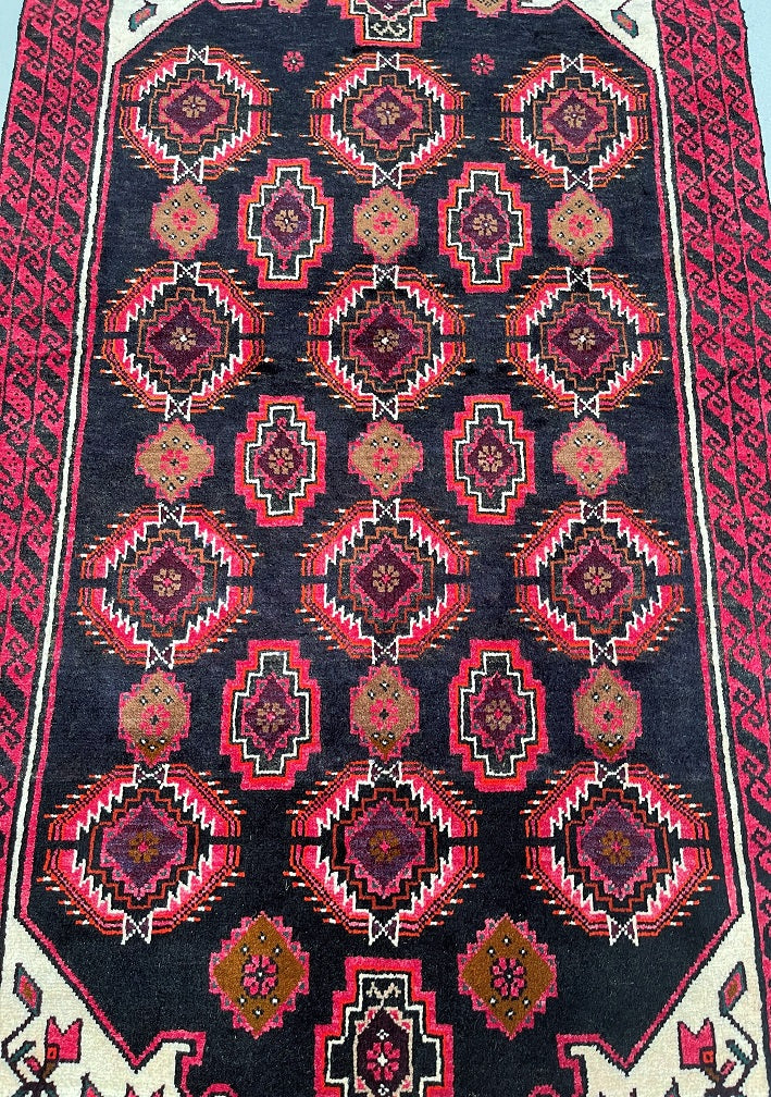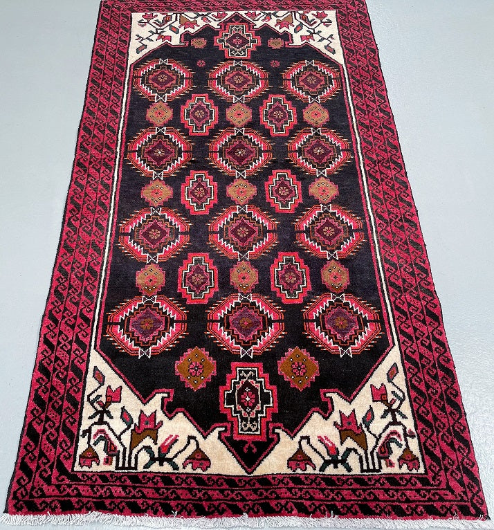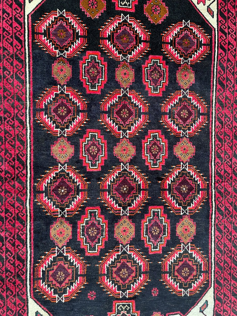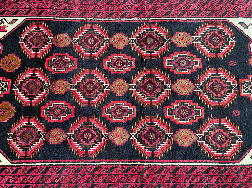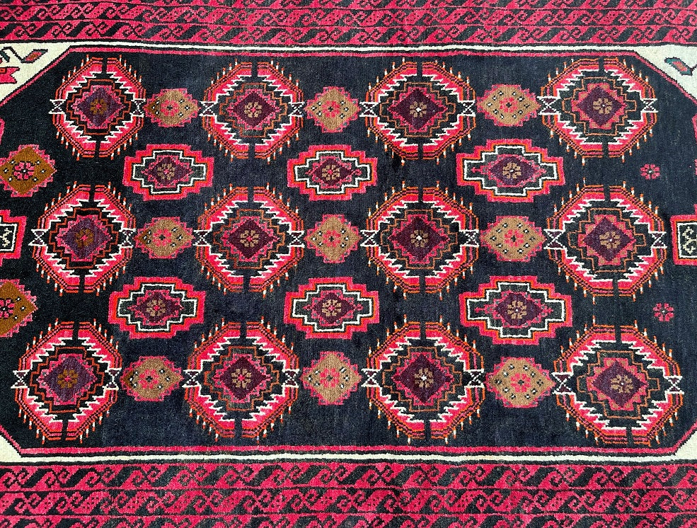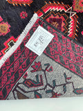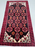 Collectible Coffee Table Size Authentic Handmade Persian Balouchi Rug Which Also Can Be Used As A Runner. It Also Has A Pure Hand Spun Wool Pile On Cotton Base. Black, Pinkish Red, Mustard and Beige Tone Dyed Using Traditional Methods.