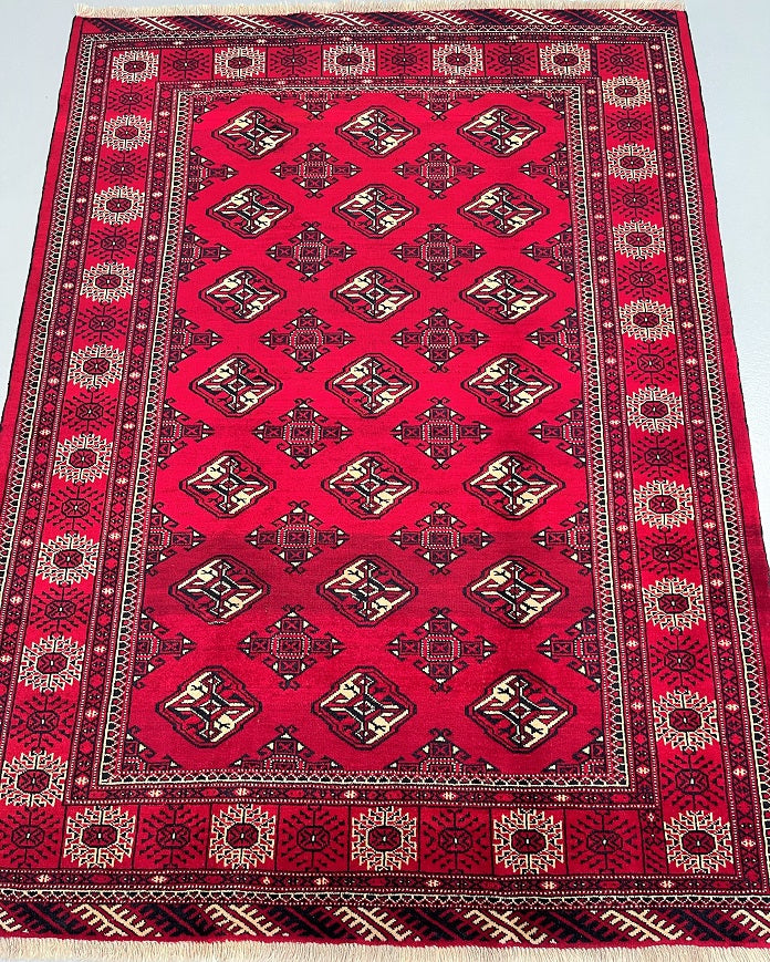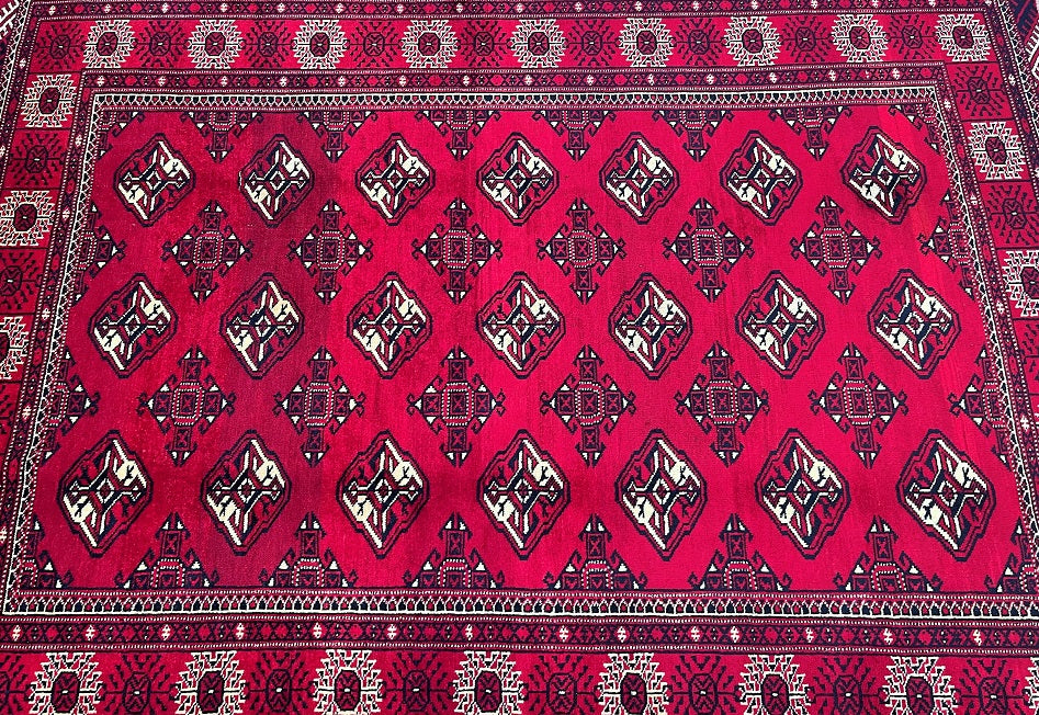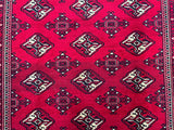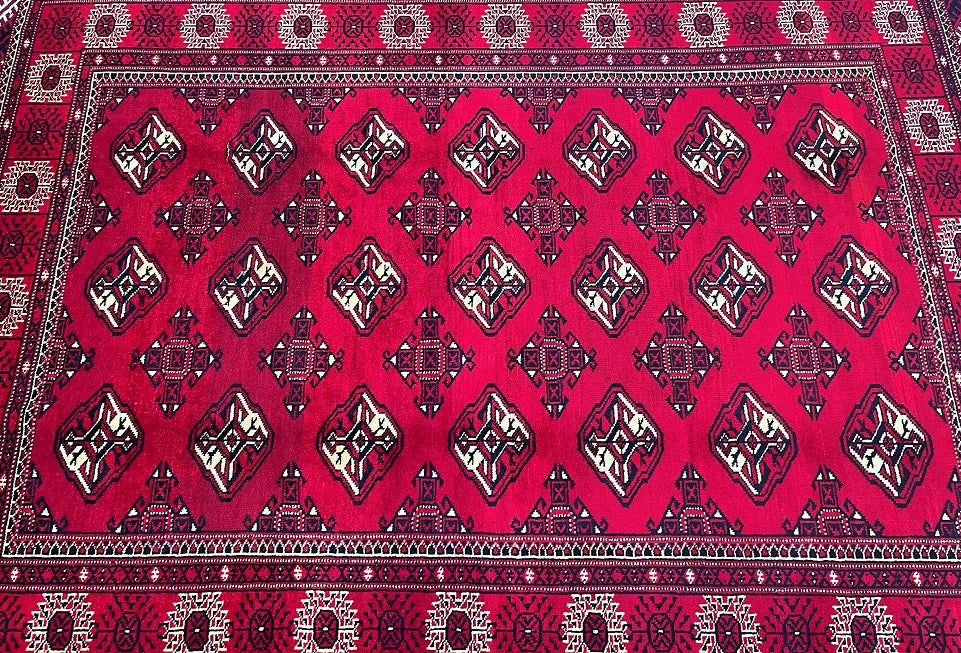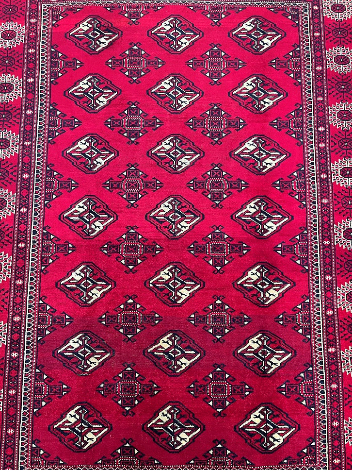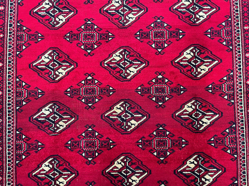 This is an authentic, handmade vintage Bokhara Persian Turkoman rug. One of its notable features is the color variation, which adds character to the rug. It has a pure hand-spun wool pile on a wool base. The rug showcases a vibrant red tone that has been dyed using traditional methods. It features an allover geometric design that is renowned as the Bokhara pattern. The rug exhibits fine workmanship, and it would have taken a weaver approximately 4 months to weave it. It was hand-woven in East Persia. The size of the rug is 210 x 135 cm, and its gallery replacement value is estimated at $2390.