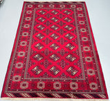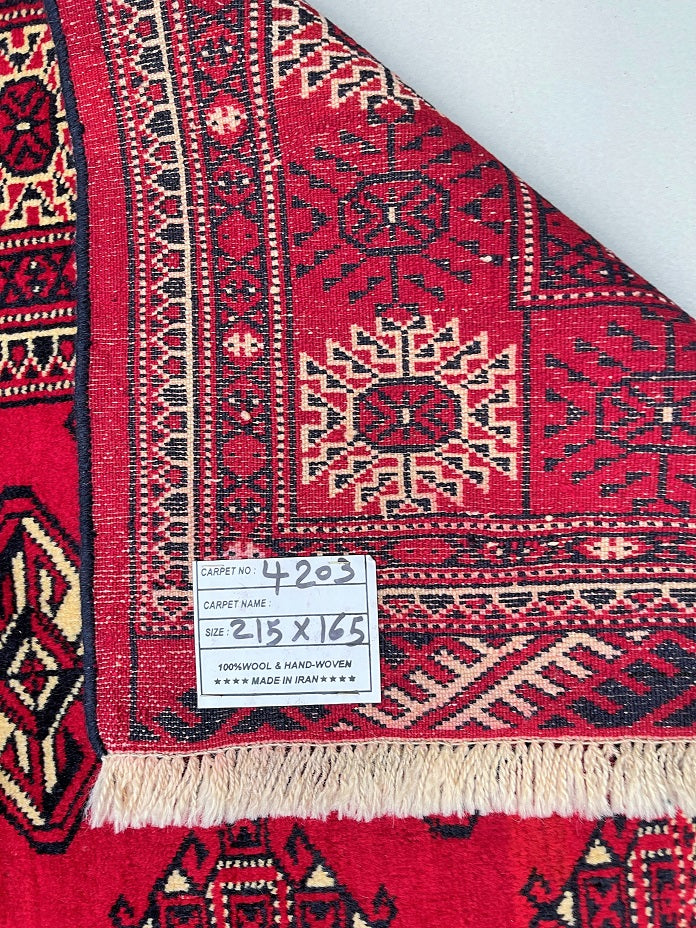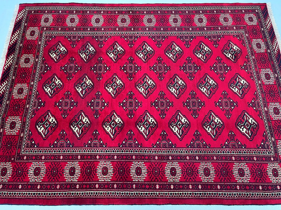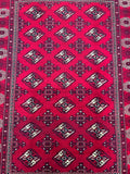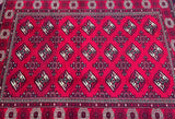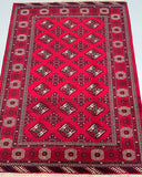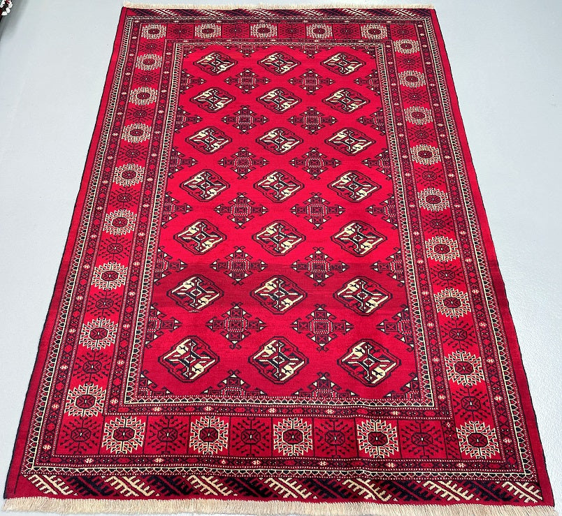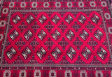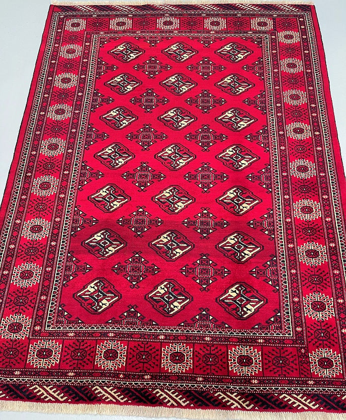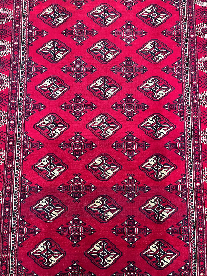 This is an authentic, handmade vintage Bokhara Persian Turkoman rug. One of its notable features is the color variation, which adds character to the rug. It has a pure hand-spun wool pile on a wool base. The rug showcases a vibrant red tone that has been dyed using traditional methods. It features an allover geometric design that is renowned as the Bokhara pattern. The rug exhibits fine workmanship, and it would have taken a weaver approximately 4 months to weave it. It was hand-woven in East Persia. The size of the rug is 210 x 135 cm, and its gallery replacement value is estimated at $2390.