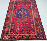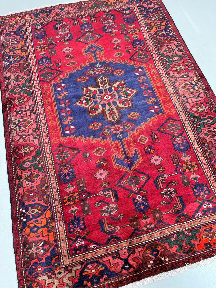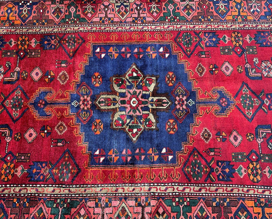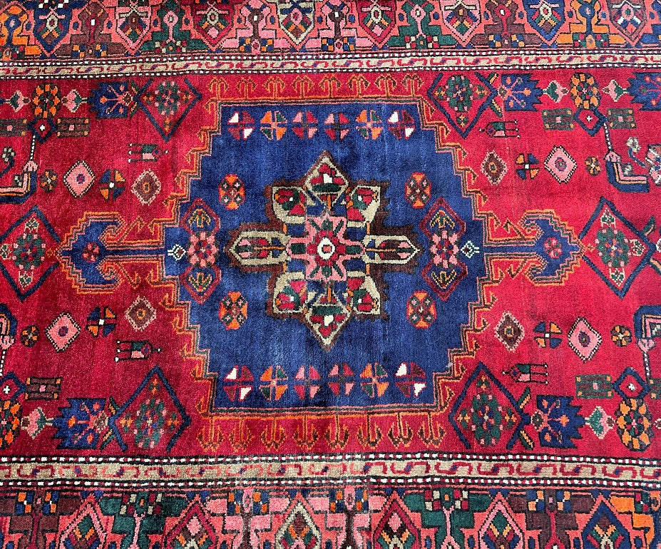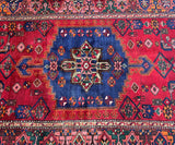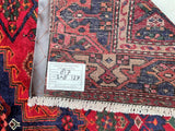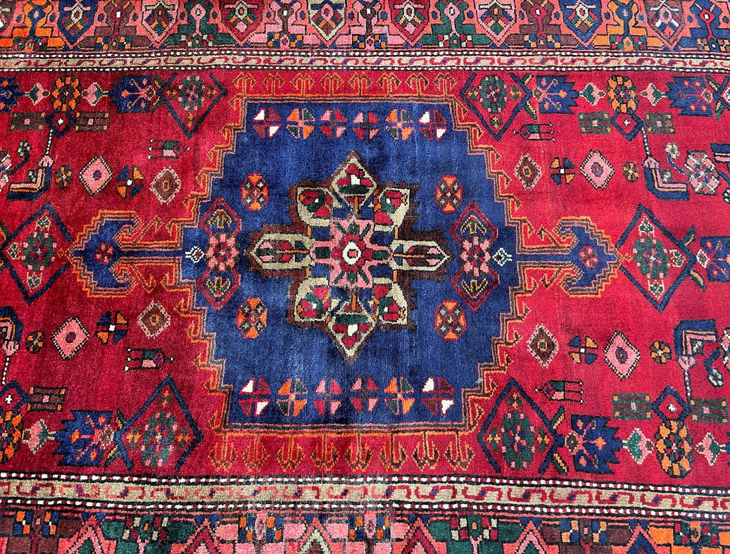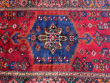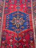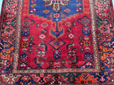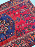 Coffee Table Size Authentic Handmade Village Persian Khamseh Rug. Above All It Is A Hard Wearing Rug. Pure Hand Spun Wool Pile On Cotton Base. It Also Has a Red, Pink, Brown, Green, Blue And Orange Tone Dyed Using Traditional Methods.