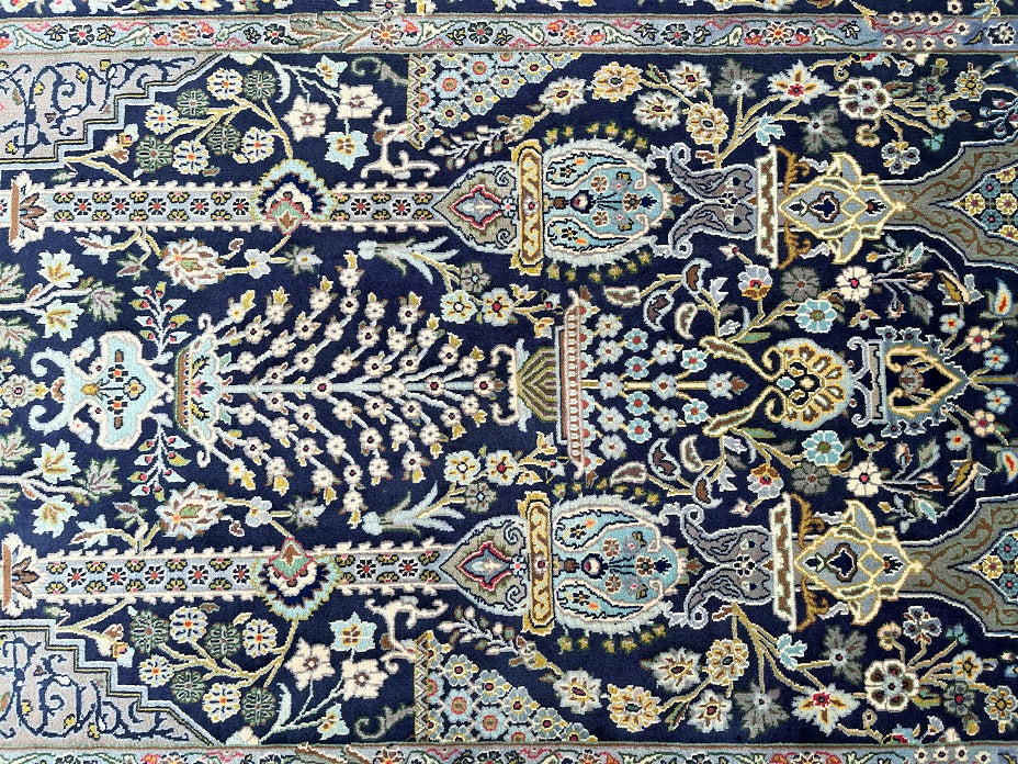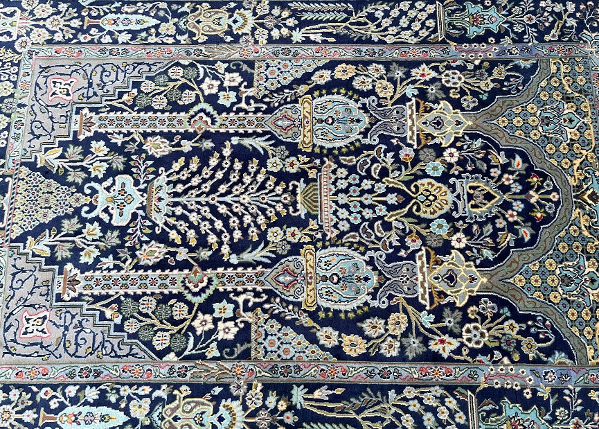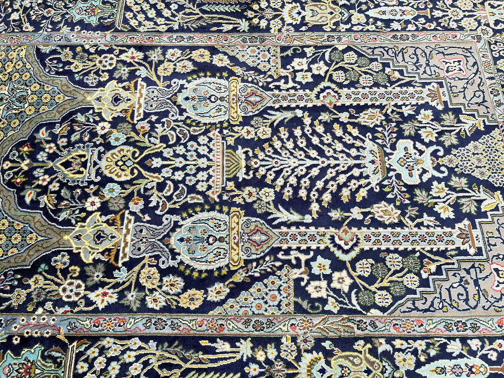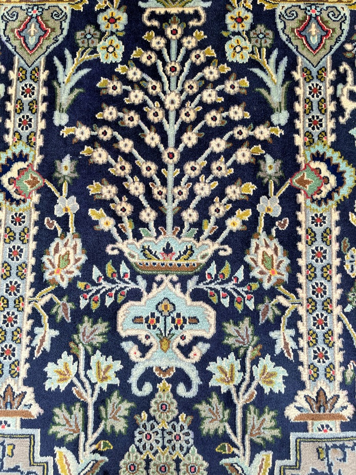 Rare and collectable authentic Handmade Tree Of Life Persian Kashan rug. It has a pure lamb’s wool pile (Kork) on cotton base. Indigo blue, beige, green and light blue tone dyed using traditional methods. Superfine piece from city of Kashan.
