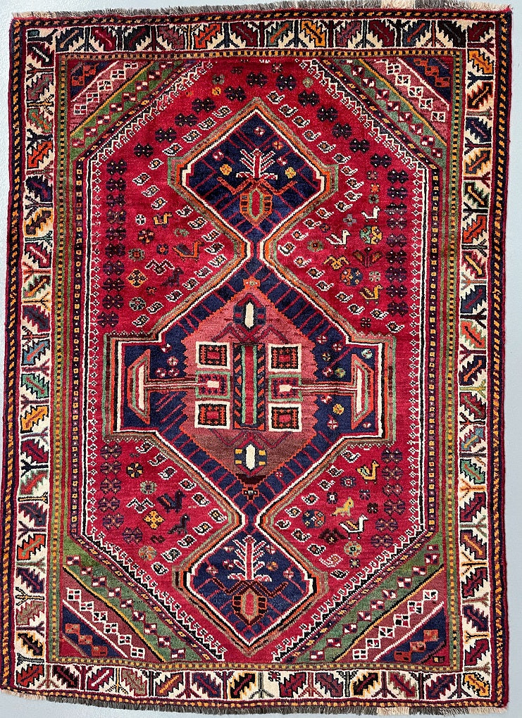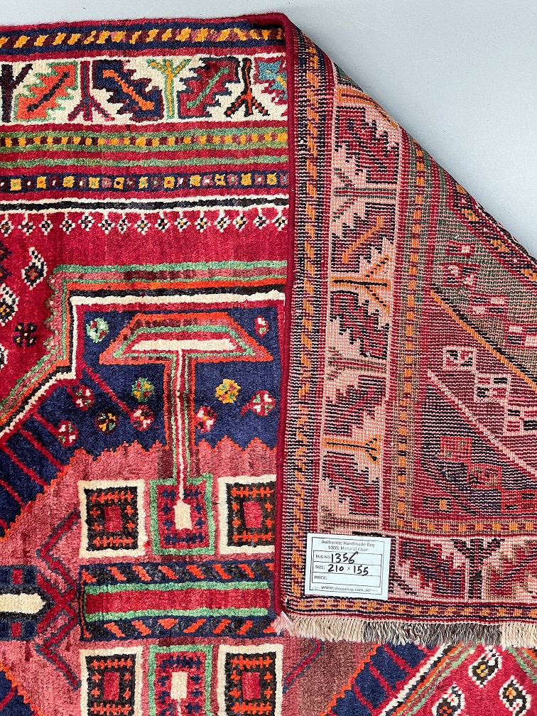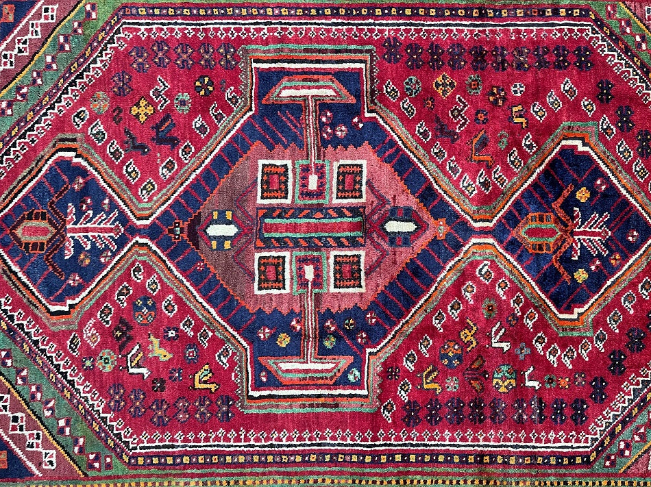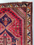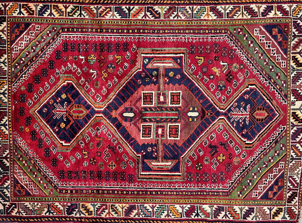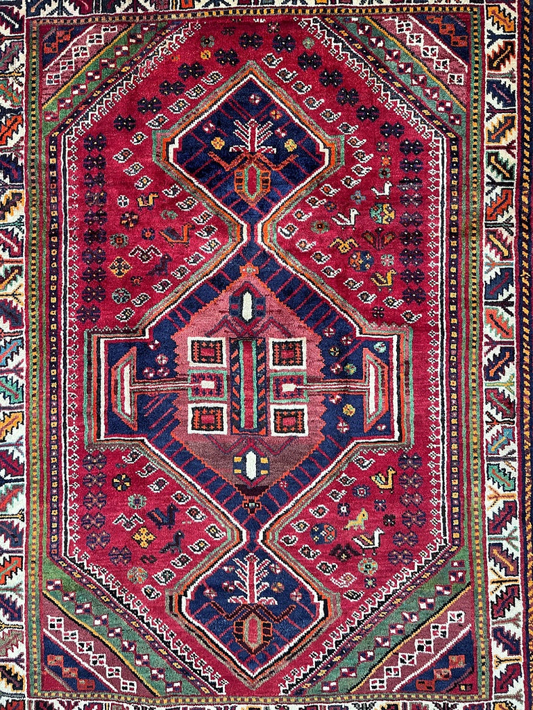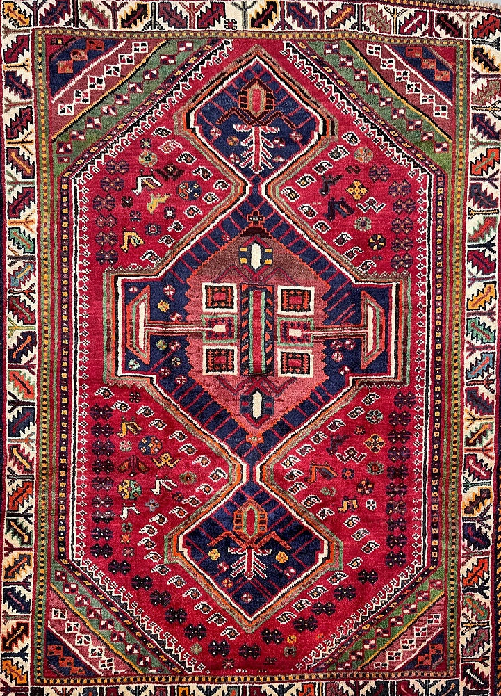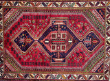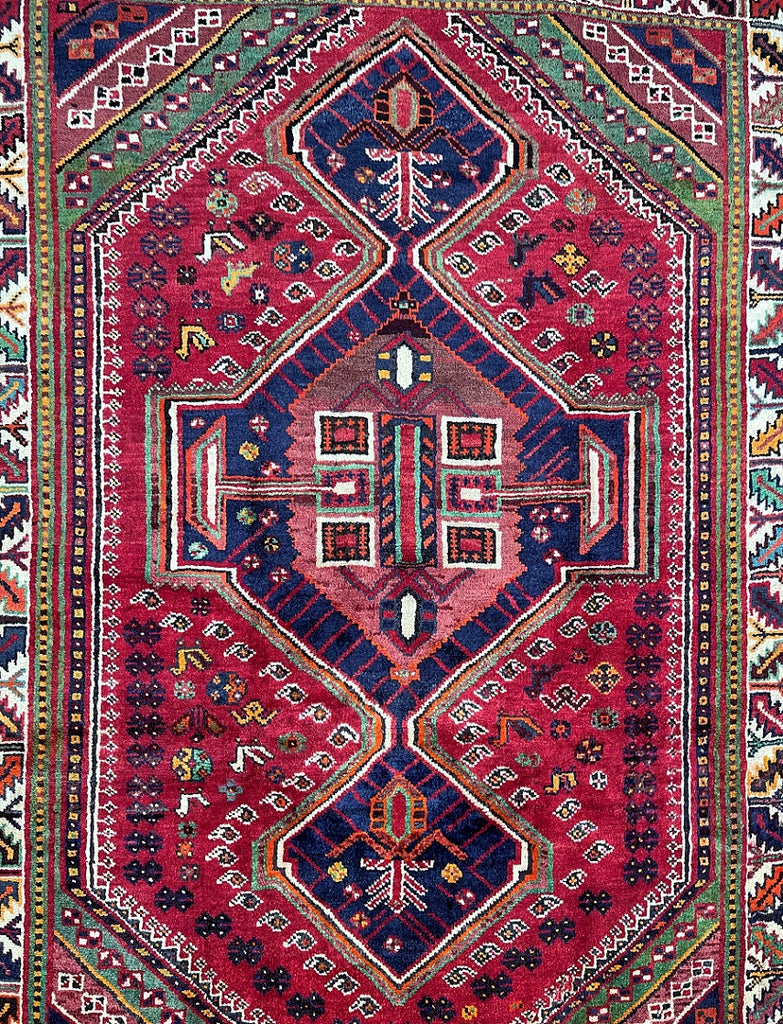 Unique Room Size Handmade Antique Persian Shiraz Rug Circa 1960’s. Above All This Is A Very Collectible Piece, Don’t Miss Out As It Will Sell Fast. It Has Pure Hand Spun Wool Pile On Wool Base. Rustic Red, Green, Yellow, Orange, Beige And Indigo Blue Tone Dyed Using Traditional Methods.