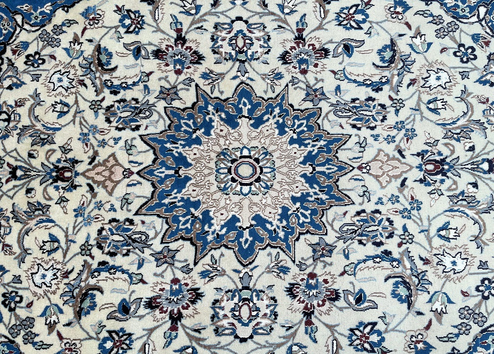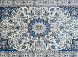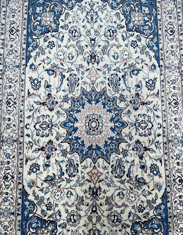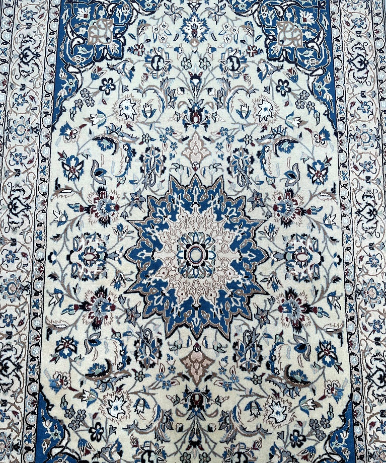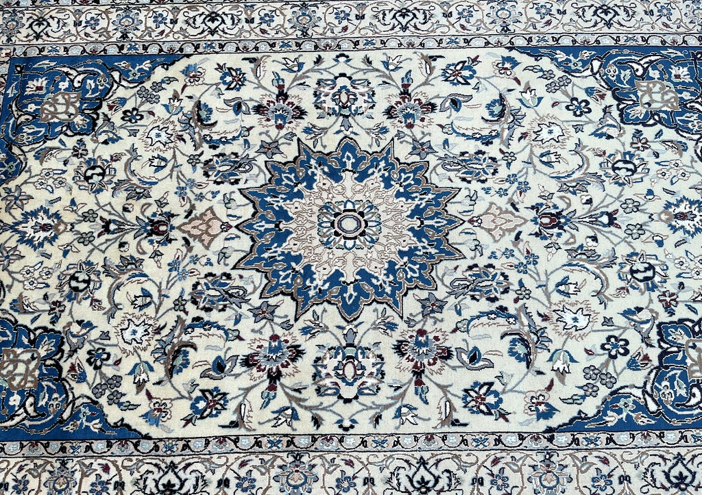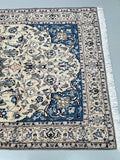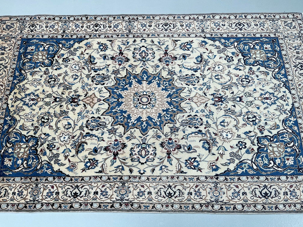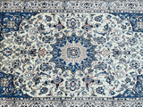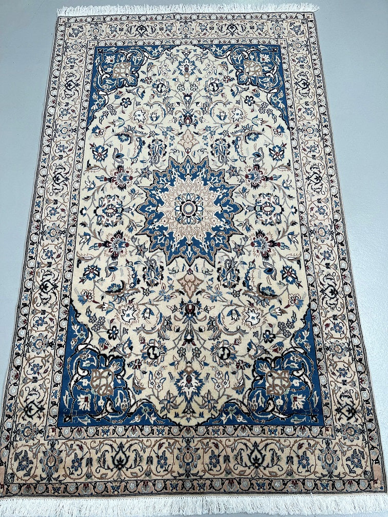 Gorgeous Vintage Persian Nain Rug, meticulously hand-knotted with utmost authenticity. This remarkable piece features a luxurious blend of lamb's wool with silk inlaid pile on a cotton base, ensuring both comfort and durability. The harmonious tones of beige, blue, black, burgundy, brown, and grey are achieved through traditional dyeing methods, adding depth and richness to the design. Originating from the renowned city of Nain, this rug showcases a stunning central medallion floral design, exemplifying the fine quality craftsmanship of the region. The intricate weaving process required approximately 4 months to complete, highlighting the dedication and skill of the weaver. Hand-woven in the famous city of Nain, located in central Persia, this rug measures 220 x 135 cm. Its gallery replacement value is estimated at $4900, reflecting its exceptional quality and artistic value.