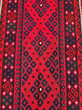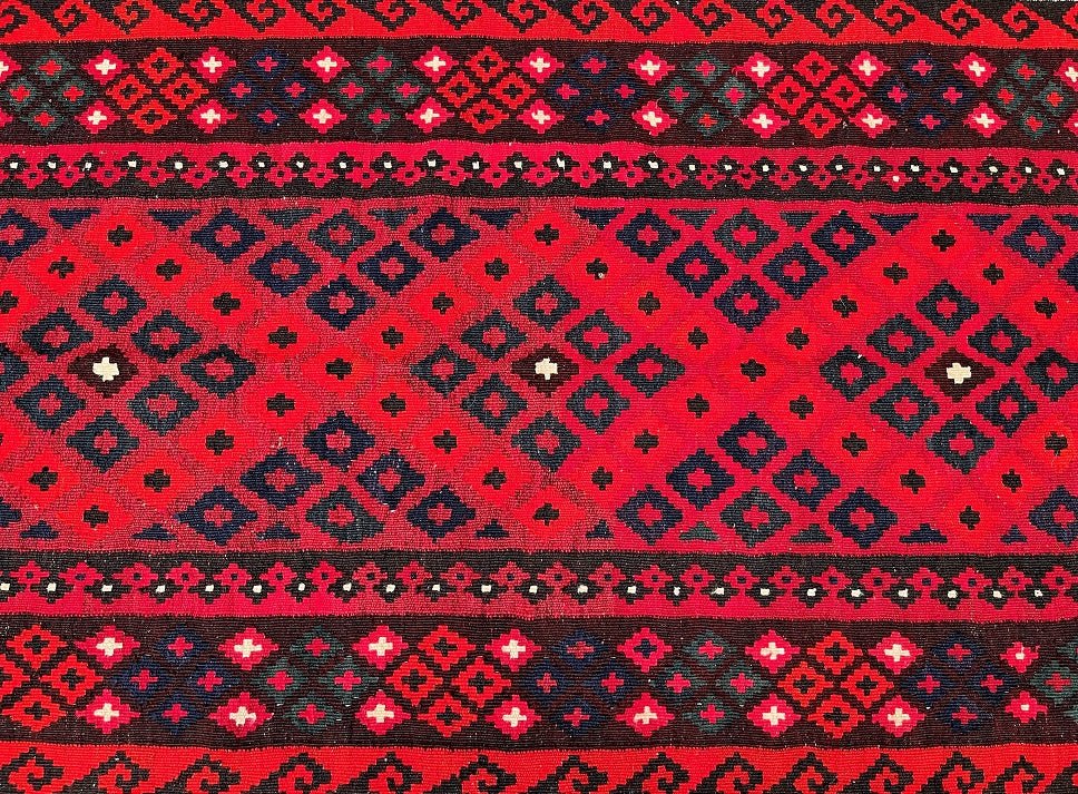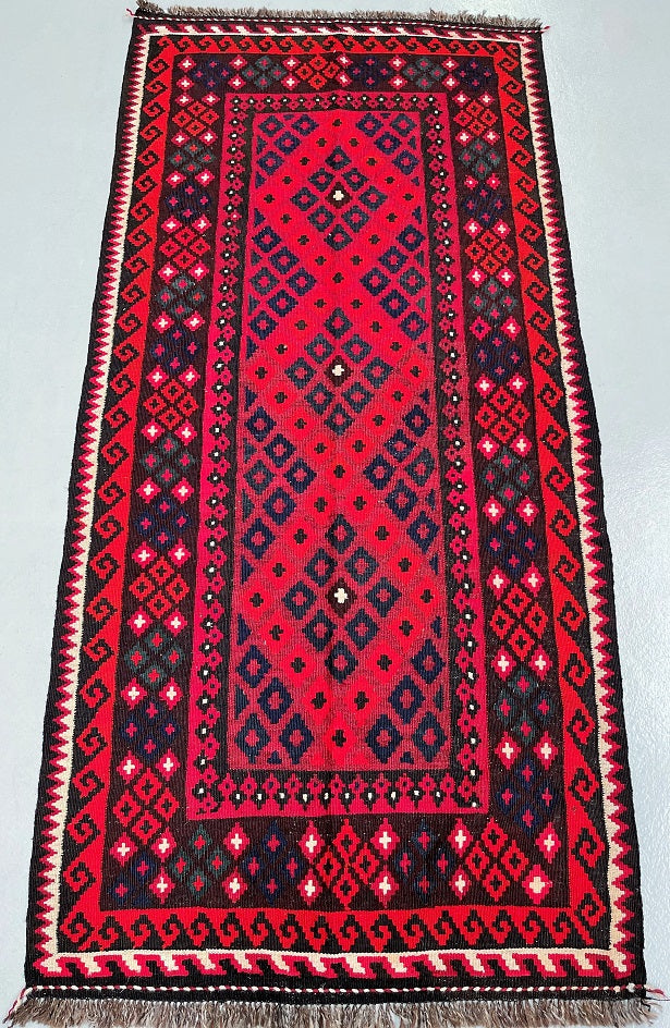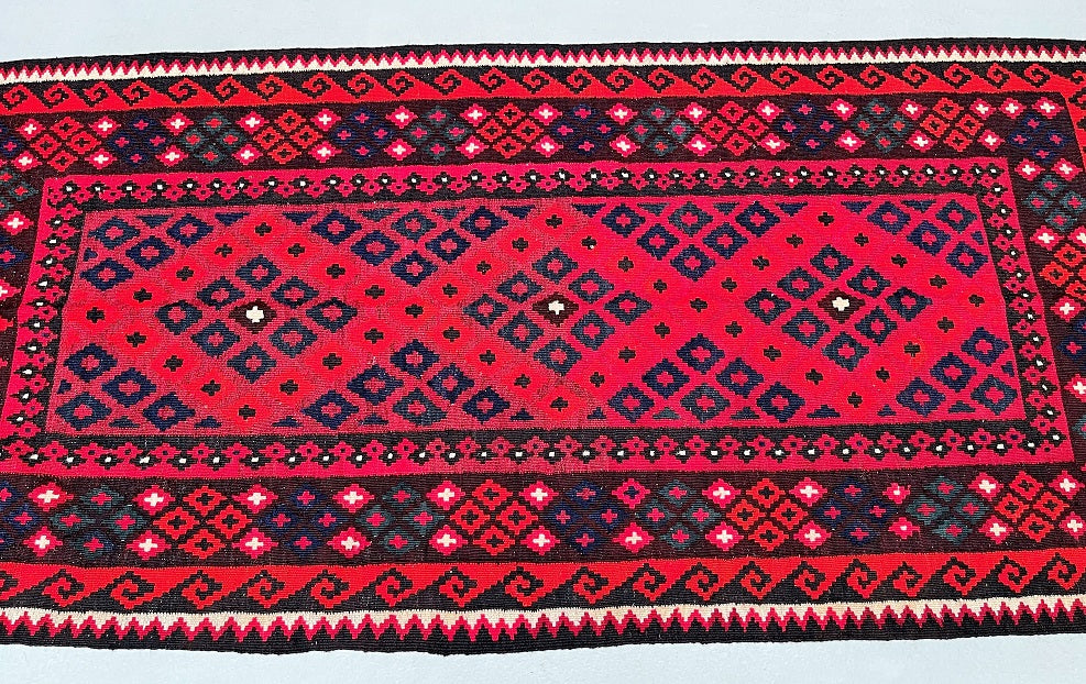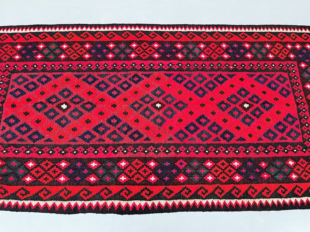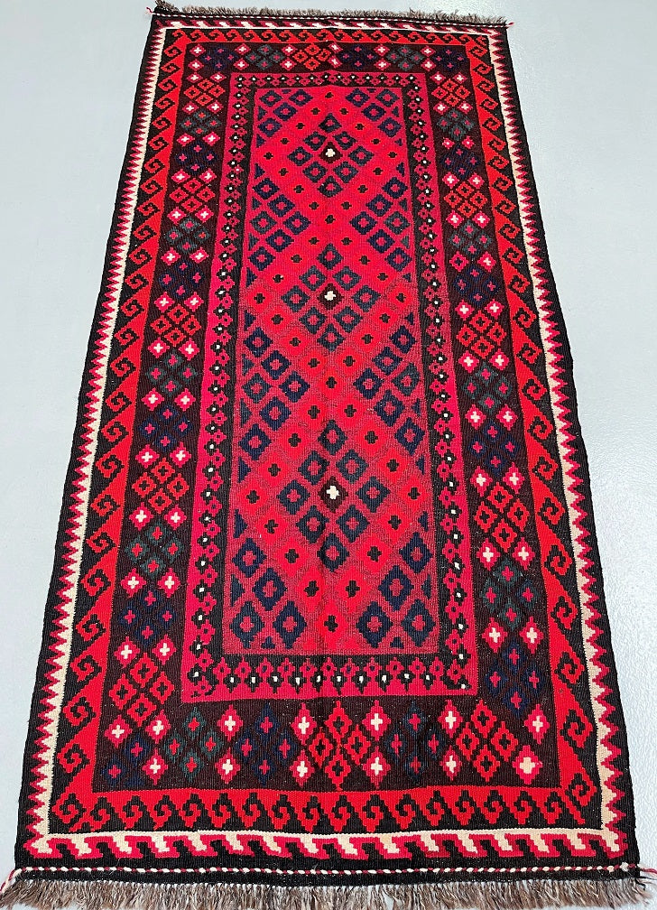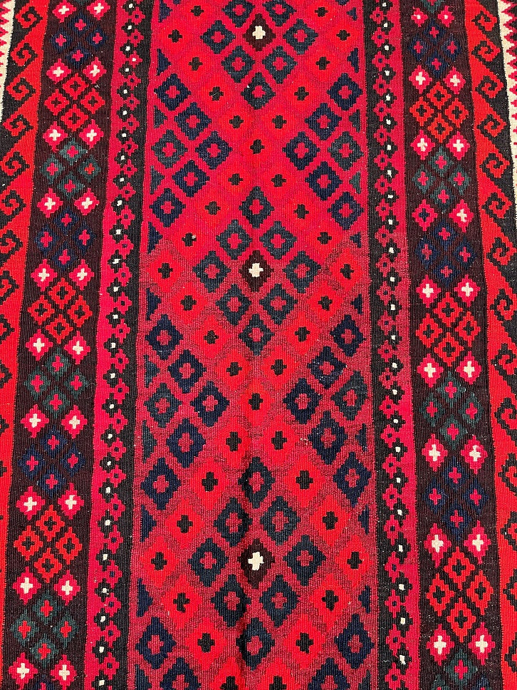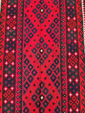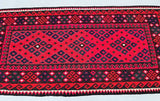 Authentic Hand Woven Afghan Maymaneh Kilim Rug. Above All It Is A Very Versatile Size Which Also Could Be Used As a Runner. It Also Has A Pure Hand Spun Wool Pile On Wool Base. Maroon/Red, Blue, Green, And Black Tone Dyed Using Traditional Methods.