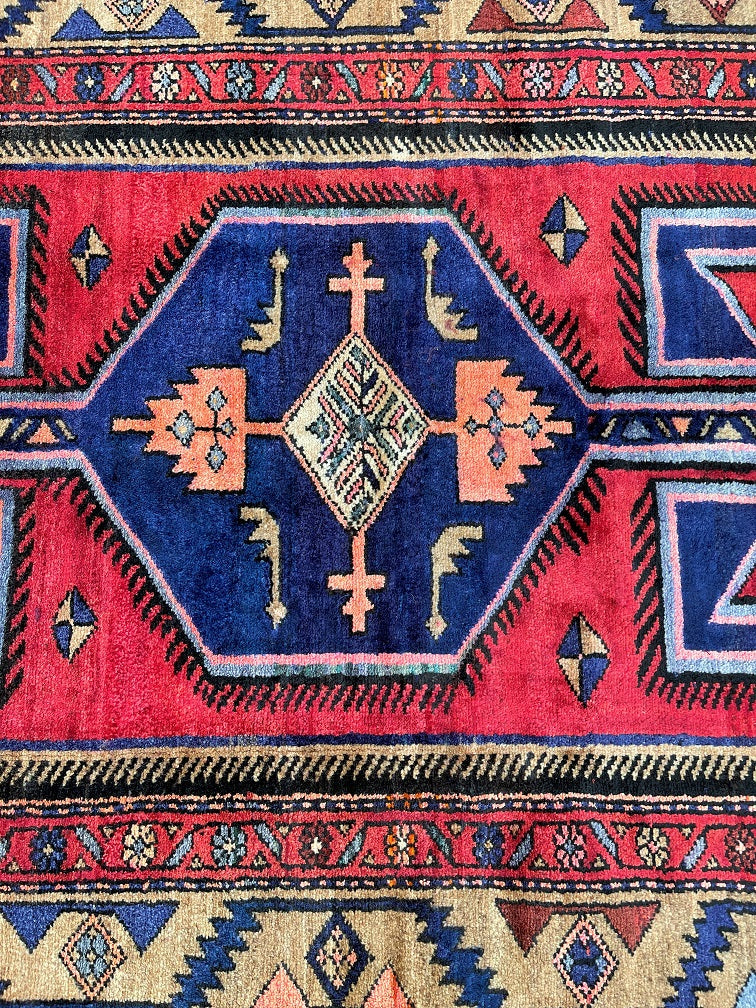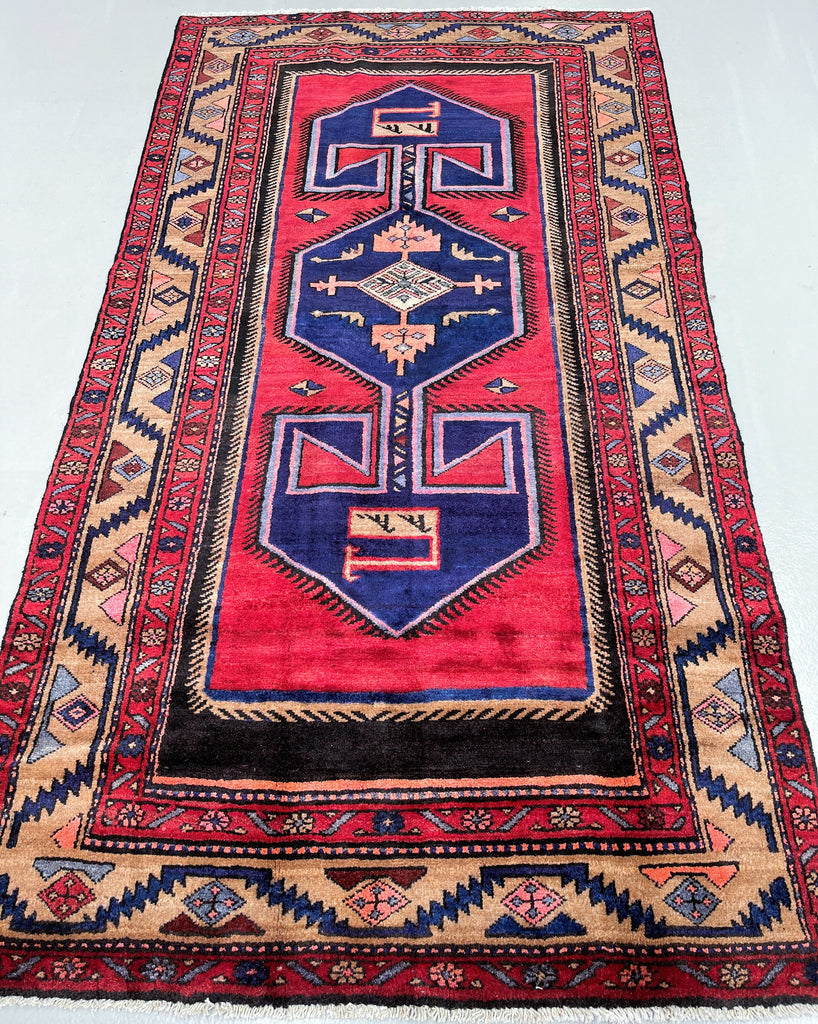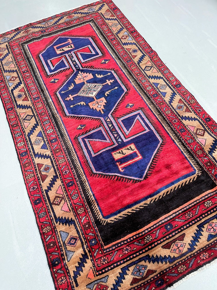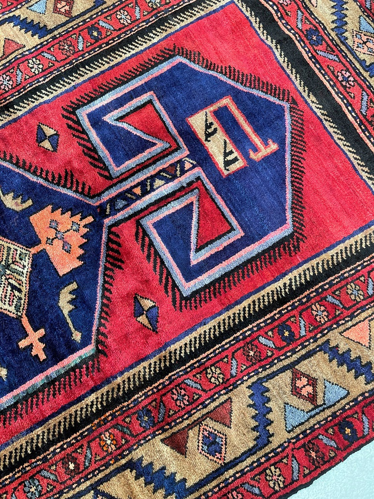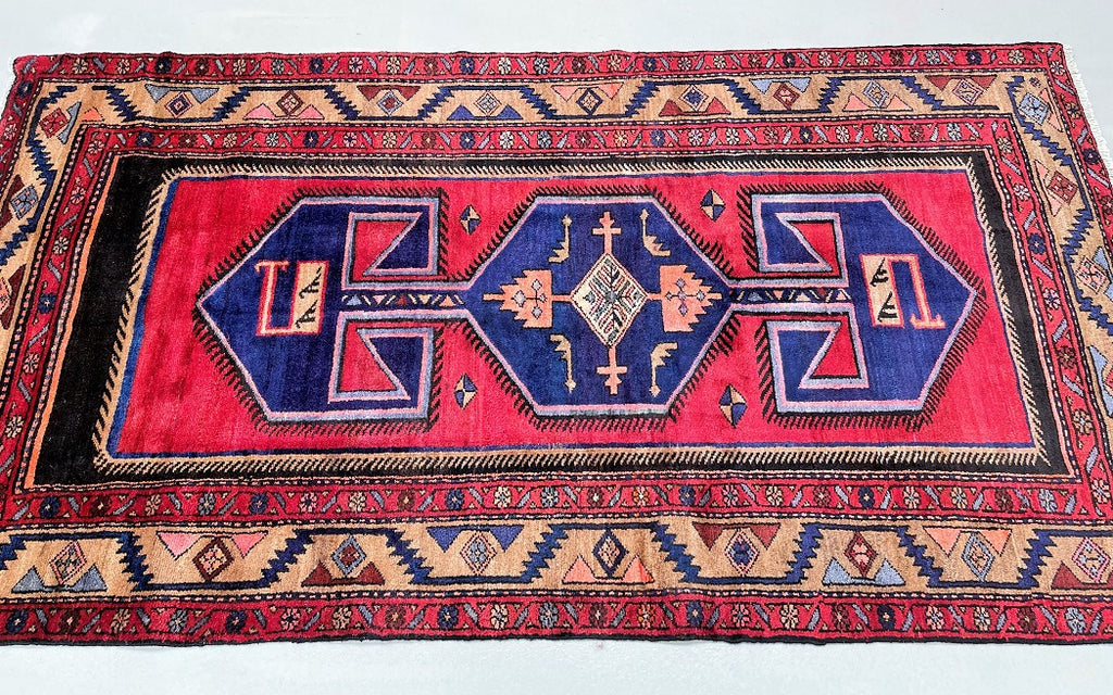 Coffee Table Size Authentic Handmade Persian Khamseh Rug. Above All This Is A Unique Tribal Art Work. It Also Has A Pure Hand Spun Wool Pile On Cotton Base. It Has an Indigo Blue, Beige, Red, Brown, Black And Pink Tone Dyed Using Traditional Methods.
