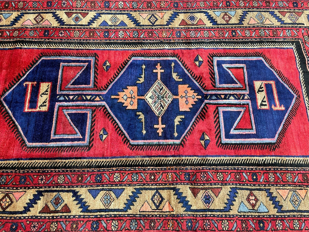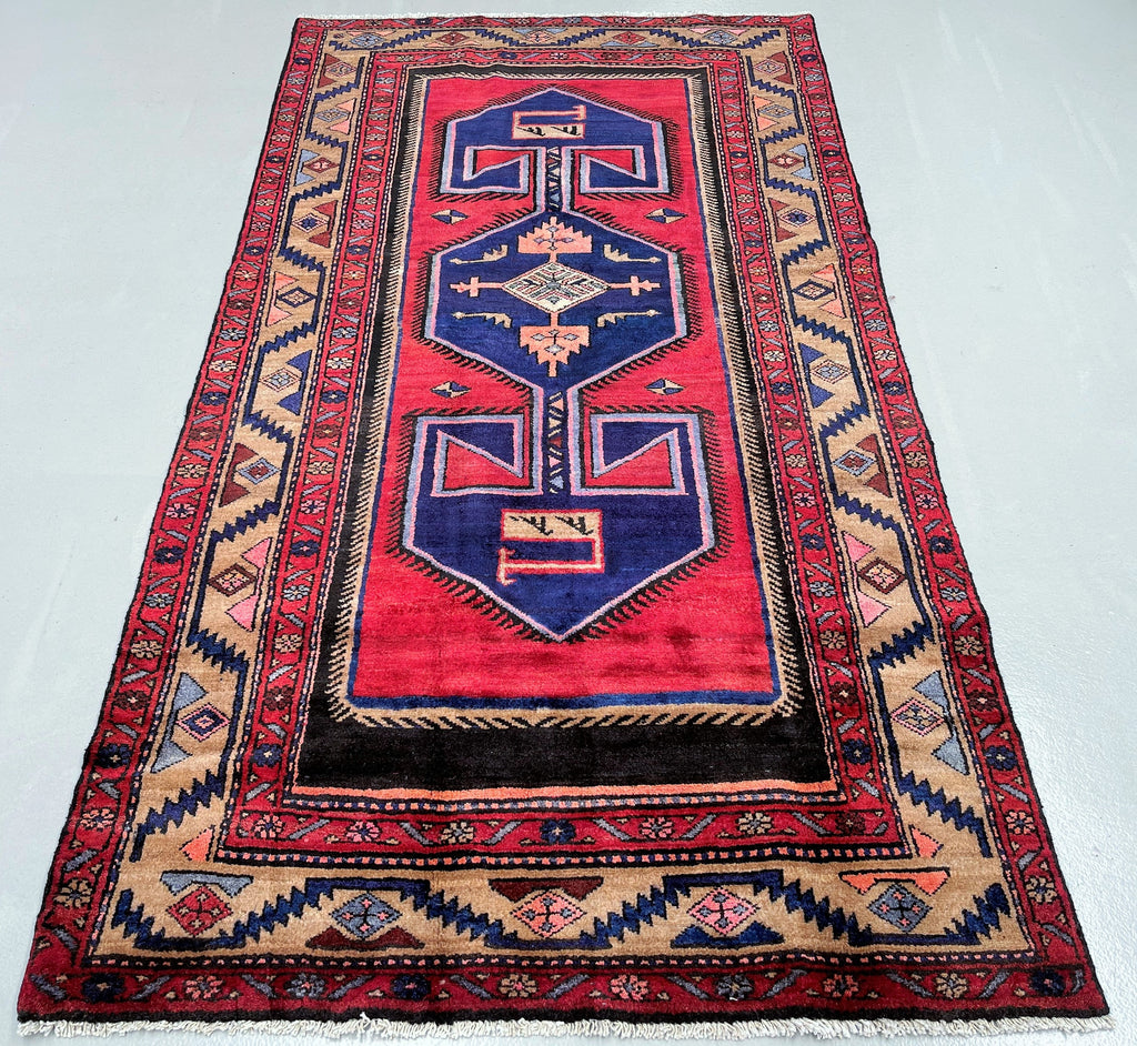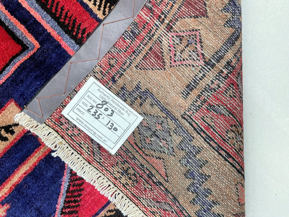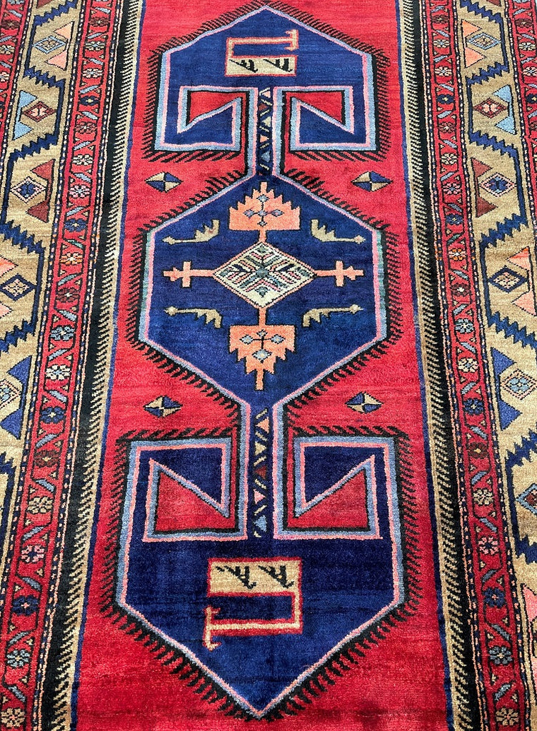 Coffee Table Size Authentic Handmade Persian Khamseh Rug. Above All This Is A Unique Tribal Art Work. It Also Has A Pure Hand Spun Wool Pile On Cotton Base. It Has an Indigo Blue, Beige, Red, Brown, Black And Pink Tone Dyed Using Traditional Methods.