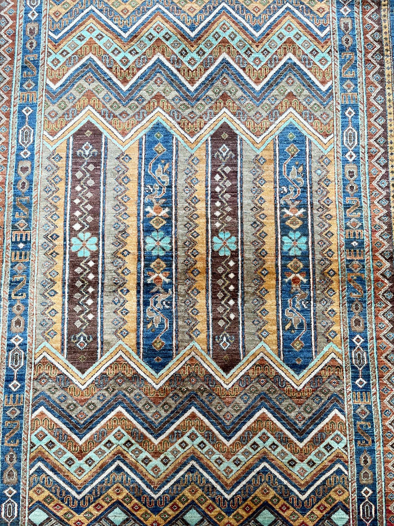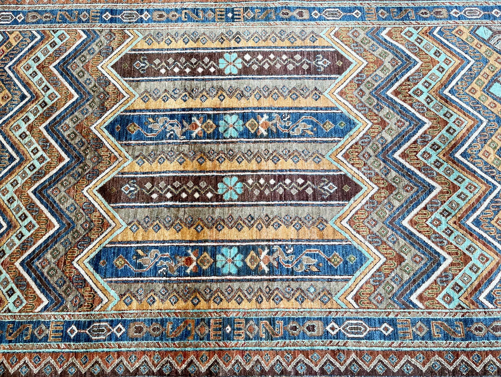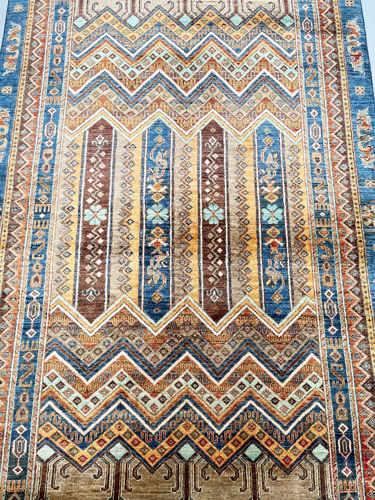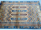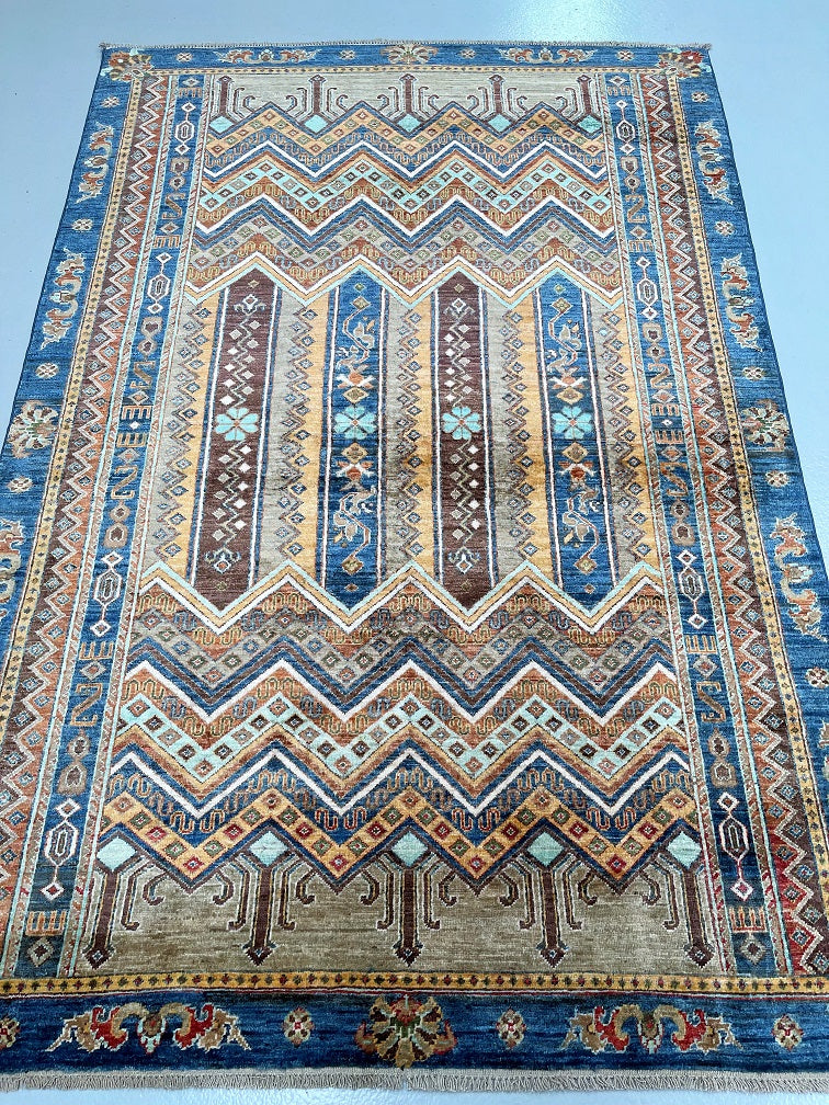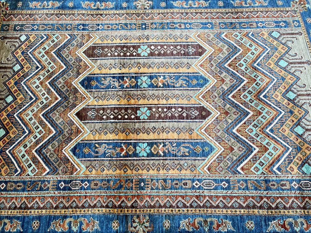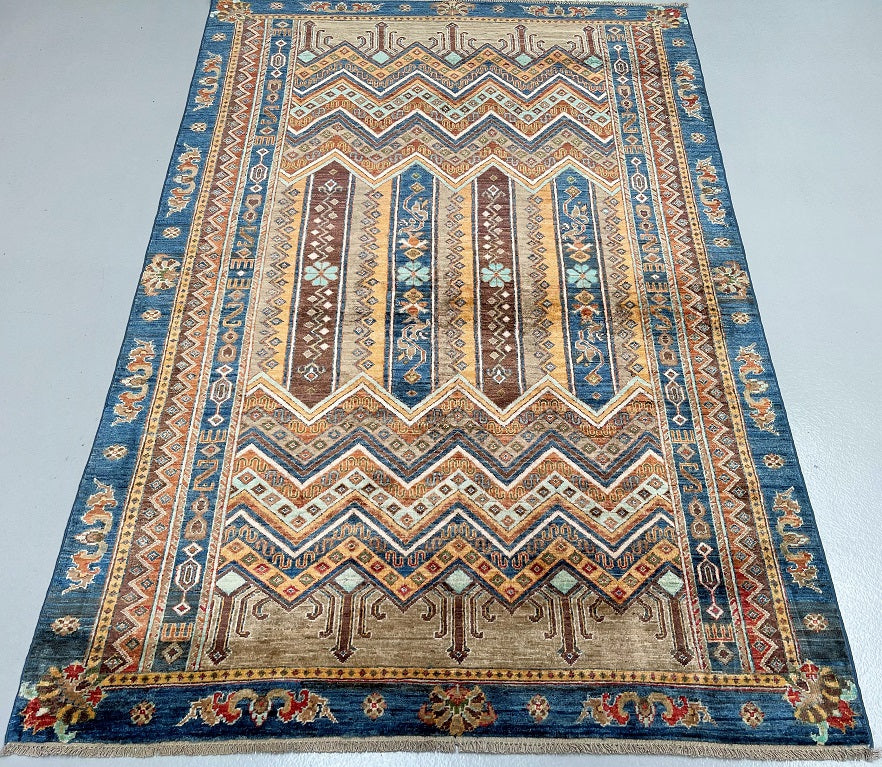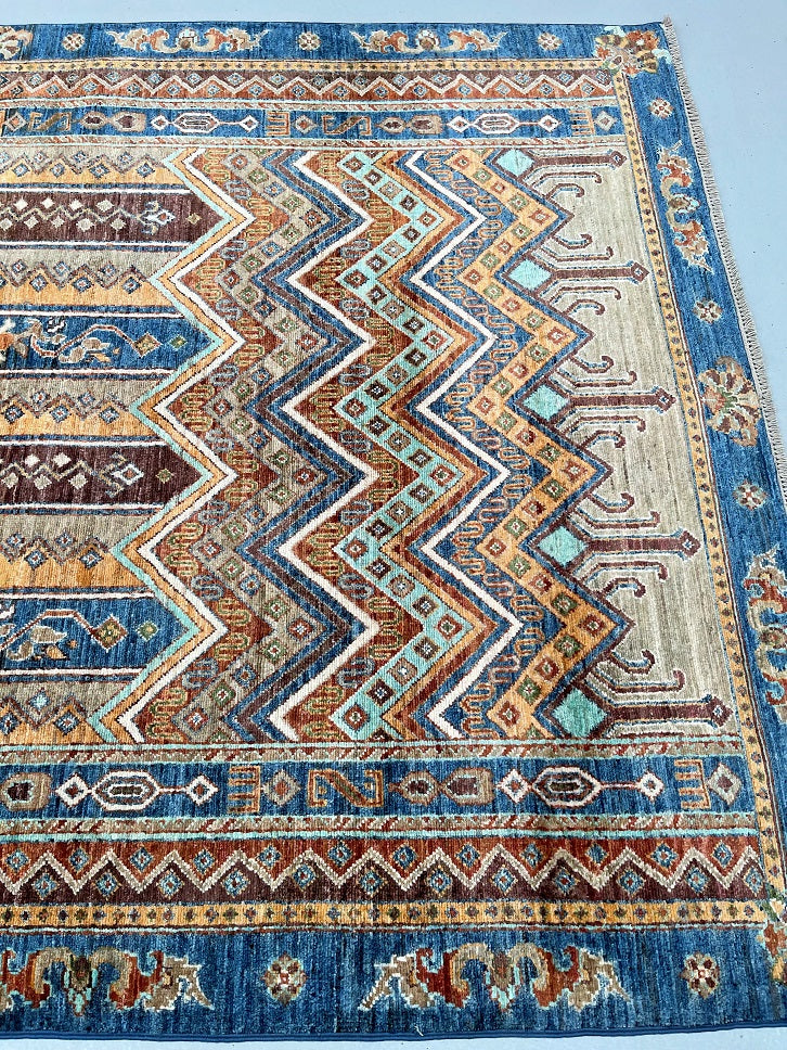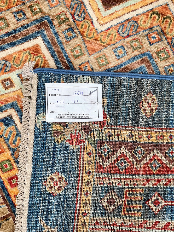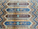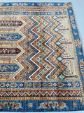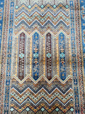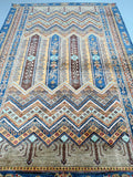 Amazing Coffee Table To Room Size Hand Woven Afghan Super Kazak Rug. Above All This Quality of Kazak Rugs Are Rare And Are Made Using Merino Wool Pile on Cotton Base. Blue, Gold, Brown, Red, Beige And Orange Tone Dyed Using Traditional Methods (Vegetable Dyes). Last of True Woven Nomadic Art.