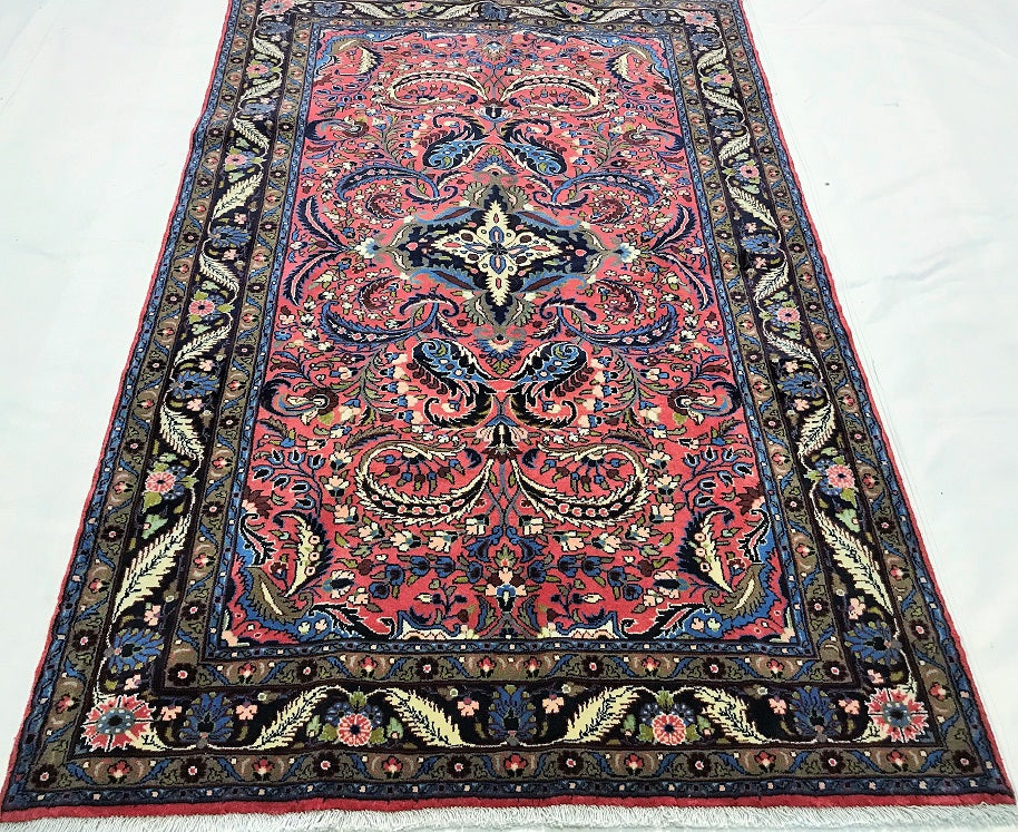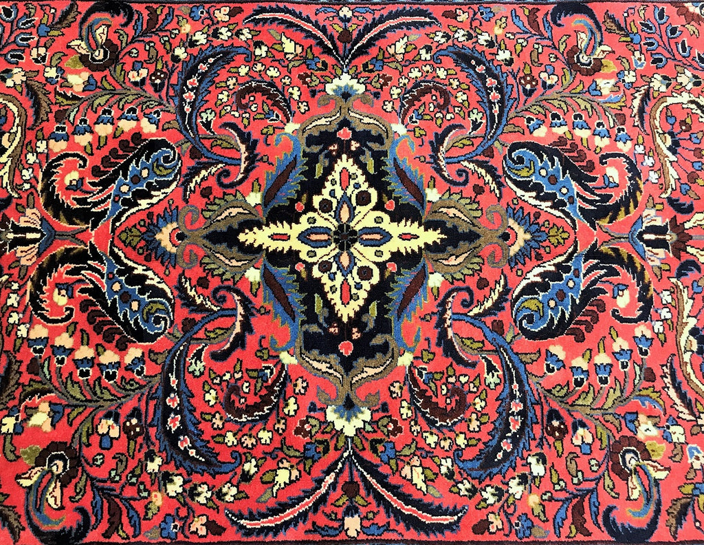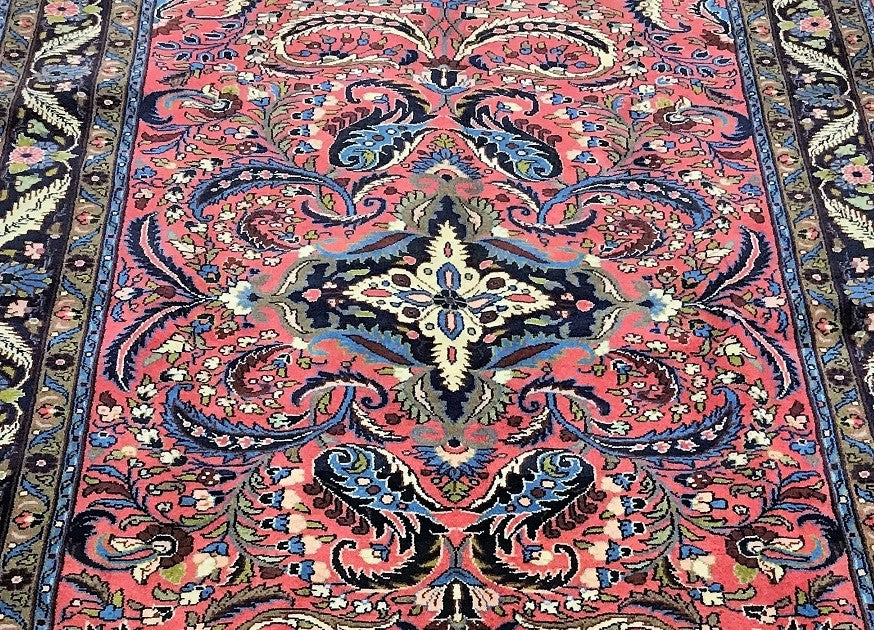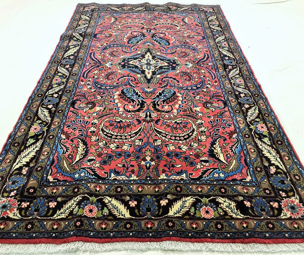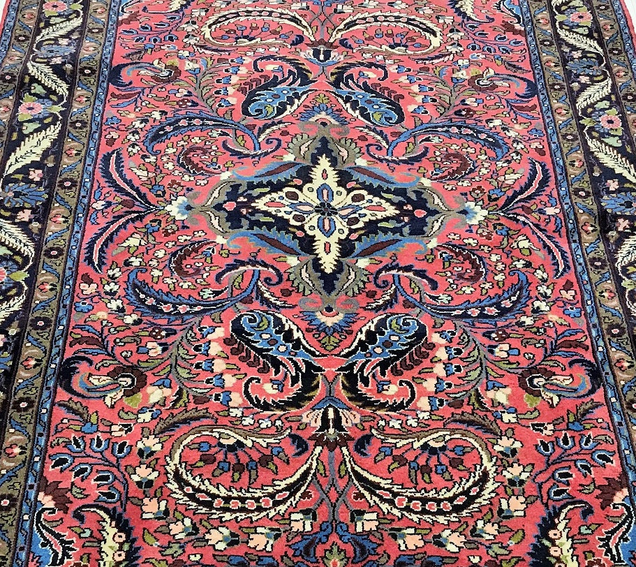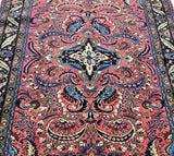 Decorative Room Size Authentic Handmade Persian Mehraban Rug. Above All It Is Hard To Get This Quality Original Handmade Rug From This Region. It Also Has Pure Hand Spun Wool Pile On Cotton Base. Salmon Pink, Beige, Black, Green And Blue Tone Dyed Using Traditional Methods.