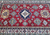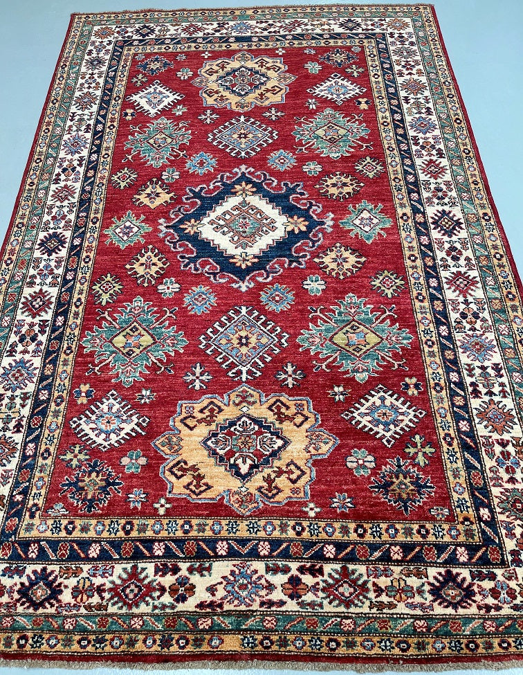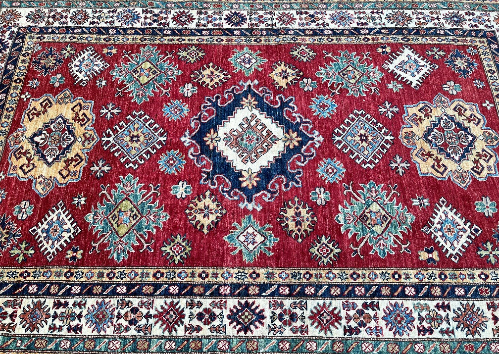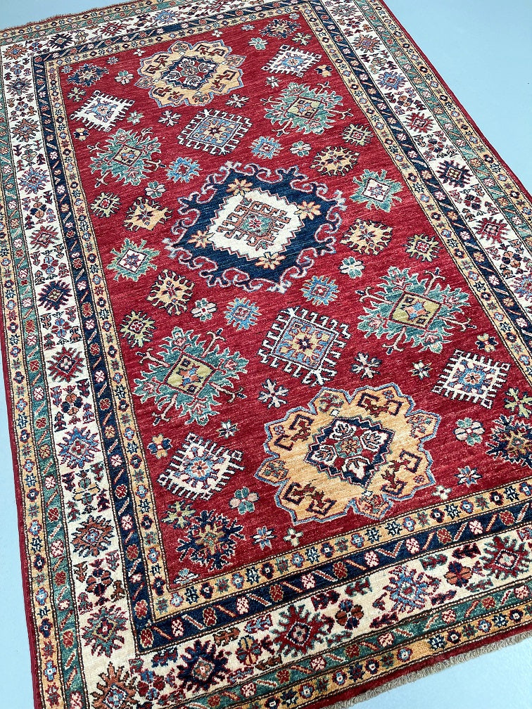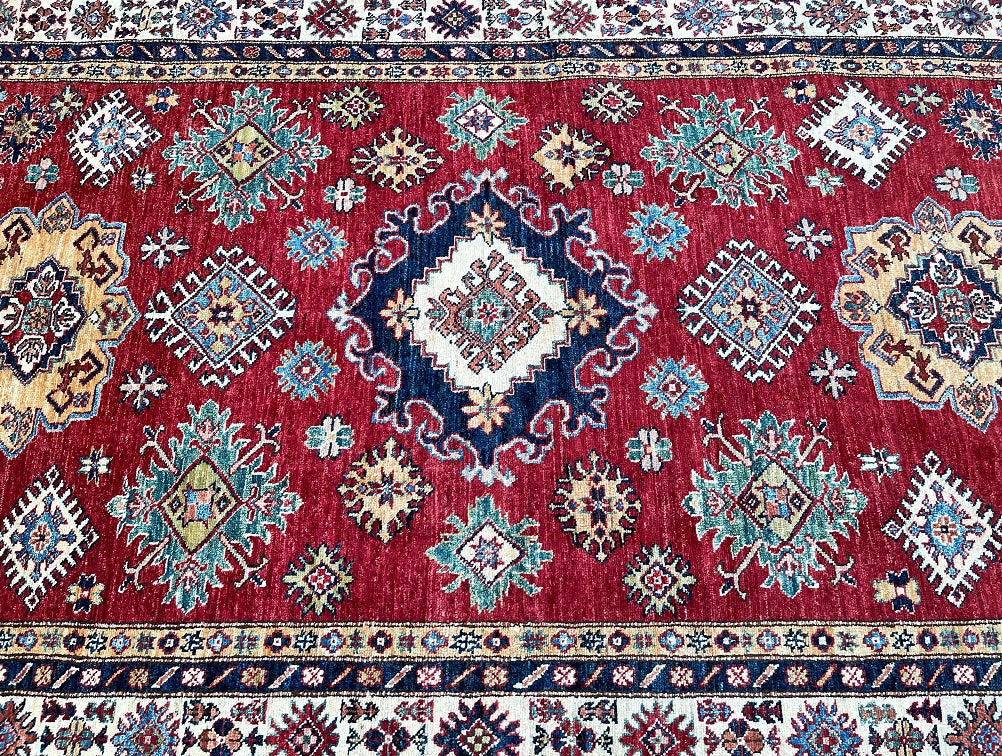 Decorative Room Size Authentic Hand Knotted Royal Kazak Rug. Above All It Is Pure Hand Spun Merino Wool Pile On Cotton Base Which Almost Feels Like Silk. Shiny Red, blue, Soft Orange, Green, Yellow And Beige Tone Dyed Using Traditional Methods (Vegetable Dyes). Last of True Woven Nomadic Art.