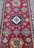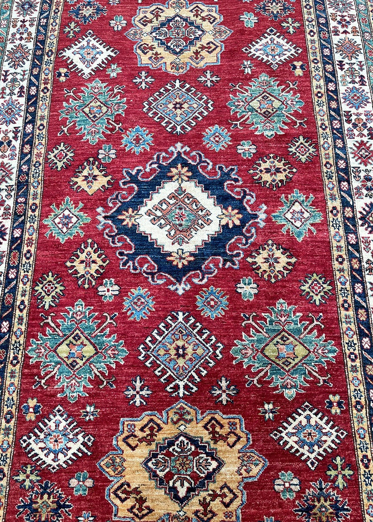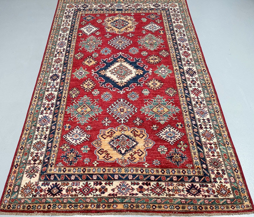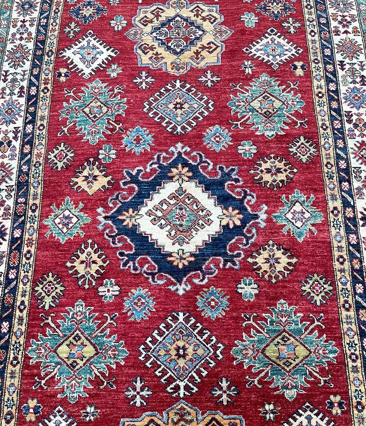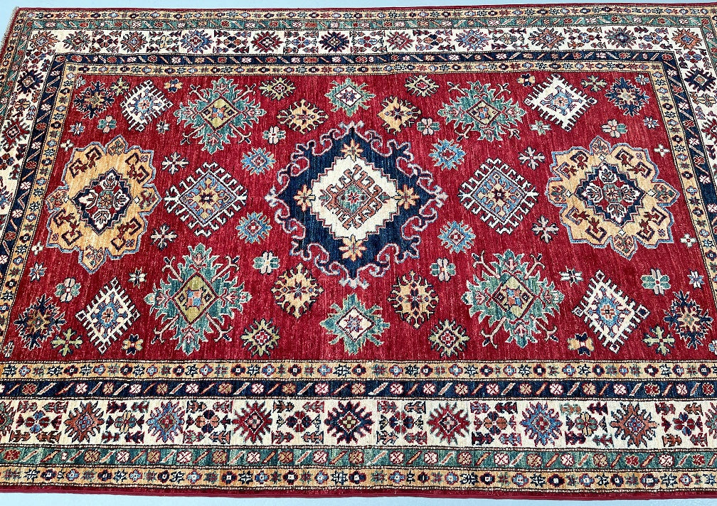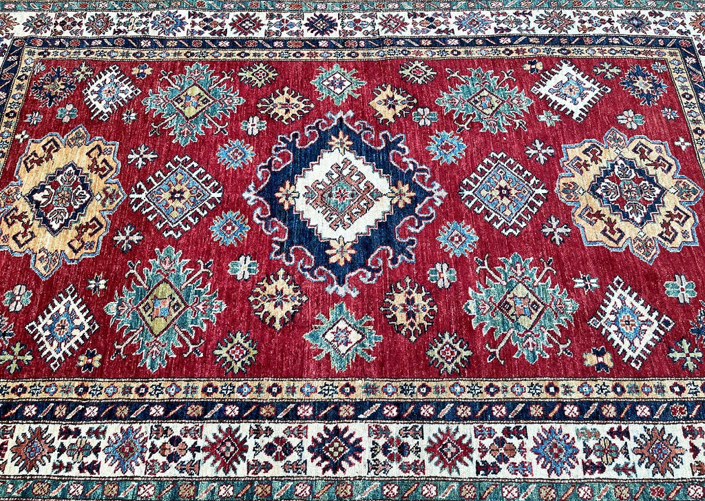 Decorative Room Size Authentic Hand Knotted Royal Kazak Rug. Above All It Is Pure Hand Spun Merino Wool Pile On Cotton Base Which Almost Feels Like Silk. Shiny Red, blue, Soft Orange, Green, Yellow And Beige Tone Dyed Using Traditional Methods (Vegetable Dyes). Last of True Woven Nomadic Art.