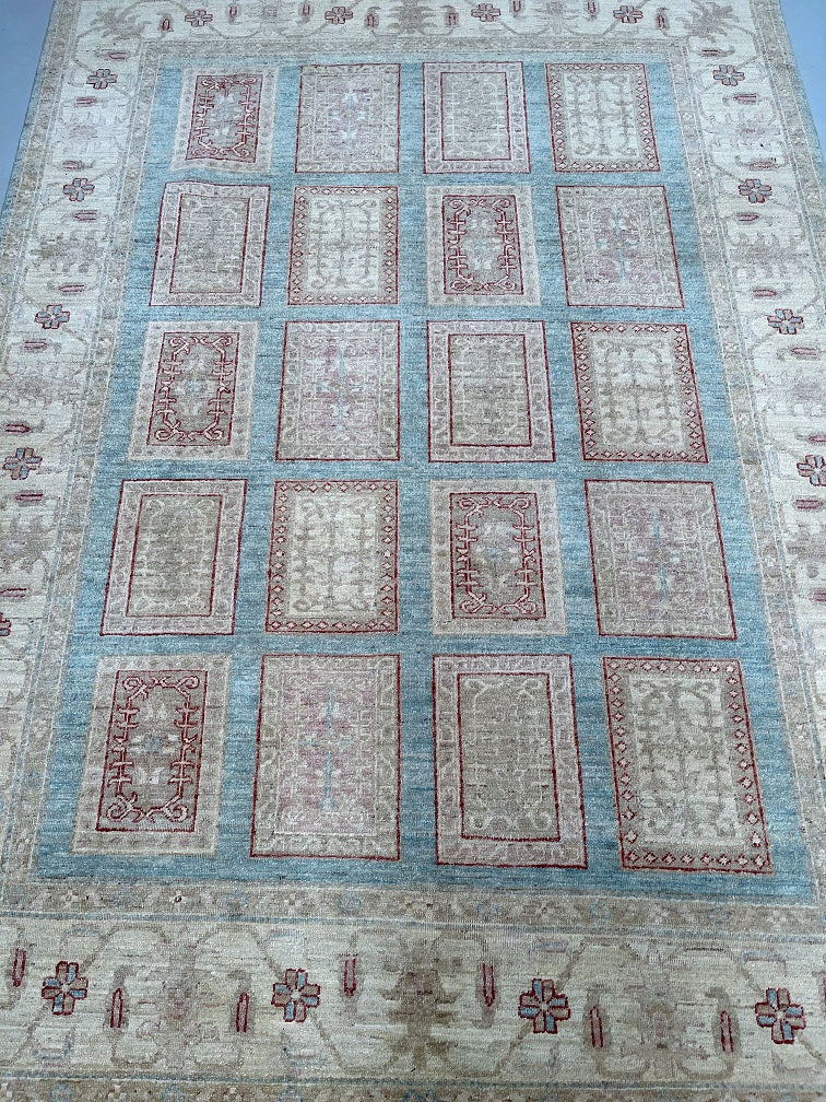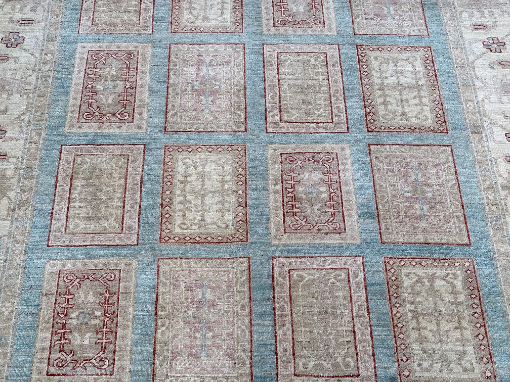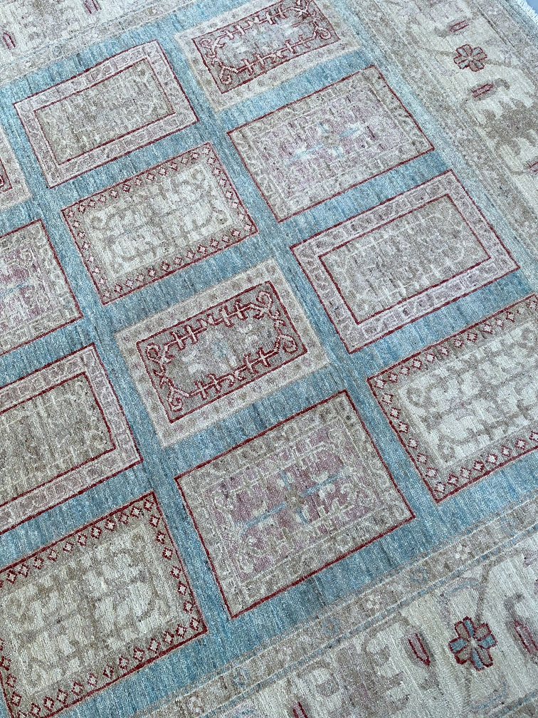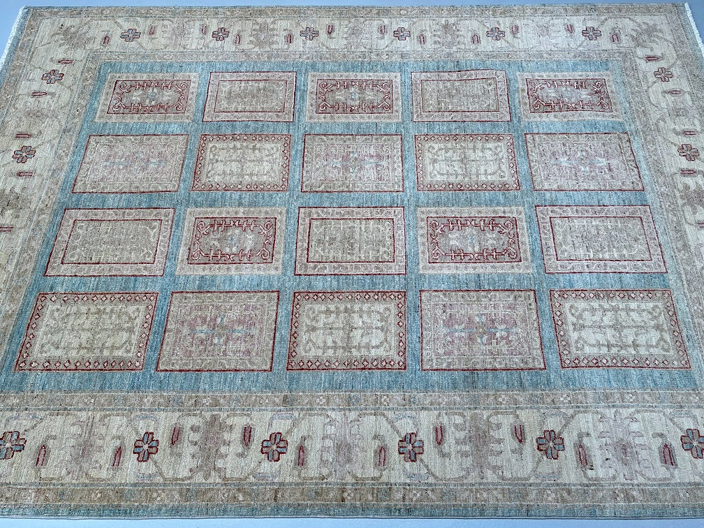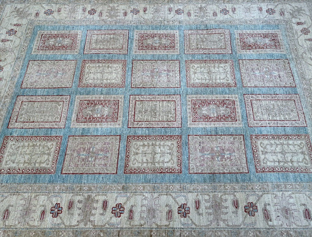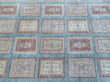 Unique Room Size Authentic Handmade Afghan Chobi Rug. Above All It Is Pure Hand Spun Wool Pile On Cotton Base. Faded Pastel Beige, French Blue, Red And Soft Pink Tone Dyed Using Traditional Methods (Vegetable Dyes). Last Of True Woven Nomadic Art.