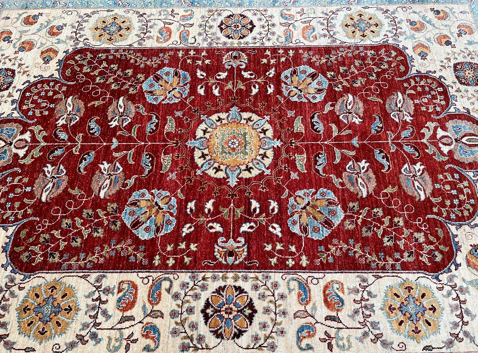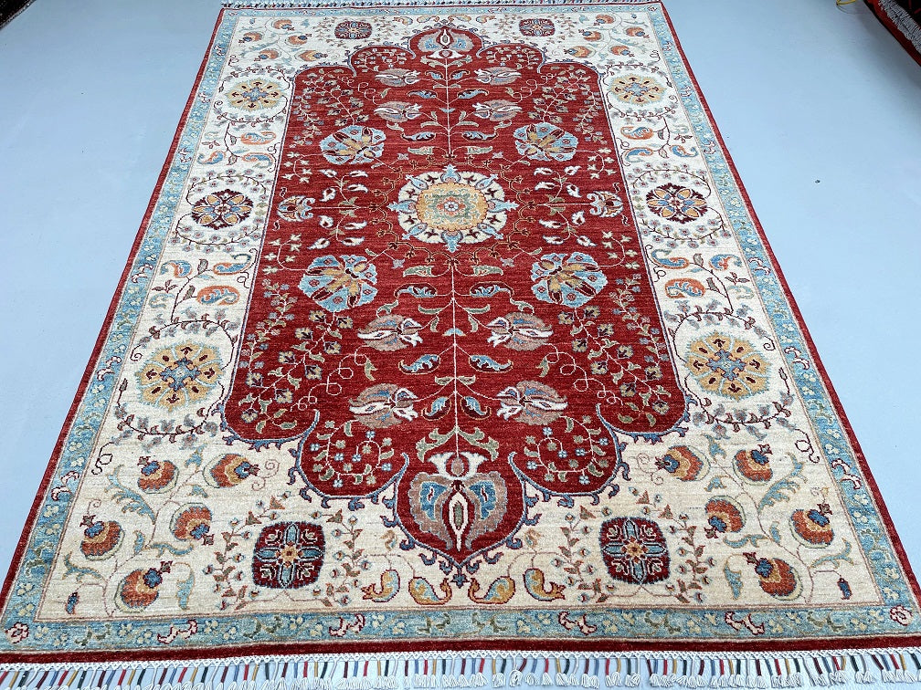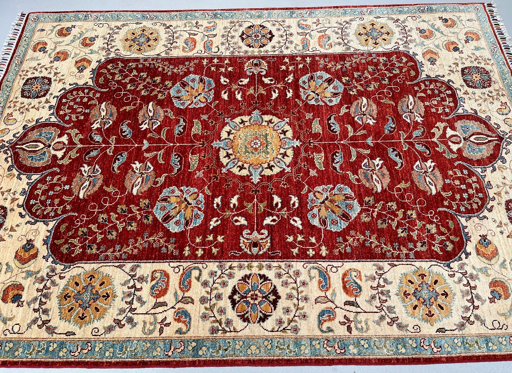 Decorative Room Size Authentic Handmade Afghan Royal Kazak rug. Above All It Is Pure Hand Spun Wool Pile On Cotton Base. Rustic Red, Orange, Maroon, Light Blue And Gold Tone Dyed Using Traditional Methods (Vegetable Dyes). Last Of True Woven Tribal Art.