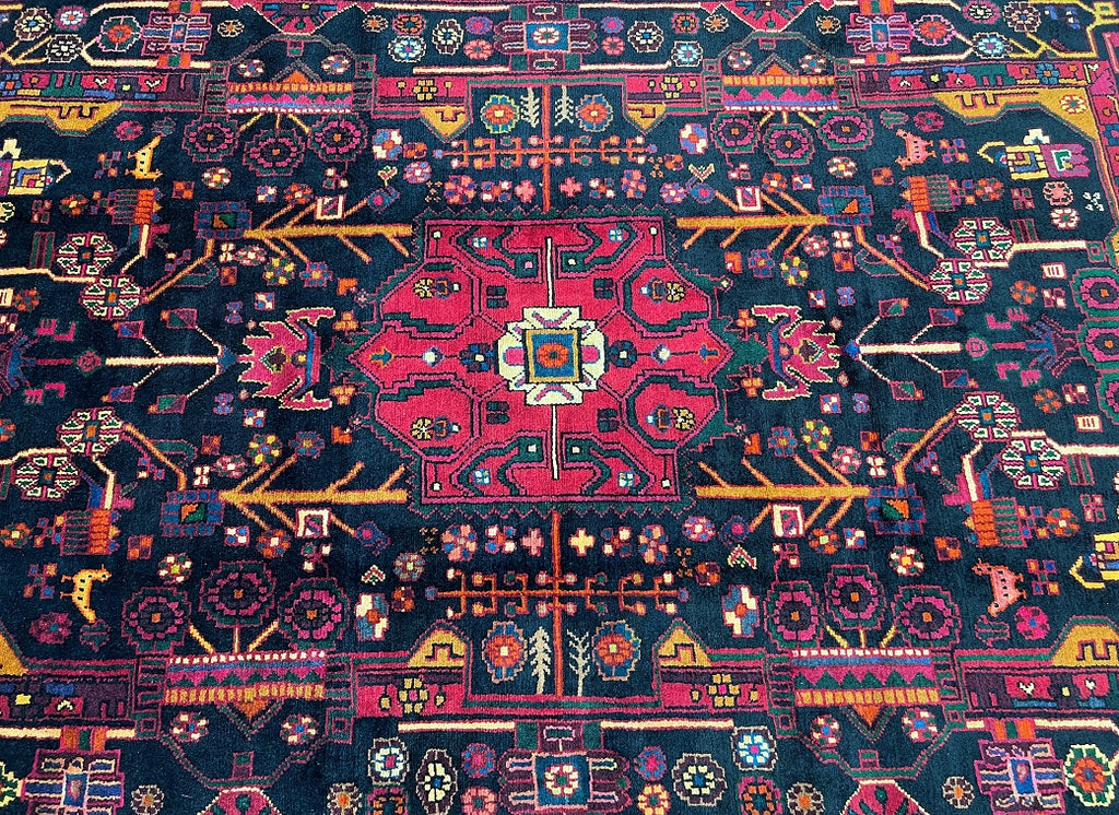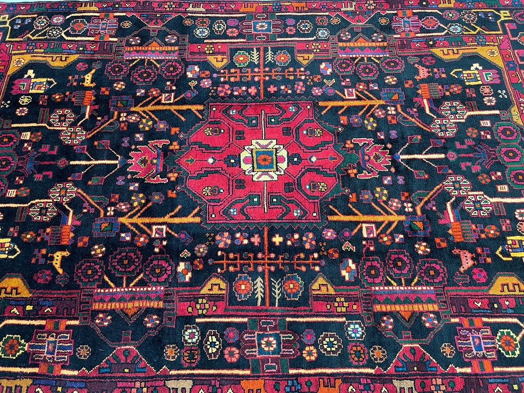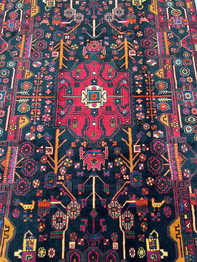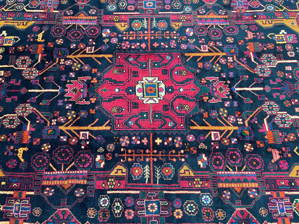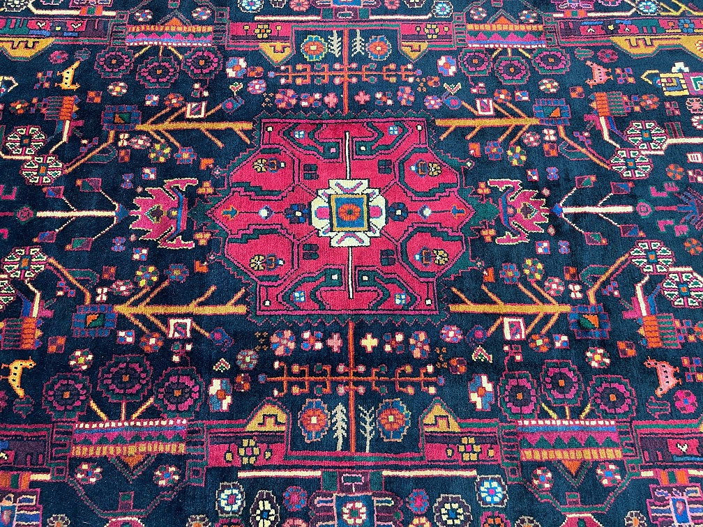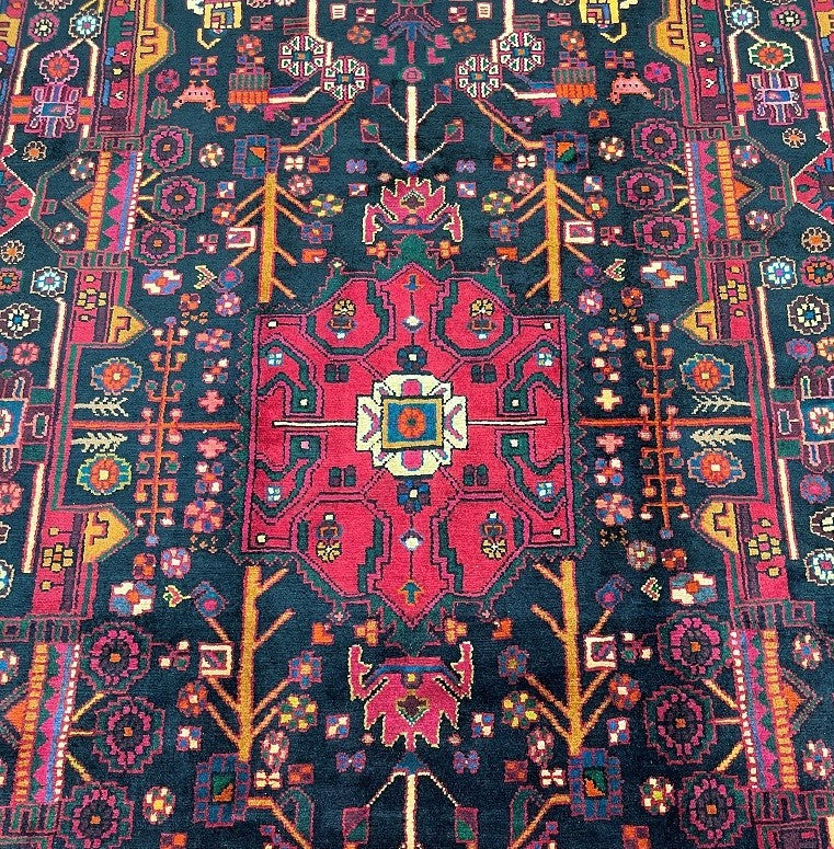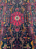 Collectible Room Size Authentic Handmade Persian Nahavand Rug. Above All It Is Hard To Find True Handmade Tribal Pieces Made By The Nomads. It Has A Pure Hand Spun Wool Pile On Cotton Base. It Also Has A Black/Indigo Blue, Beige, Mustard, Pink, Green With Hint Of Purple Tone Dyed Using Traditional Methods.