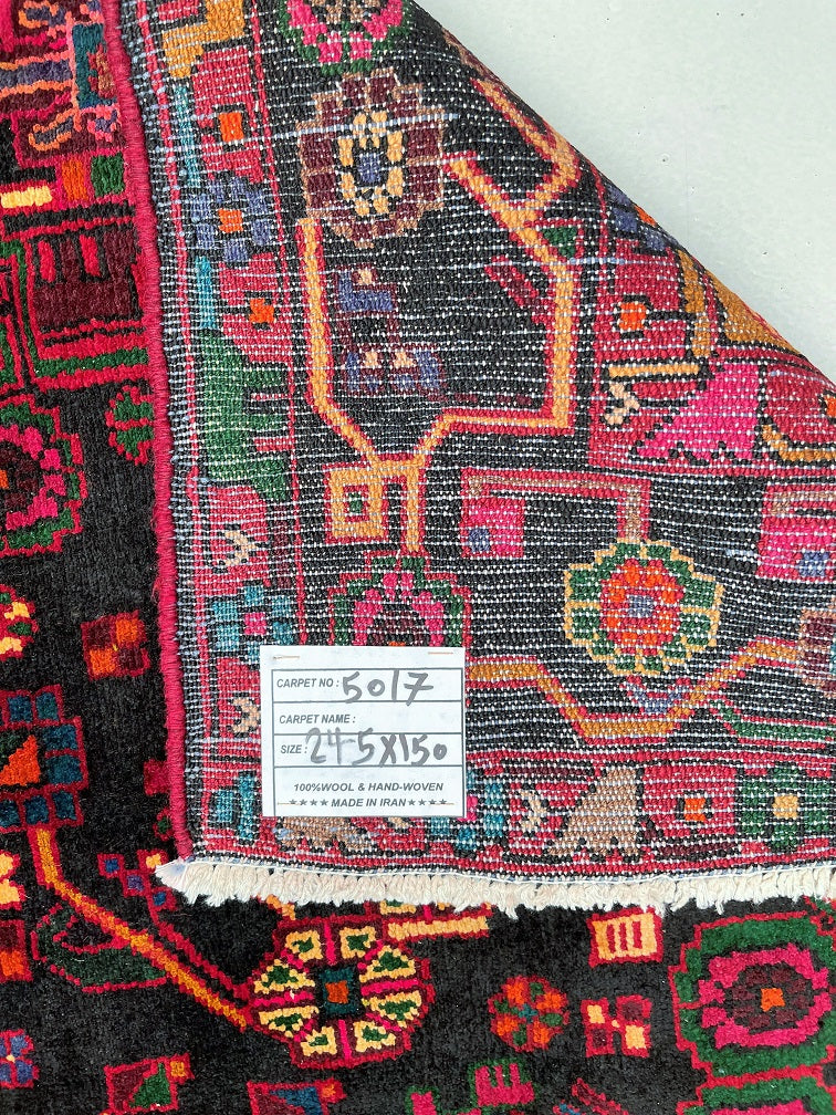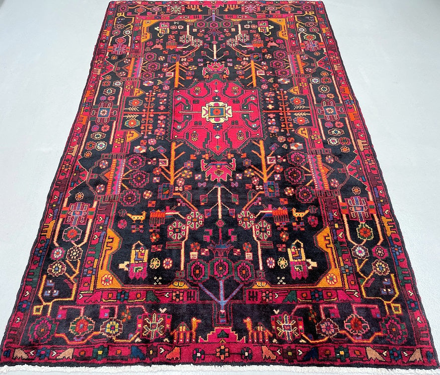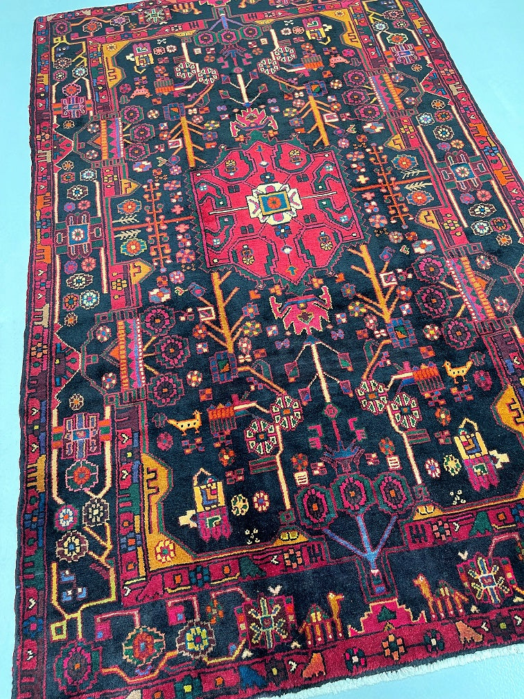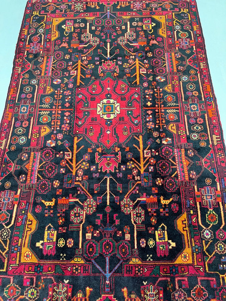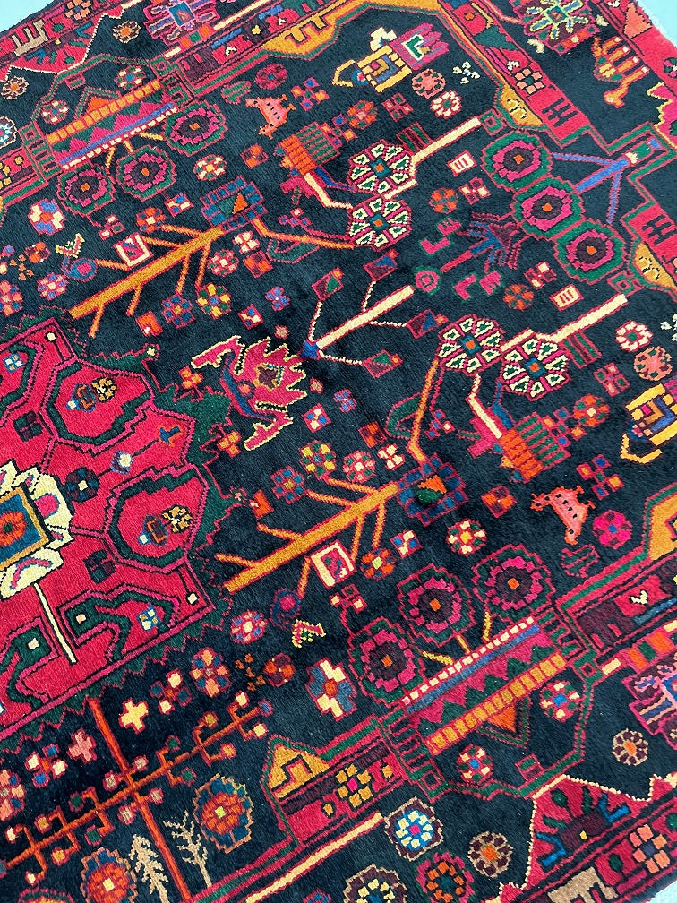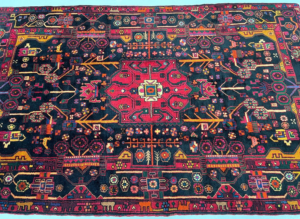 Collectible Room Size Authentic Handmade Persian Nahavand Rug. Above All It Is Hard To Find True Handmade Tribal Pieces Made By The Nomads. It Has A Pure Hand Spun Wool Pile On Cotton Base. It Also Has A Black/Indigo Blue, Beige, Mustard, Pink, Green With Hint Of Purple Tone Dyed Using Traditional Methods.