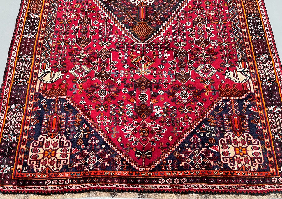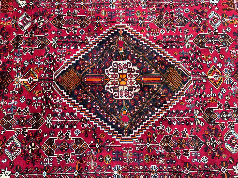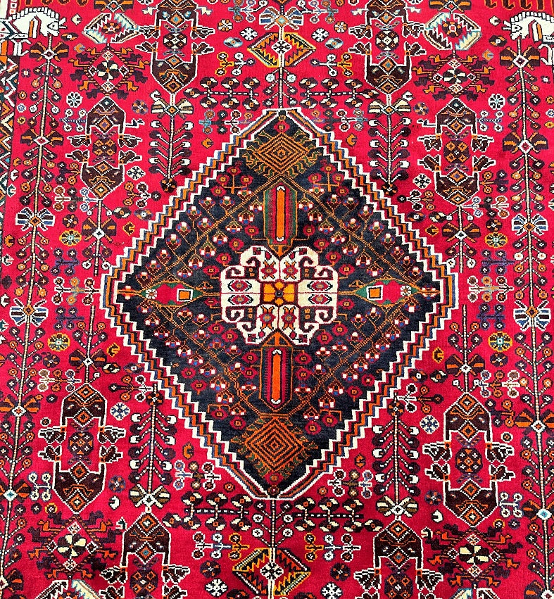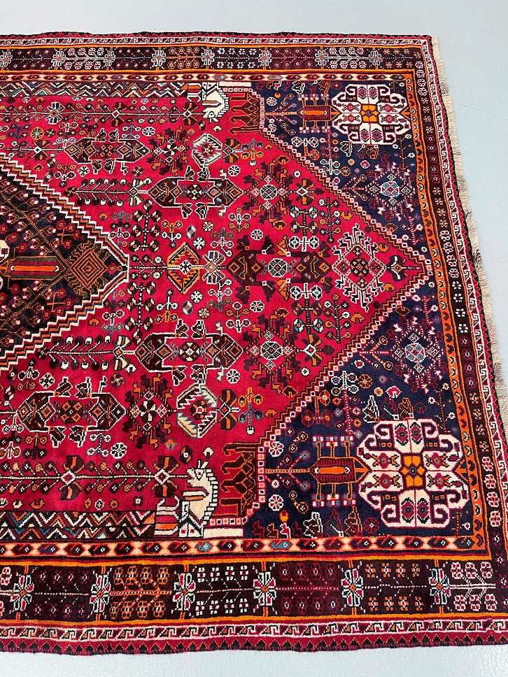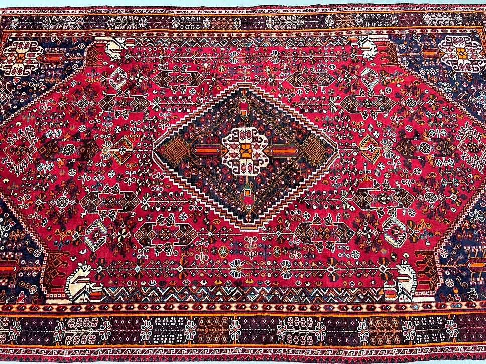 Vintage Persian Qashqai Shiraz Rug with Spacious Dimensions. Crafted with a Luxurious Hand Spun Wool Pile on a Wool Base, this rug showcases a vibrant color palette including shades of Red, Beige, Brown, Blue, Green, Yellow, Orange, and Black. The traditional dyeing techniques employed in its creation lend a timeless appeal. Adorned with a captivating Central Medallion Semi Geometric, Semi Floral Persepolis Design, this rug reflects the skilled craftsmanship of a weaver who dedicated approximately 9 months to complete it. Originating from the Shiraz District in South Persia, this handcrafted rug measures 250 x 160 cm and holds a gallery replacement value of $6900.