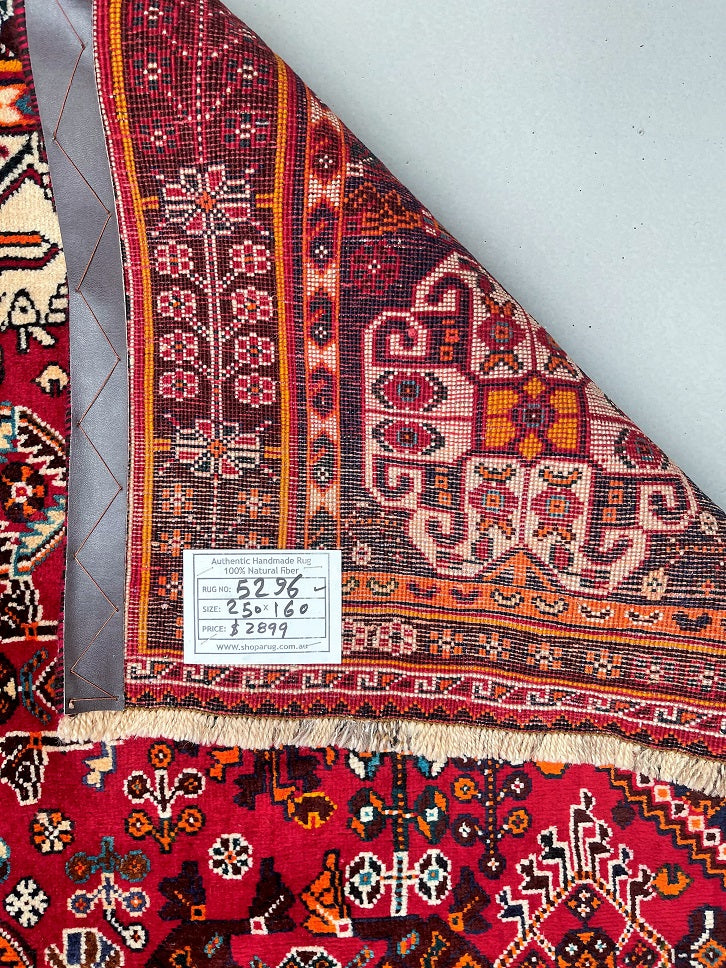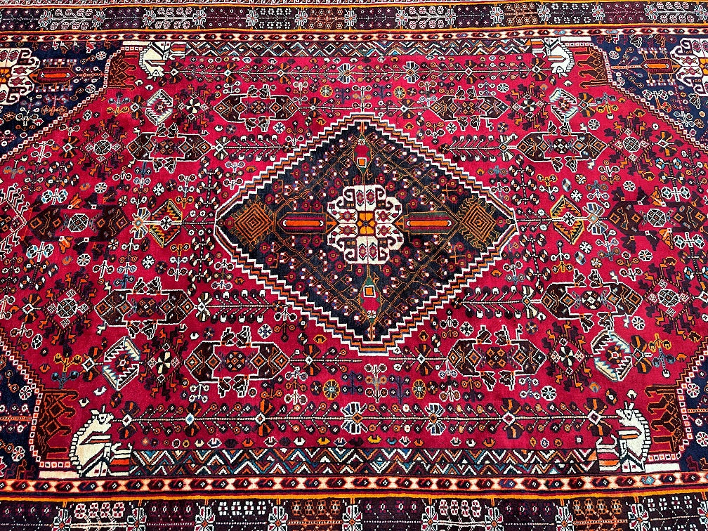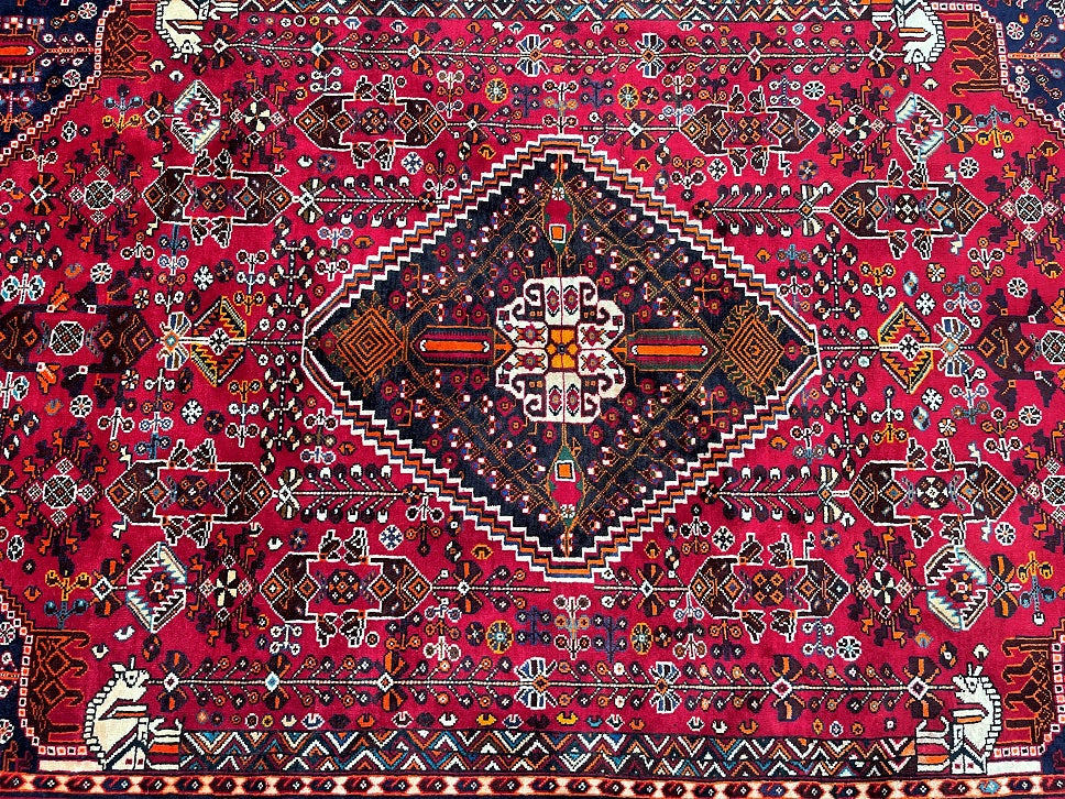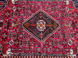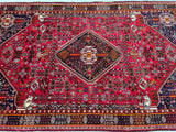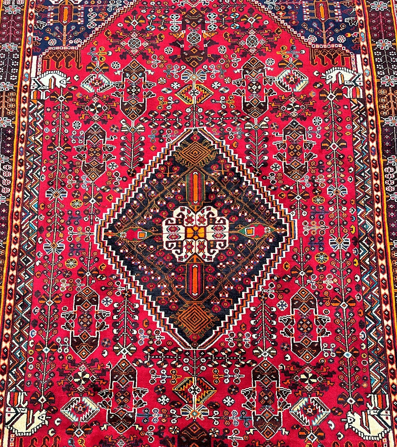Vintage Persian Qashqai Shiraz Rug with Spacious Dimensions. Crafted with a Luxurious Hand Spun Wool Pile on a Wool Base, this rug showcases a vibrant color palette including shades of Red, Beige, Brown, Blue, Green, Yellow, Orange, and Black. The traditional dyeing techniques employed in its creation lend a timeless appeal. Adorned with a captivating Central Medallion Semi Geometric, Semi Floral Persepolis Design, this rug reflects the skilled craftsmanship of a weaver who dedicated approximately 9 months to complete it. Originating from the Shiraz District in South Persia, this handcrafted rug measures 250 x 160 cm and holds a gallery replacement value of $6900.