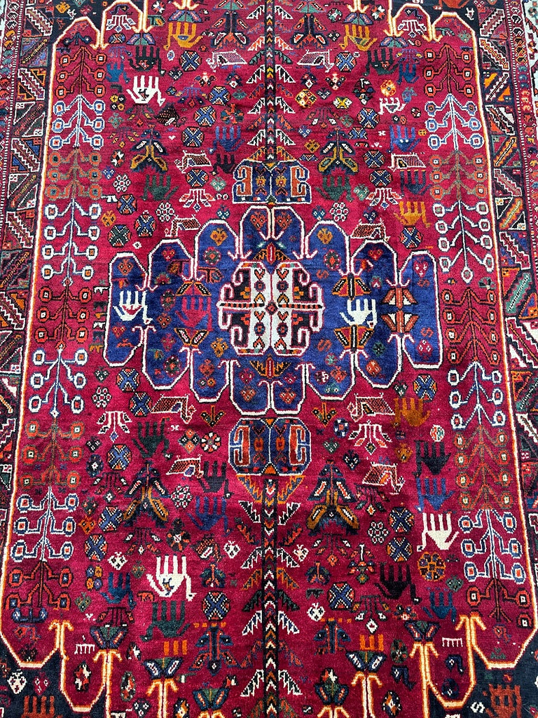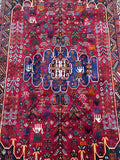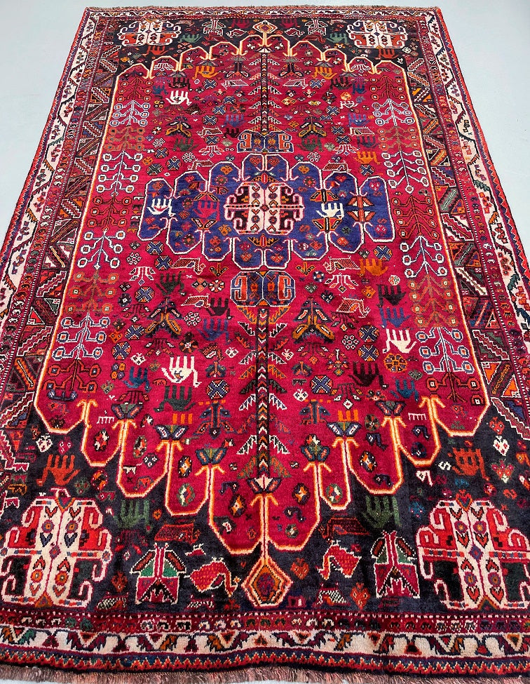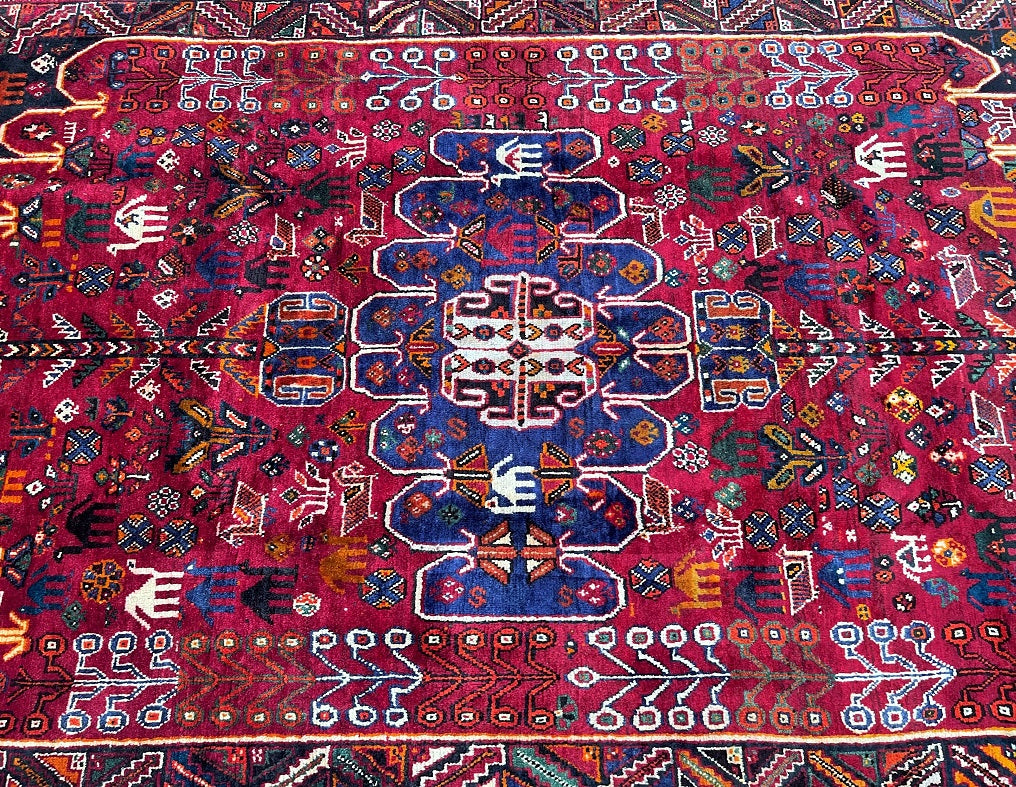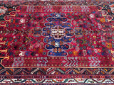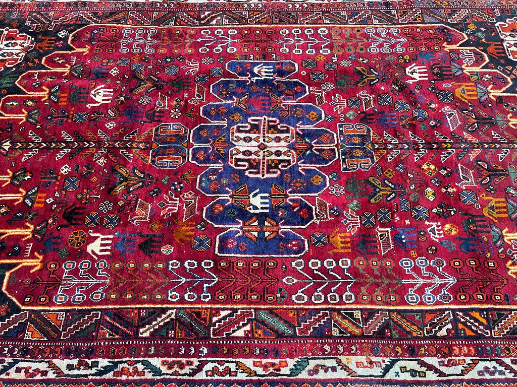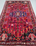 Stunning Room Size Double Knotted Persian Qashqai Shiraz Rug. It Has a Dense Pure Hand Spun Wool Pile On Wool Base. Deep Maroon Red, Beige, Blue, Green, Brown, Yellow, Orange and Black Tone Dyed Using Traditional Methods.