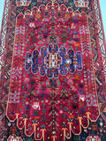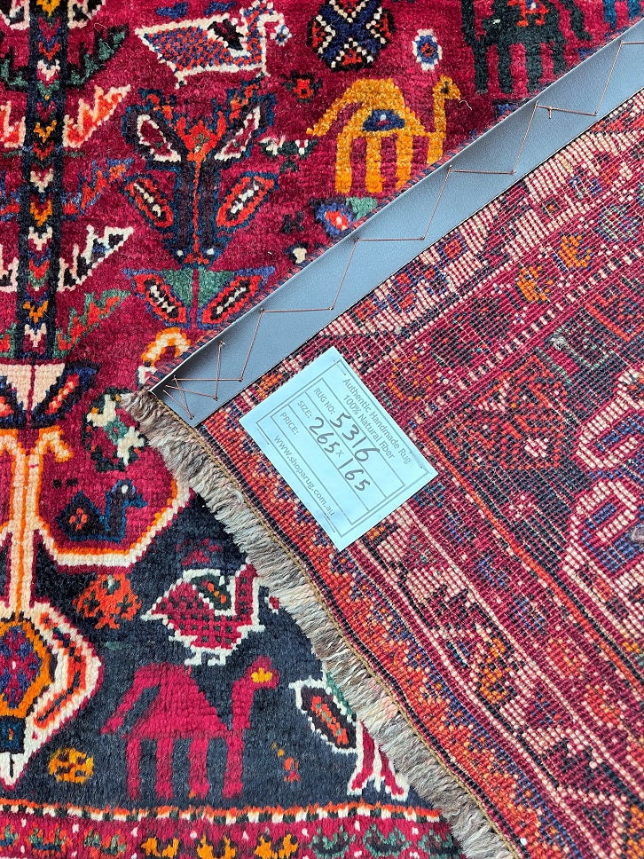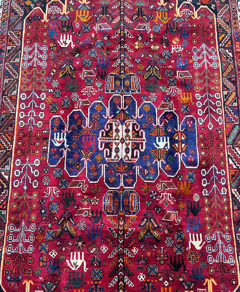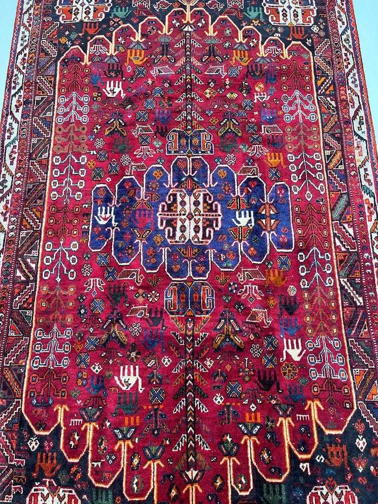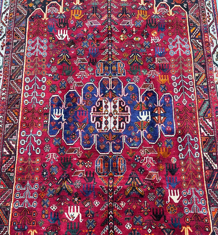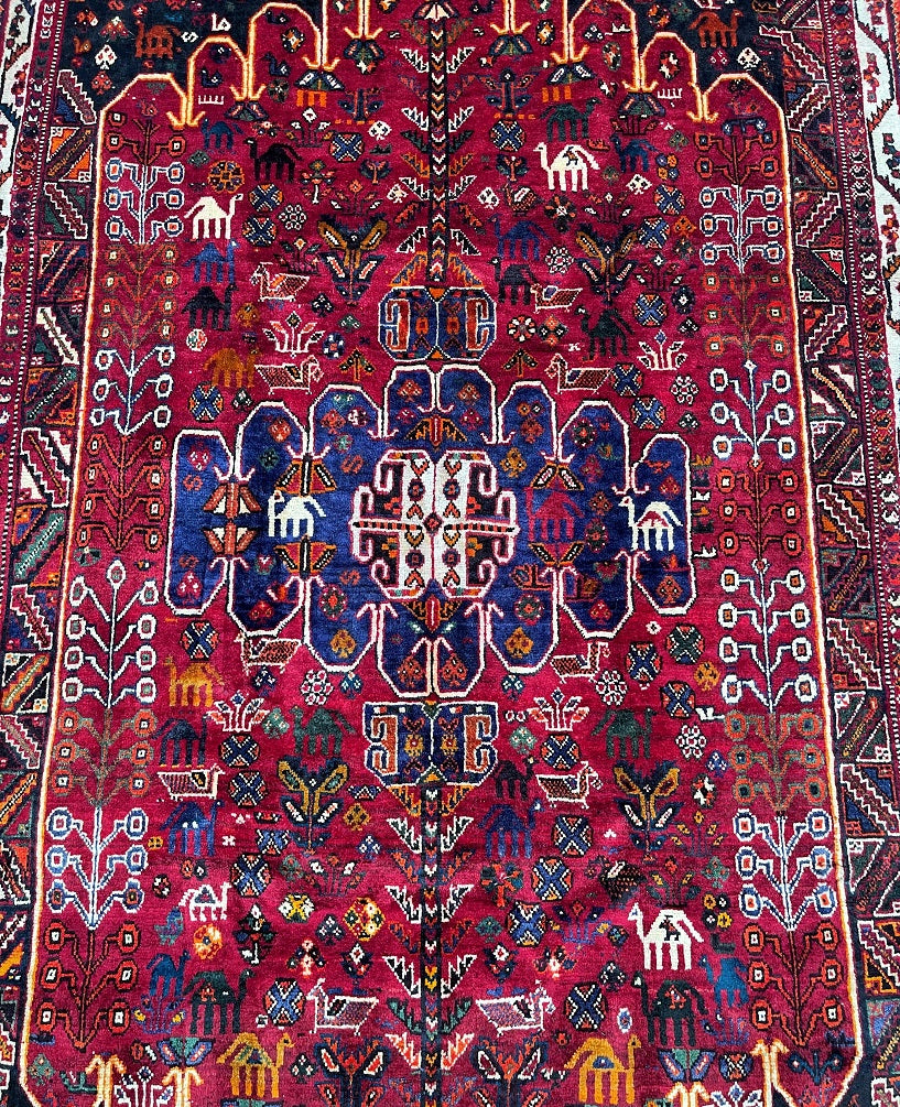 Stunning Room Size Double Knotted Persian Qashqai Shiraz Rug. It Has a Dense Pure Hand Spun Wool Pile On Wool Base. Deep Maroon Red, Beige, Blue, Green, Brown, Yellow, Orange and Black Tone Dyed Using Traditional Methods.