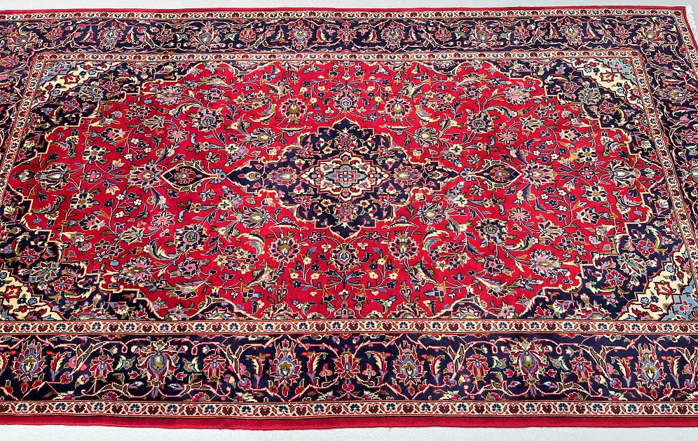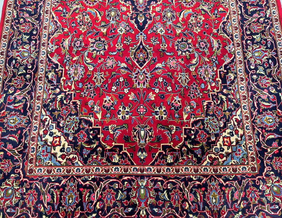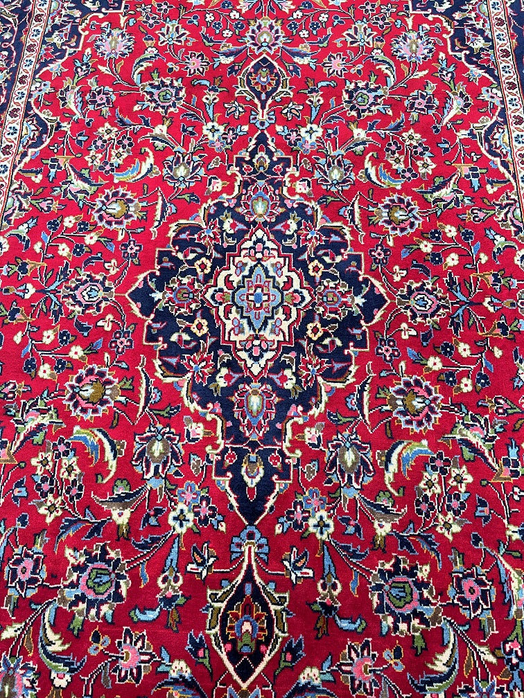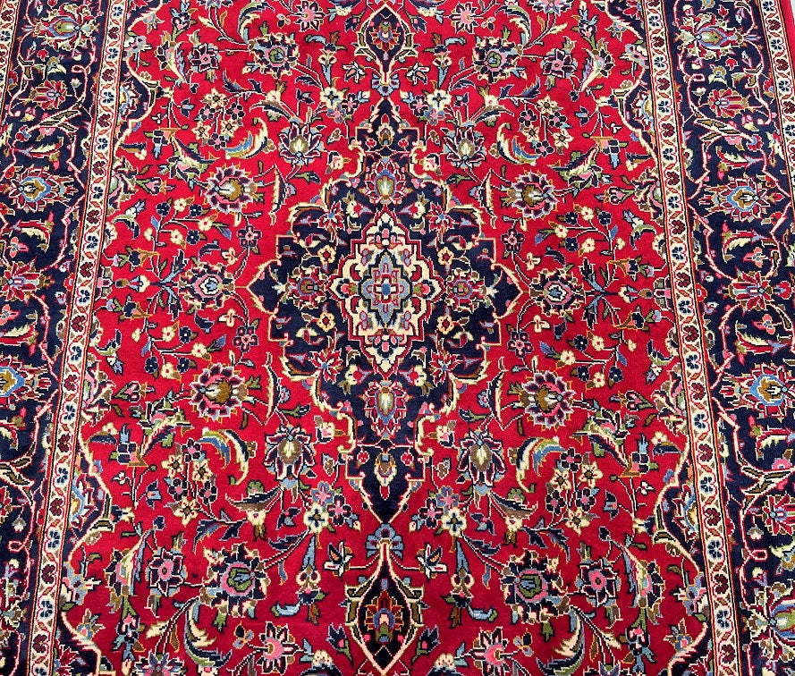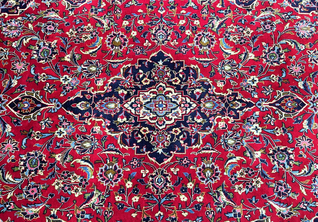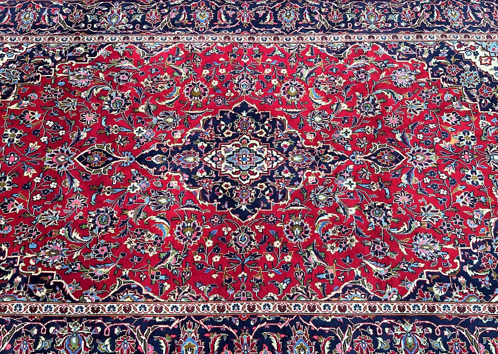 Room Size Authentic Handmade Persian Royal Kashan Rug. It Has A Lamb’s Wool Pile On Cotton Base. Main Colours Are Red, Indigo Blue, Beige With Touch Of Aqua, Green And Pink Tone Dyed Using Traditional Methods.