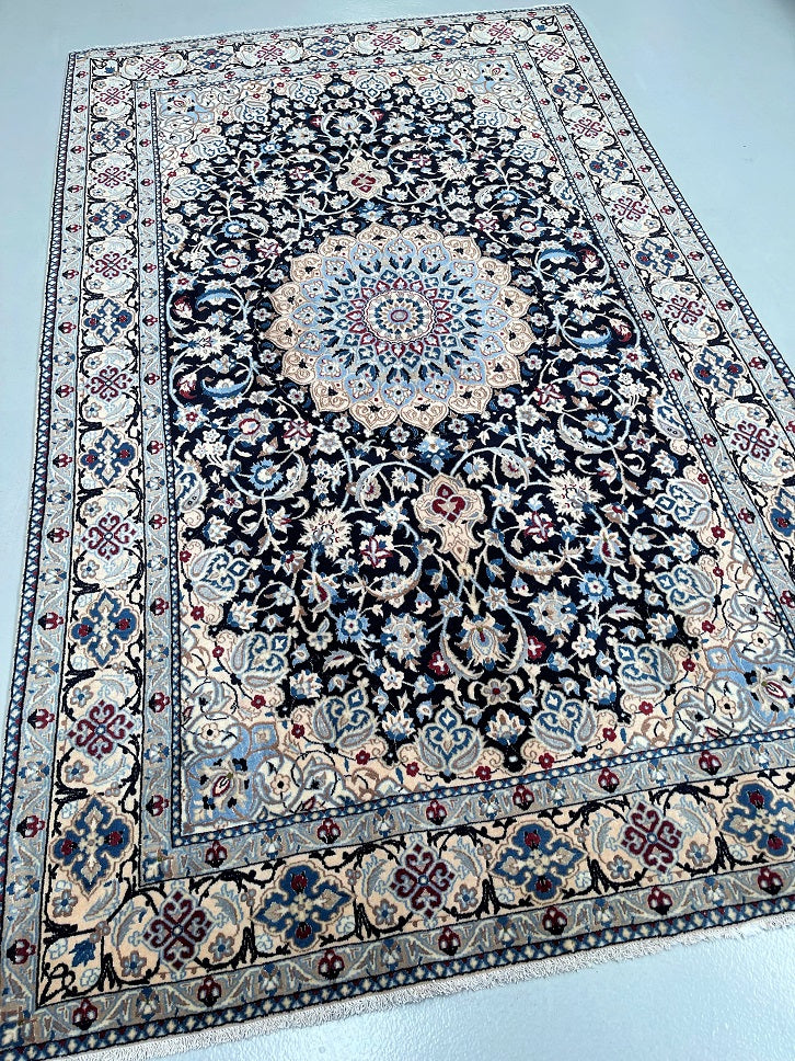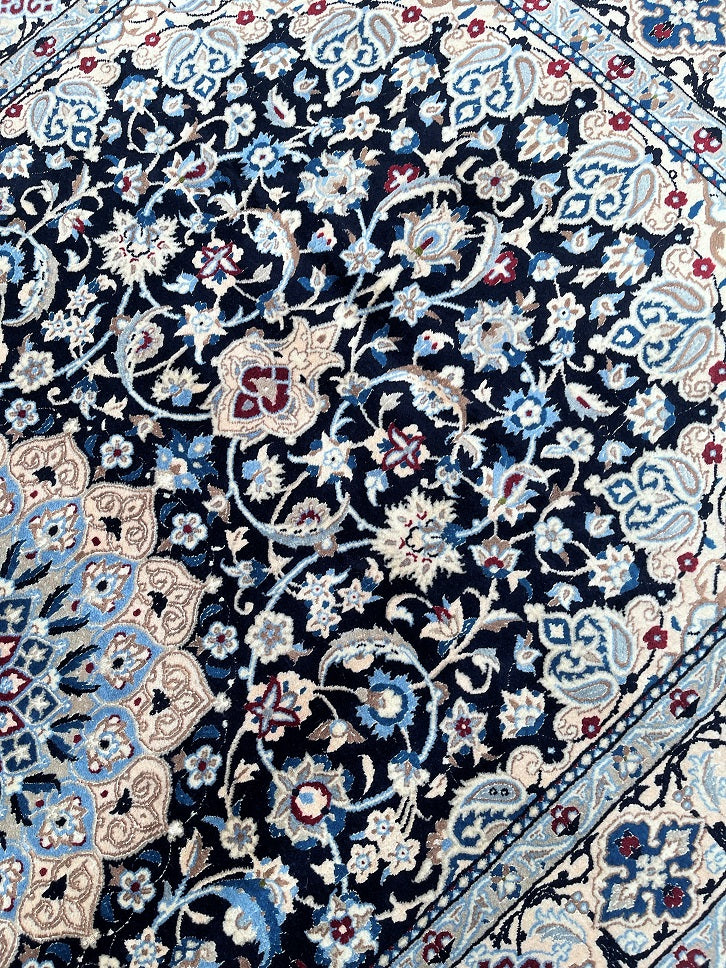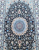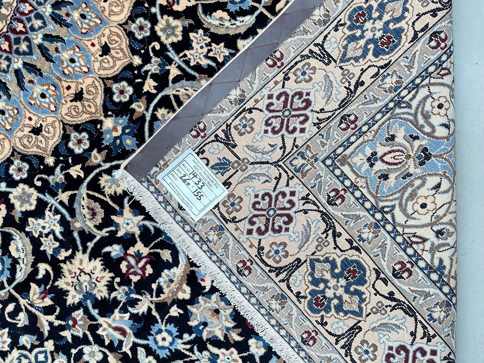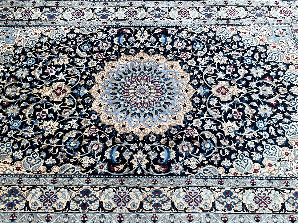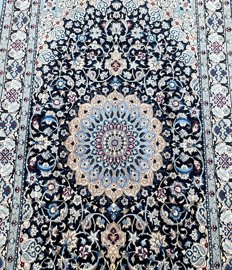 Superb Room Size Authentic Handmade Vintage Persian Nain Rug. Above All It Is Hard To Get This Quality Original Handmade Rug From This Region. It Also Has A Lamb’s Wool And Silk Pile On Cotton Base. Indigo Blue, Aqua, Burgundy, Cream And Beige Tones Dyed Using Traditional Methods.