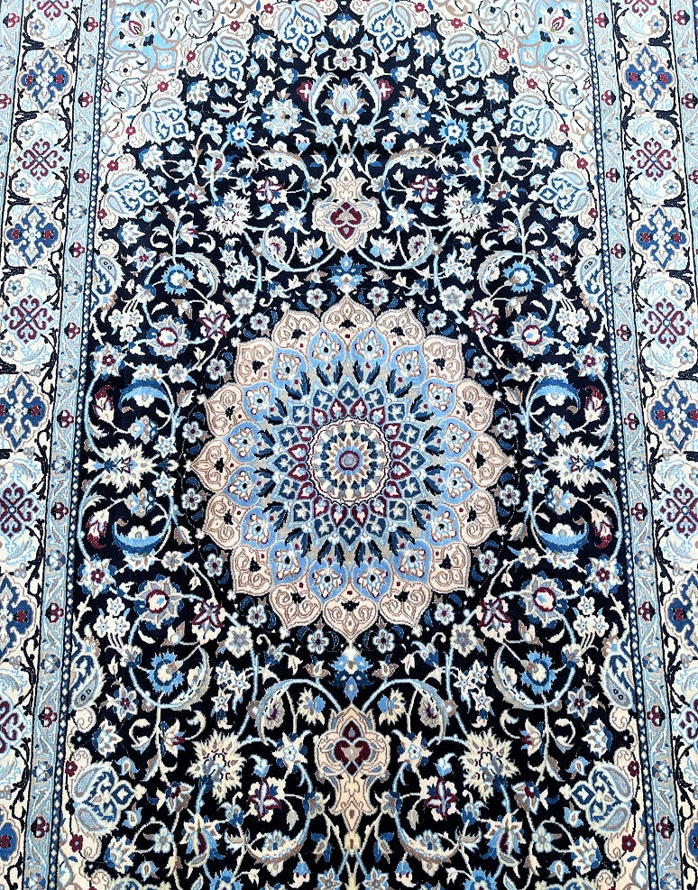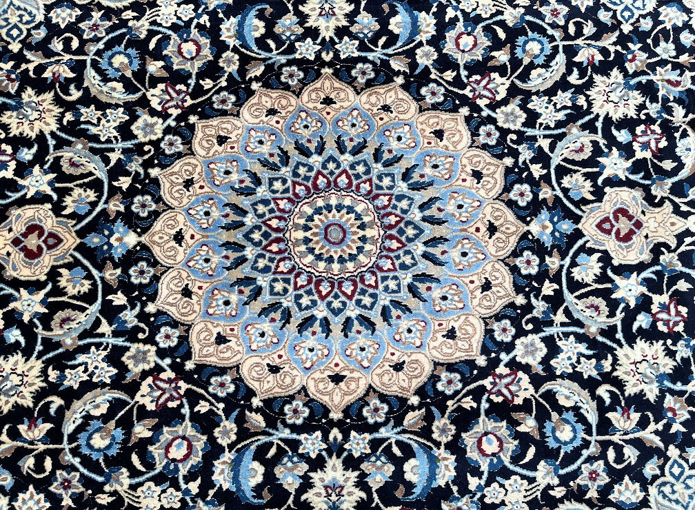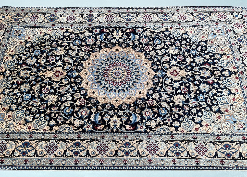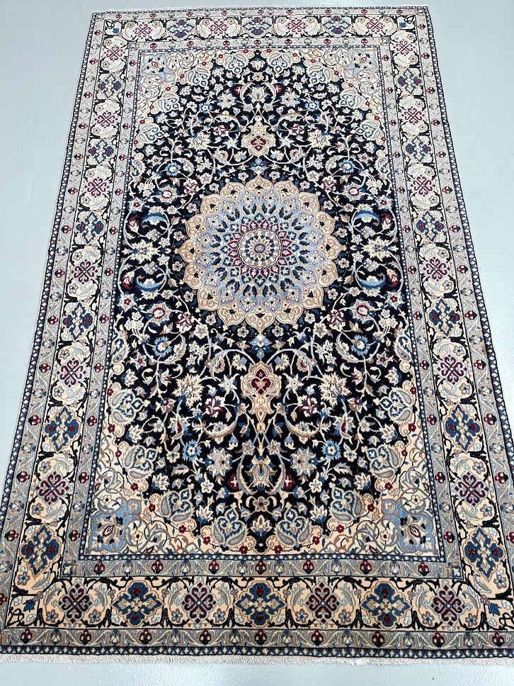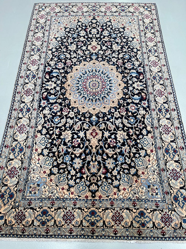 Superb Room Size Authentic Handmade Vintage Persian Nain Rug. Above All It Is Hard To Get This Quality Original Handmade Rug From This Region. It Also Has A Lamb’s Wool And Silk Pile On Cotton Base. Indigo Blue, Aqua, Burgundy, Cream And Beige Tones Dyed Using Traditional Methods.