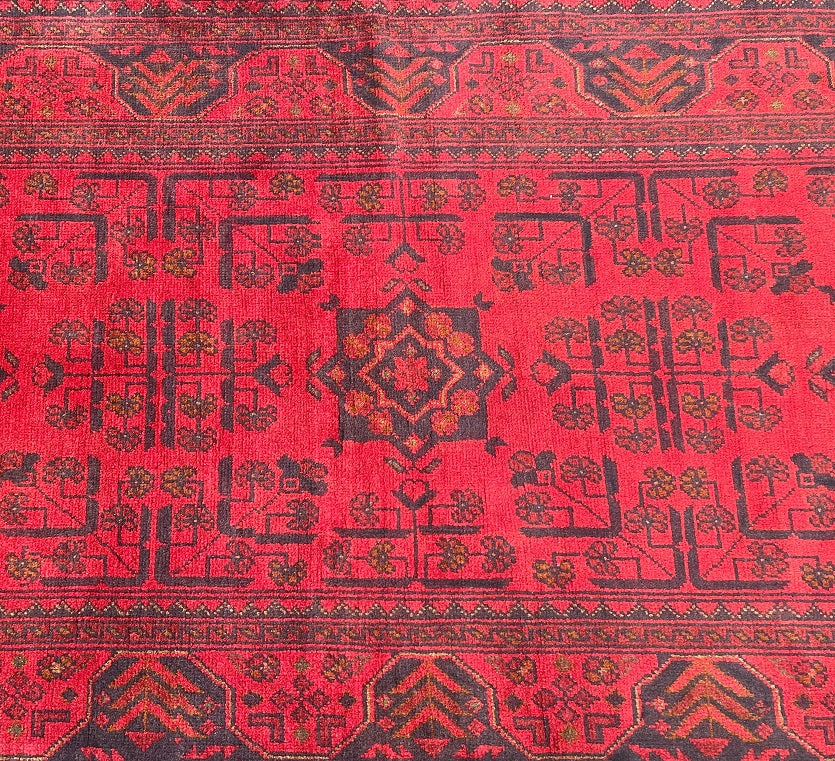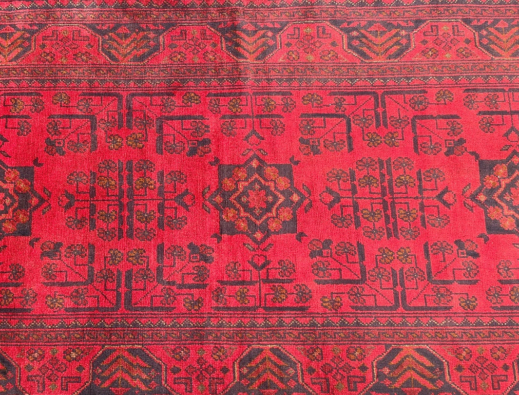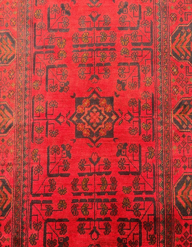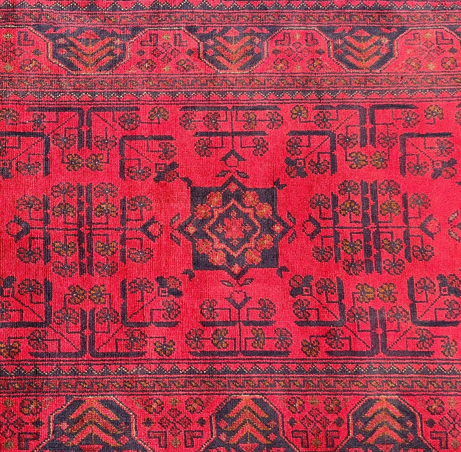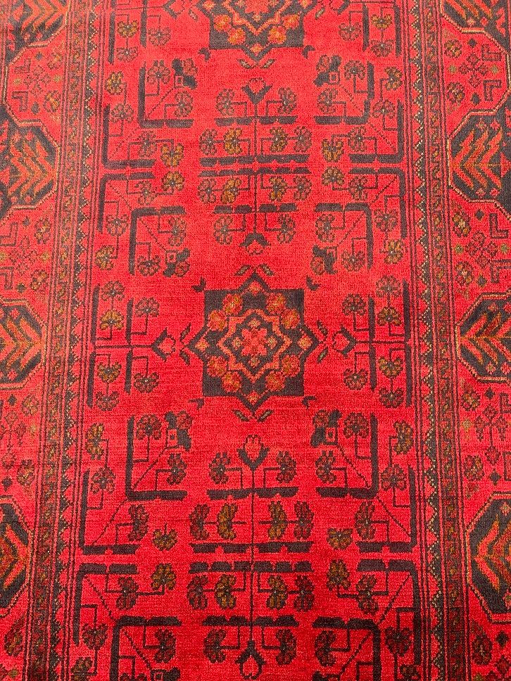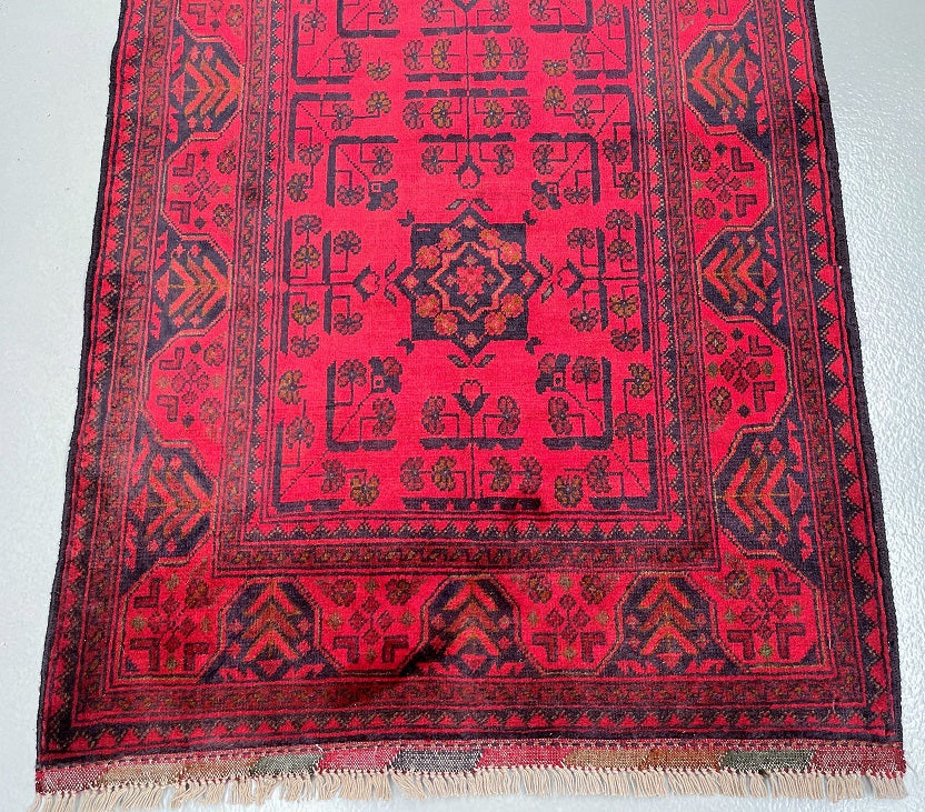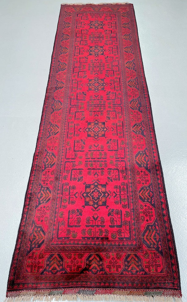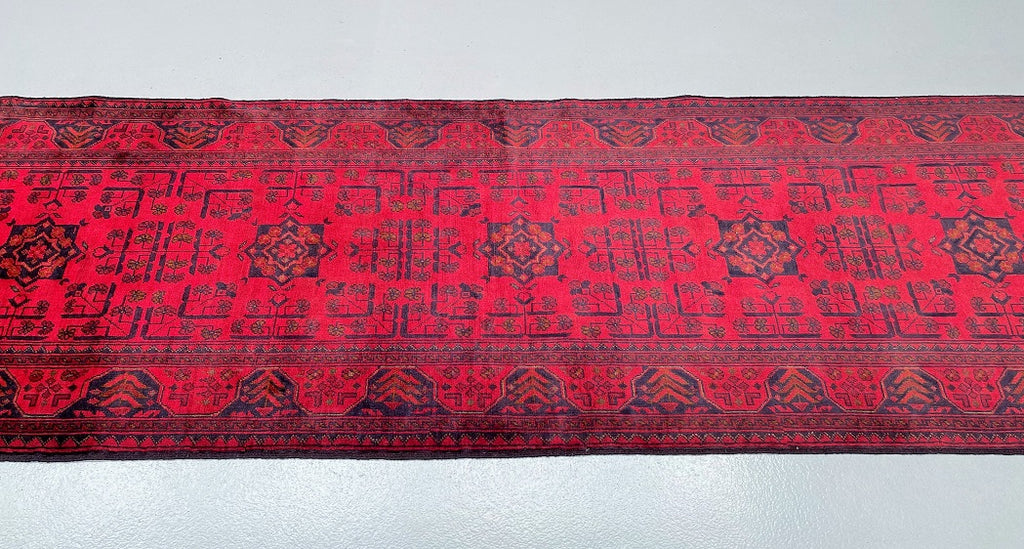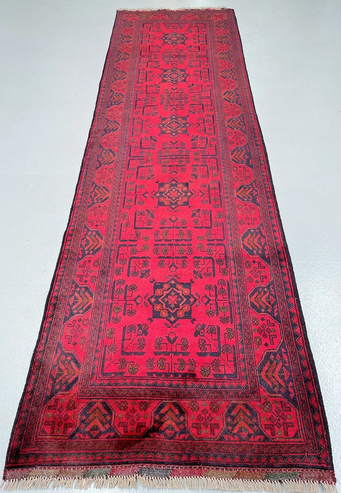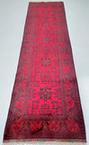 Authentic Hand Knotted Tribal Afghan Kunduz Hall Runner. Above All It Has A Pure Hand Spun Wool Pile On Cotton Base. It Also Has A Deep Burnt Terracotta/Burgundy Tone Dyed Using Traditional Methods. This Runner Would Look Fantastic On Wooden Floor Board.