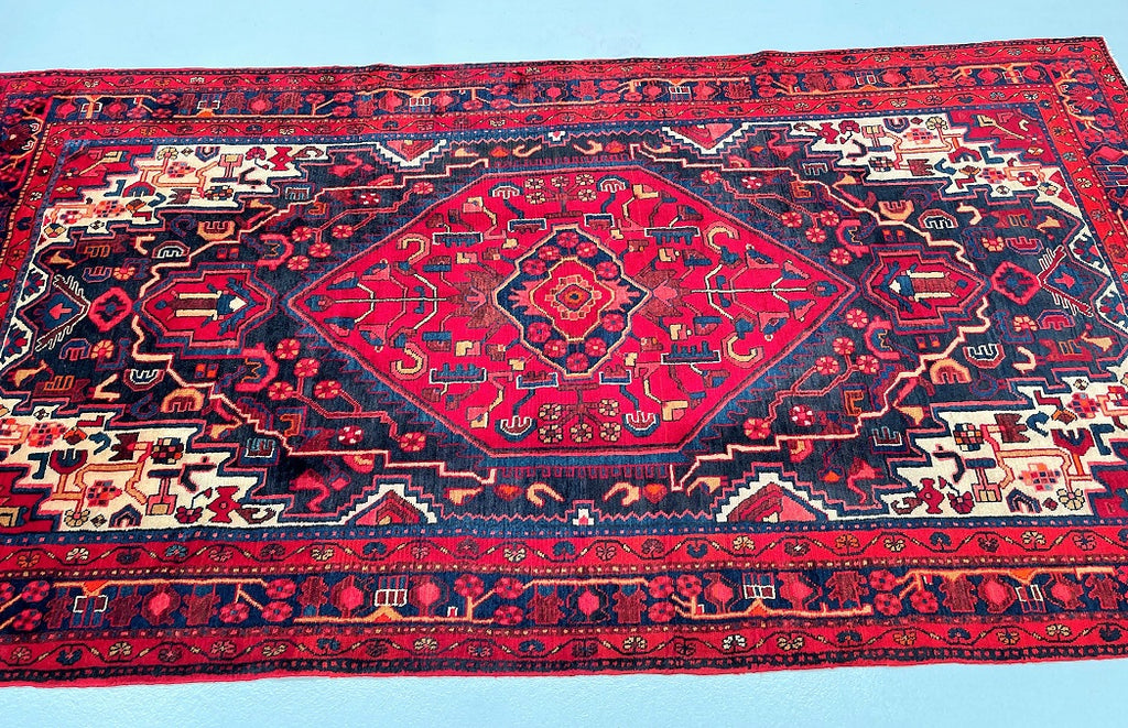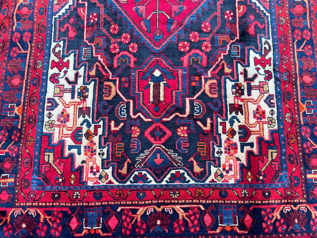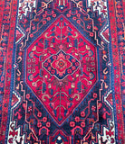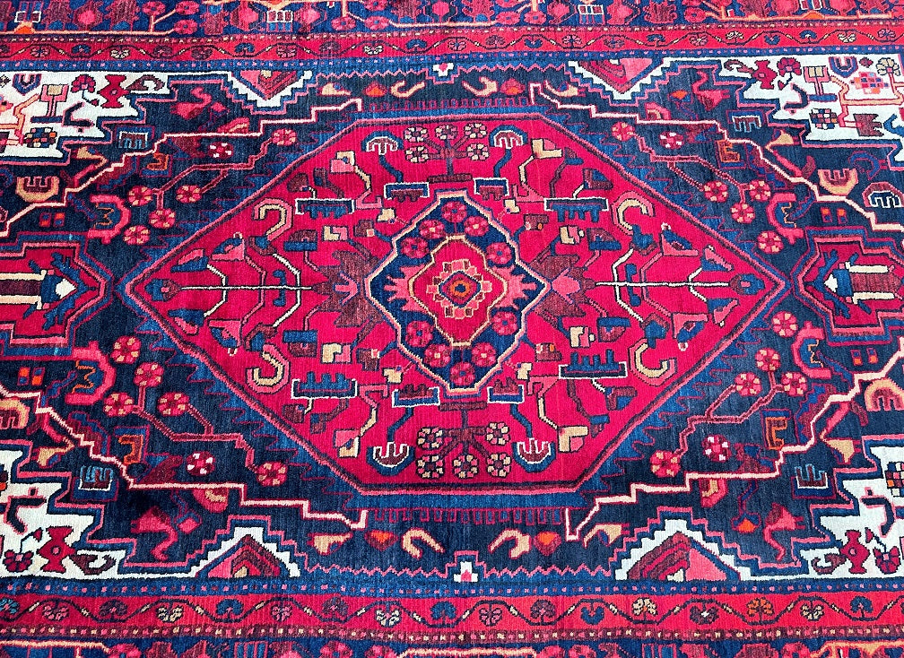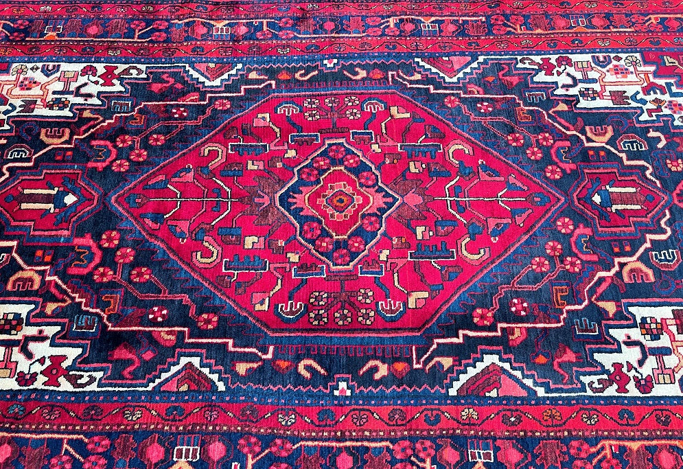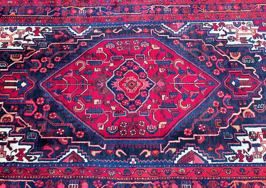 Gorgeous Full Room Size Hand Knotted Persian Village Tuserkan Rug. Above All It Is Hard To Find Village Rugs in Room Size Carpets. Hand Spun Wool Pile On Cotton Base. It Also Has A Deep Indigo Blue, Red, Beige, Orange, Maroon And Pink Tone Dyed Using Traditional Methods.