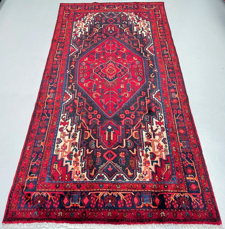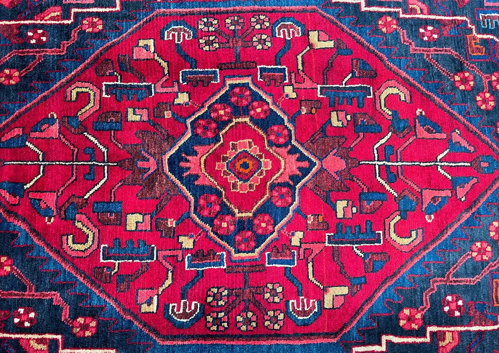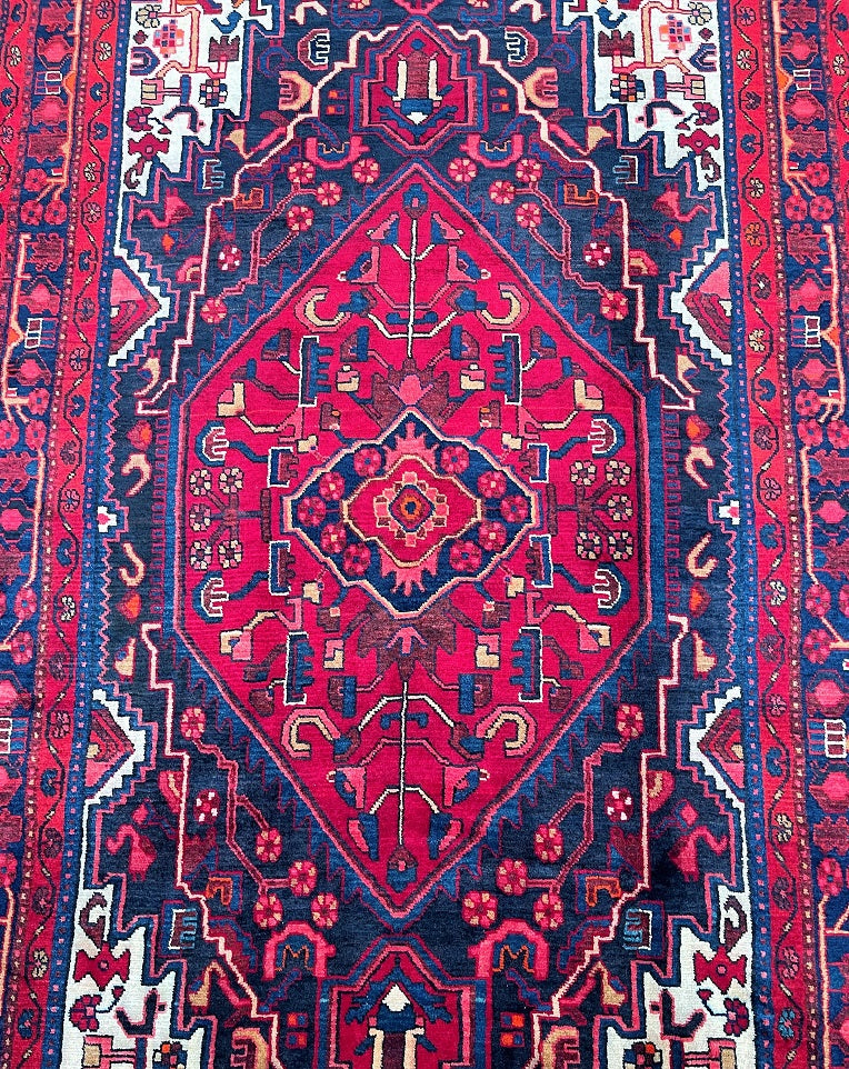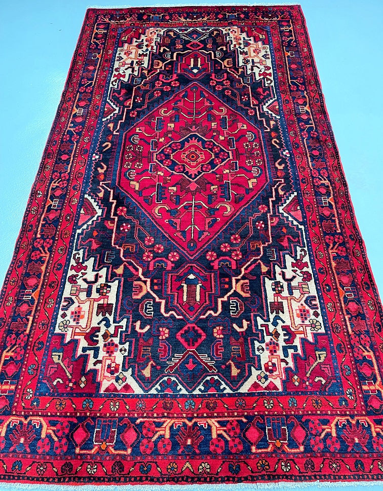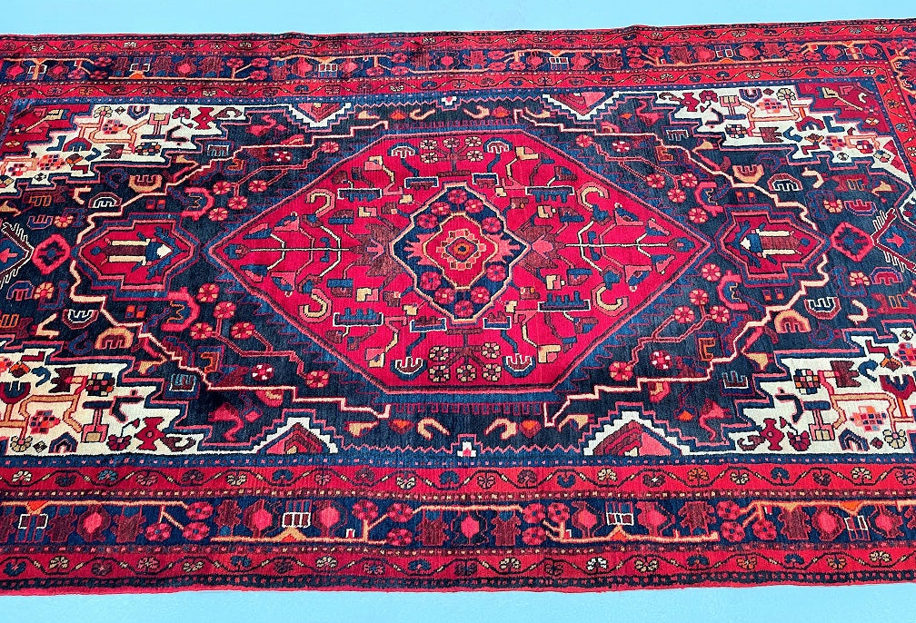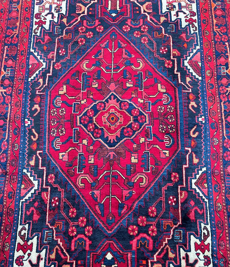 Gorgeous Full Room Size Hand Knotted Persian Village Tuserkan Rug. Above All It Is Hard To Find Village Rugs in Room Size Carpets. Hand Spun Wool Pile On Cotton Base. It Also Has A Deep Indigo Blue, Red, Beige, Orange, Maroon And Pink Tone Dyed Using Traditional Methods.