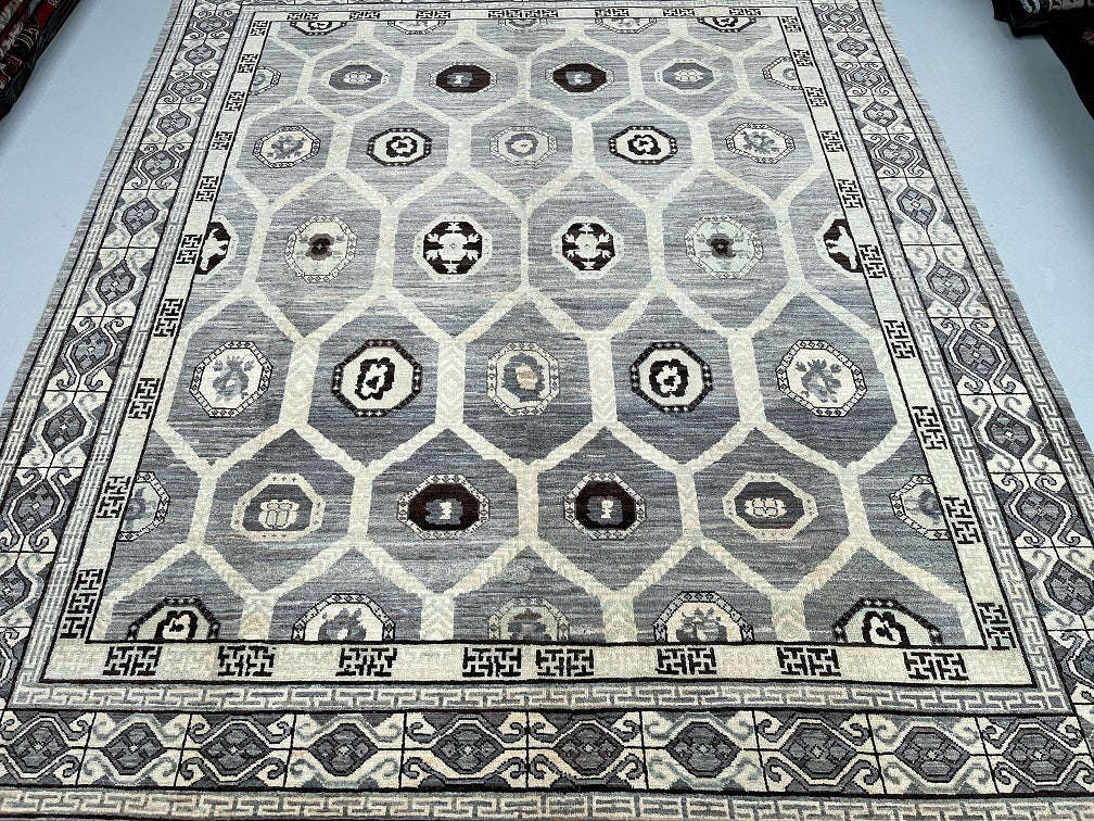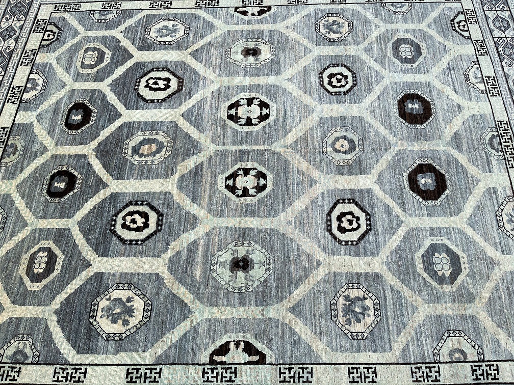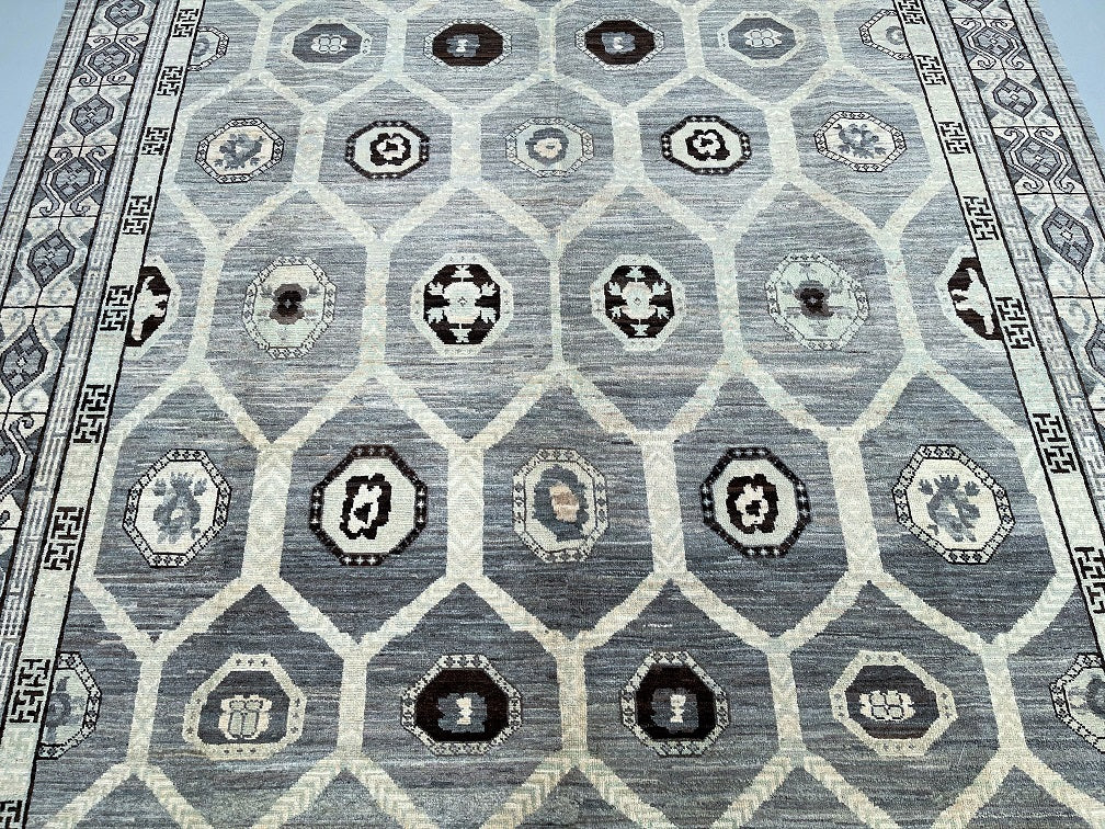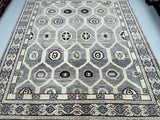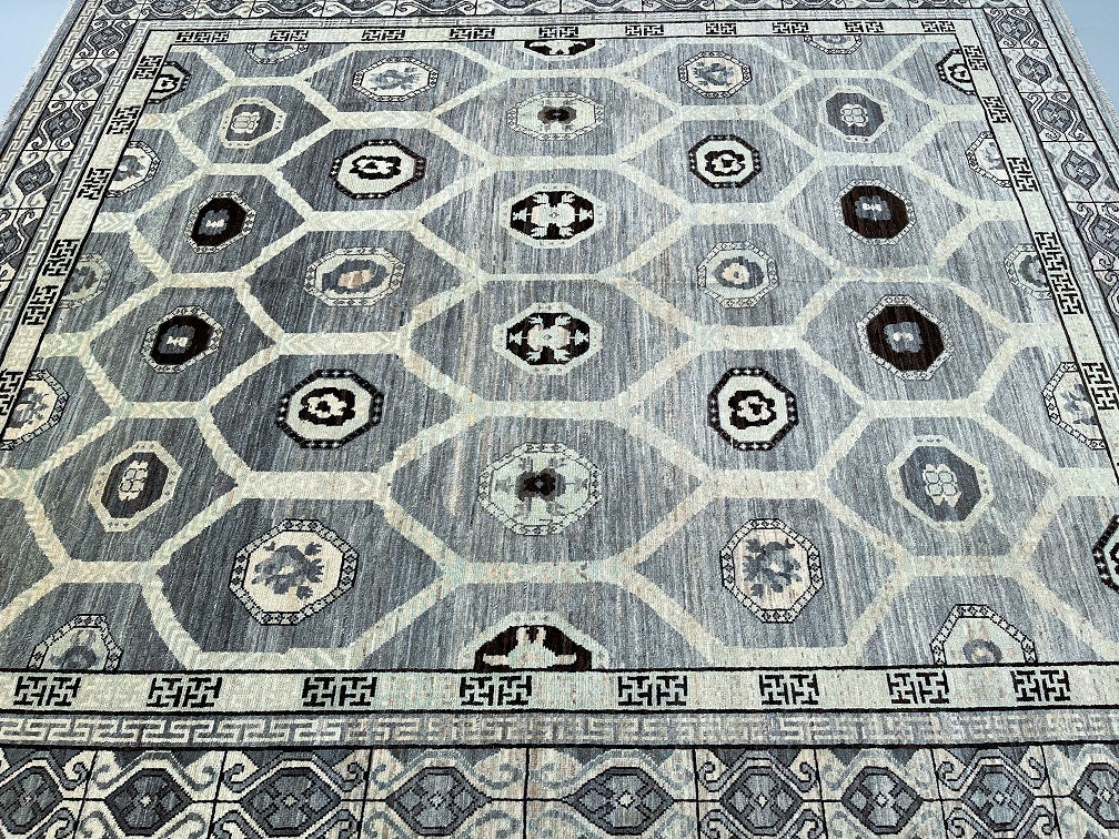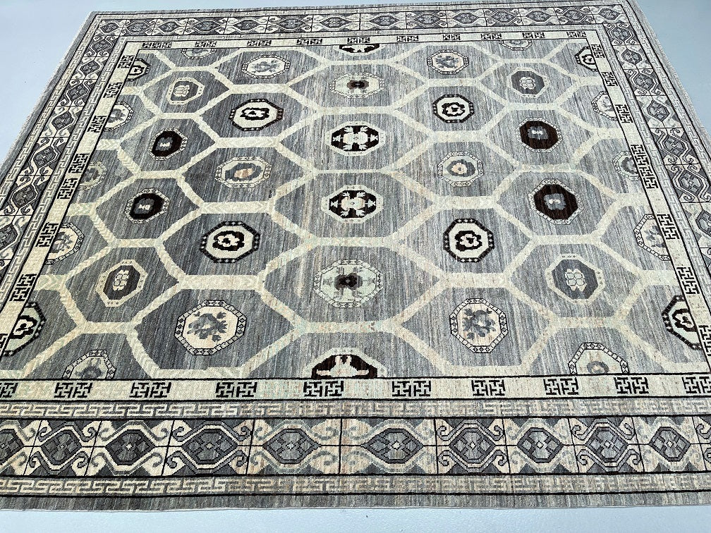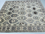 Squarish Full Room Size Genuine Hand Knotted Afghan Turkoman Rug. Above All It Is Pure Hand Spun Wool Pile On Cotton Base. Mostly Grey, Charcoal, Beige, Brown And Black Tone. Last of True Woven Nomadic Art.