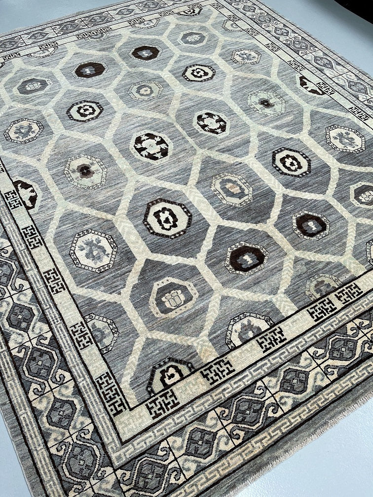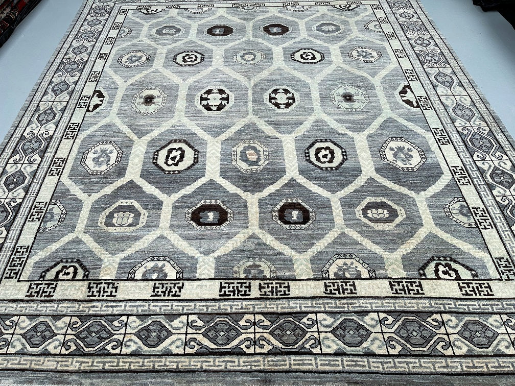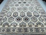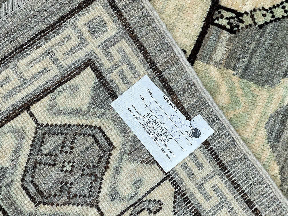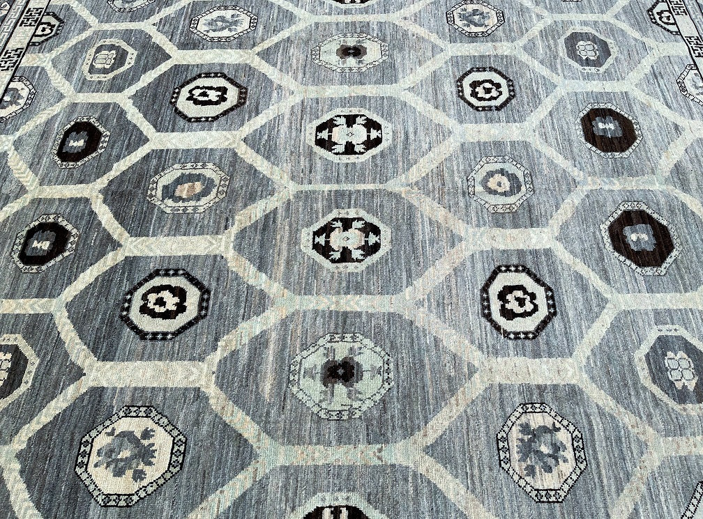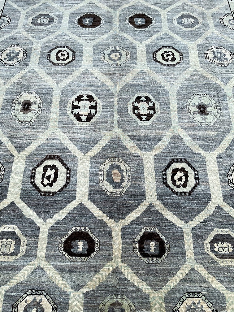 Squarish Full Room Size Genuine Hand Knotted Afghan Turkoman Rug. Above All It Is Pure Hand Spun Wool Pile On Cotton Base. Mostly Grey, Charcoal, Beige, Brown And Black Tone. Last of True Woven Nomadic Art.