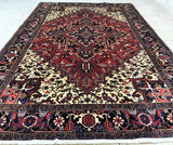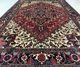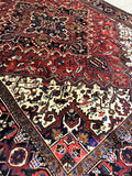 Full Room Size Authentic Handmade Persian Heriz Rug. Above All This Is A Dense Quality Rug With Thick Pile. It Has a Pure Lamb’s Wool Pile On Cotton Base. Main Colors Are Deep Maroon Red, Beige, Brown, Pink, Black And Blue Tone Dyed Using Traditional Methods.