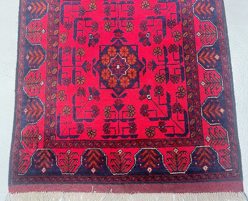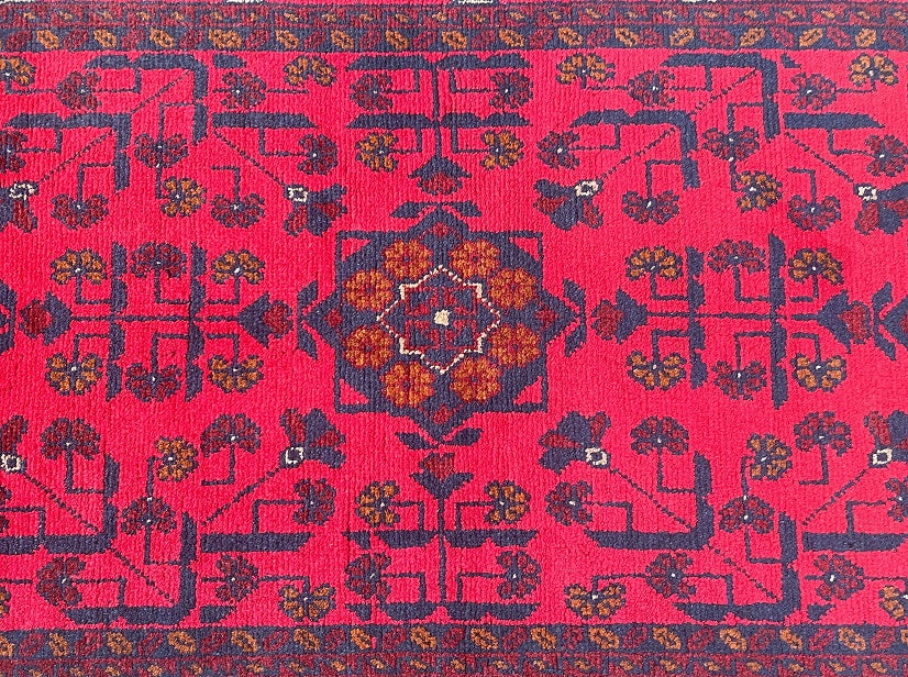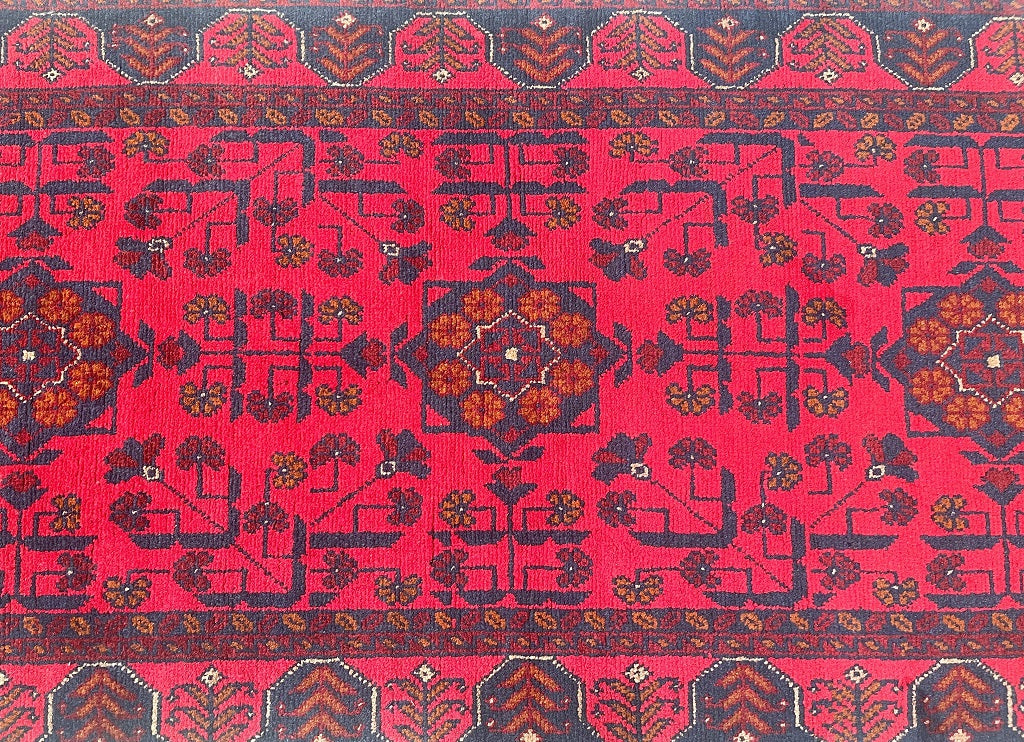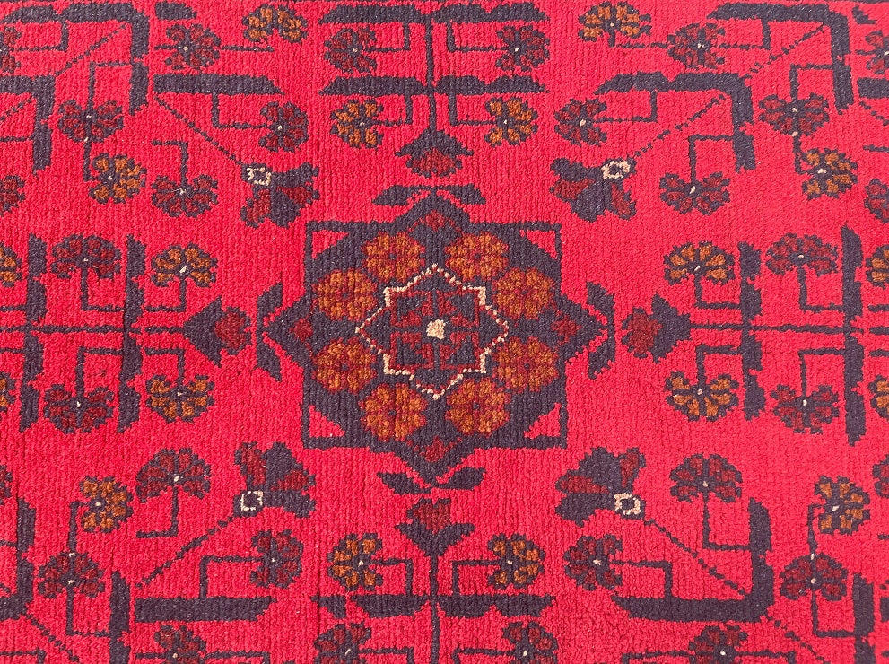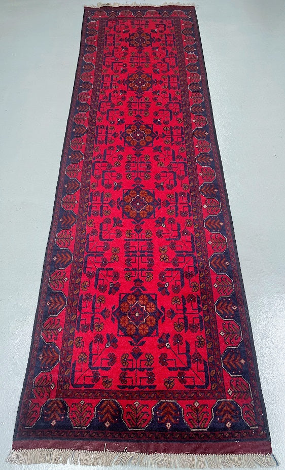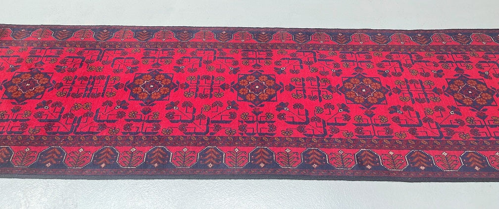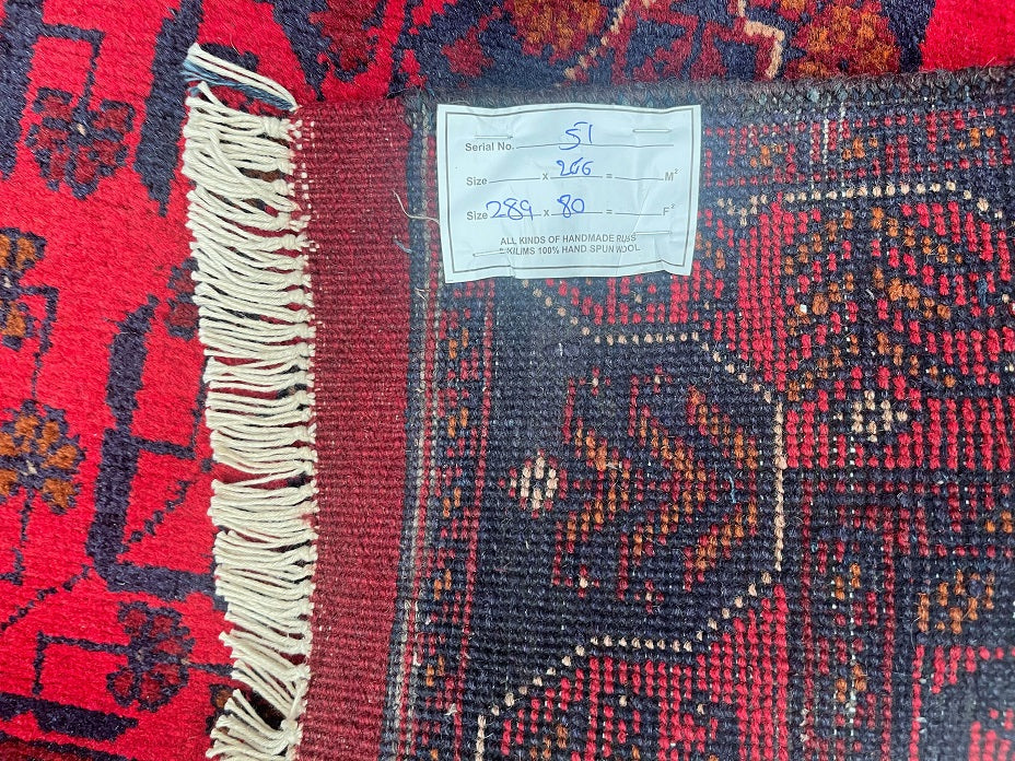 Authentic Hand Knotted Tribal Afghan Kunduz Hall Runner. This remarkable runner is not only hard-wearing but also showcases the craftsmanship of a tribal weaver from Afghanistan. It features a pure hand-spun wool pile on a cotton base, ensuring its quality and longevity. The deep burnt terracotta/burgundy tone, achieved through traditional dyeing methods, adds a touch of warmth and richness to any space. This runner would be a fantastic addition to wooden floorboards, enhancing the overall aesthetic. Its decorative broken branches semi-floral, semi-geometric design adds a unique and artistic element. It is worth noting that this piece required approximately 3 months of dedicated weaving by a skilled weaver. Hand-woven in Afghanistan, this hall runner measures 289 x 80 cm and holds a gallery replacement value of $2499.