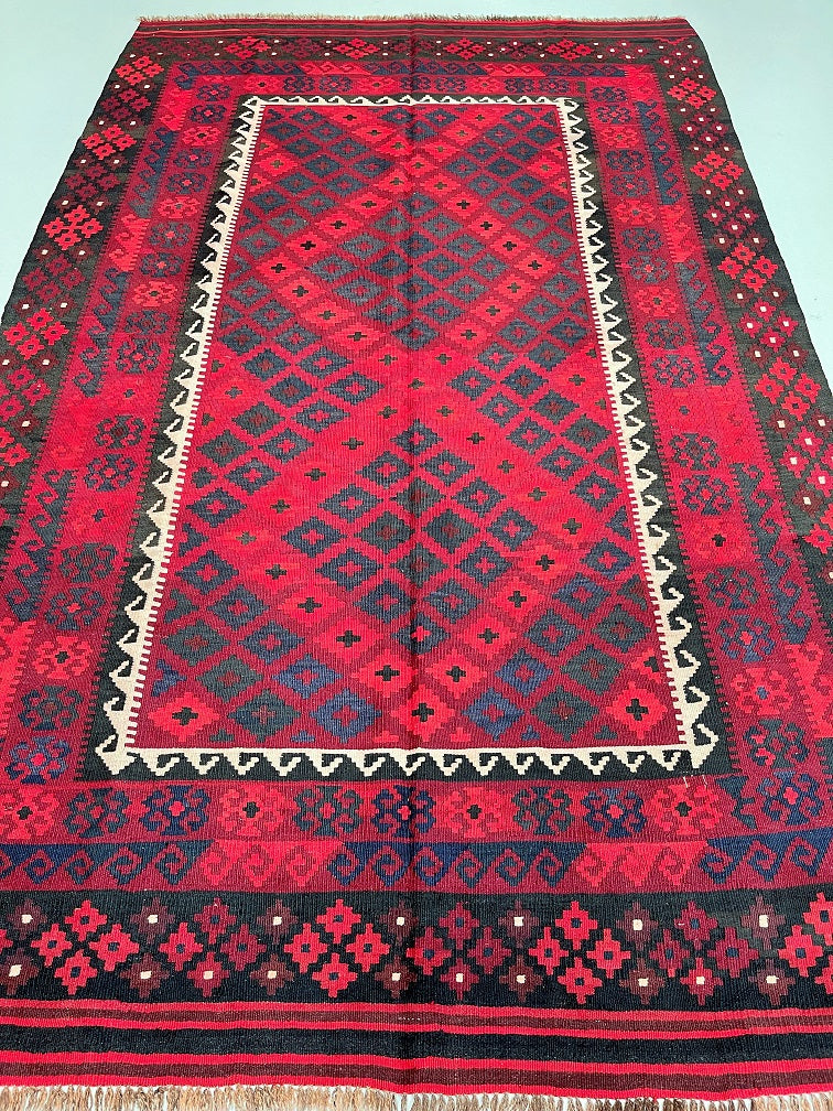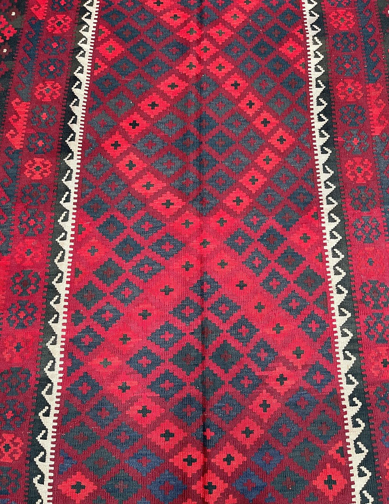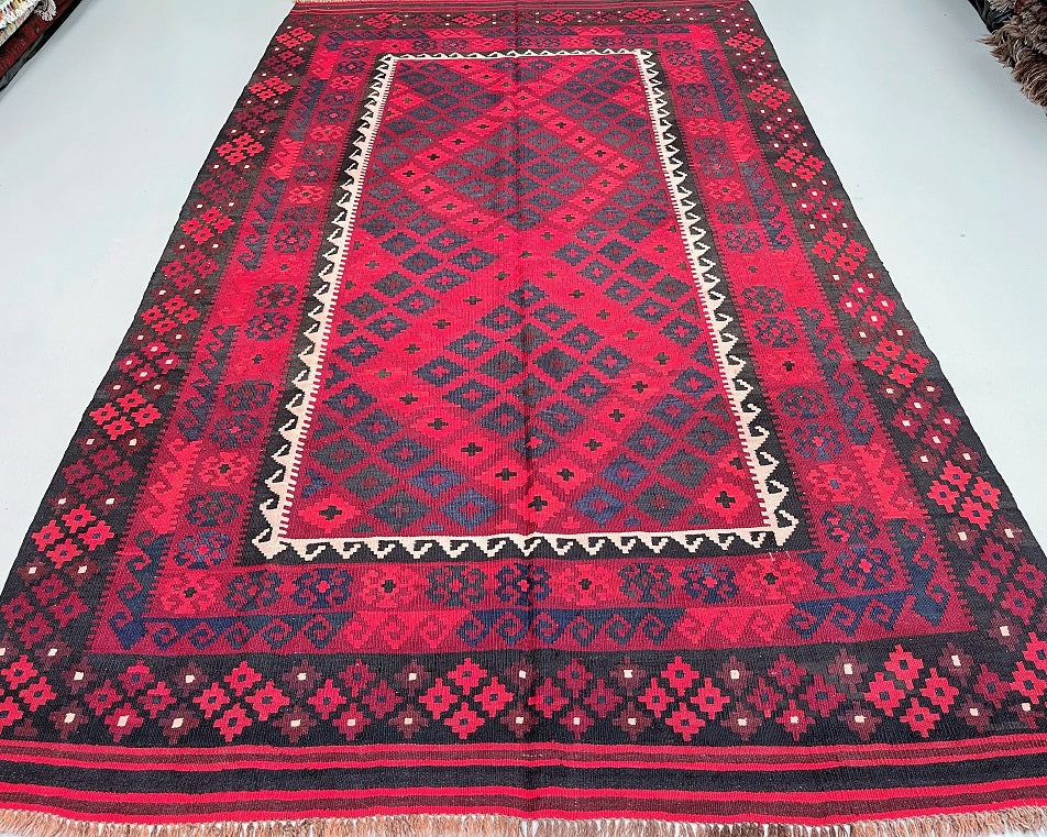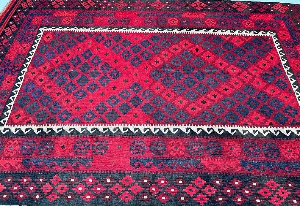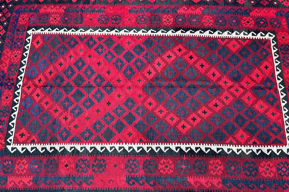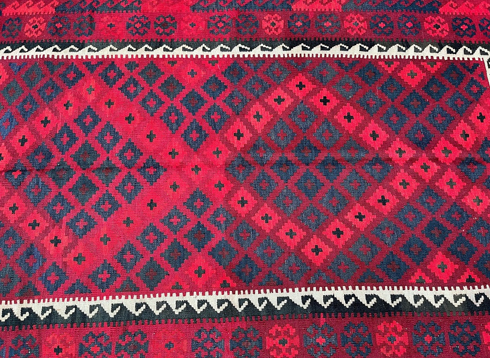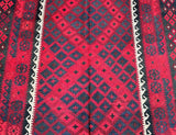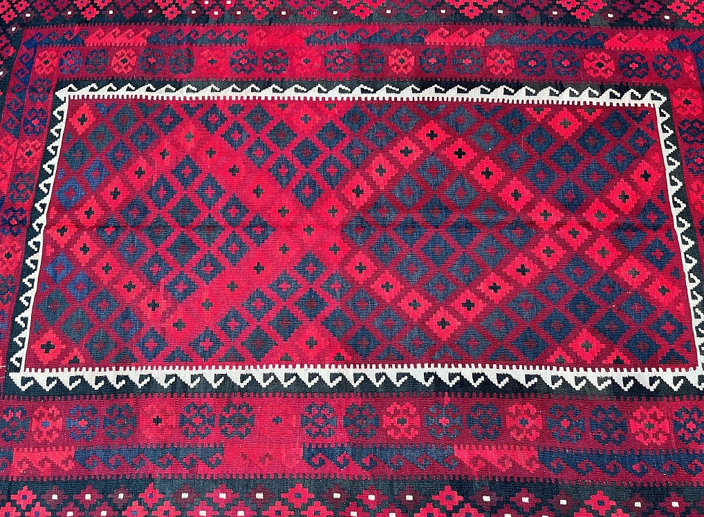 Full Room Size Tribal Design Hand Woven Afghan Meymaneh Kilim Rug. Above All It Has A Pure Hand Spun Wool Pile On Wool Base. Red, Indigo Blue, Beige And Black Tone Dyed Using Traditional Methods.