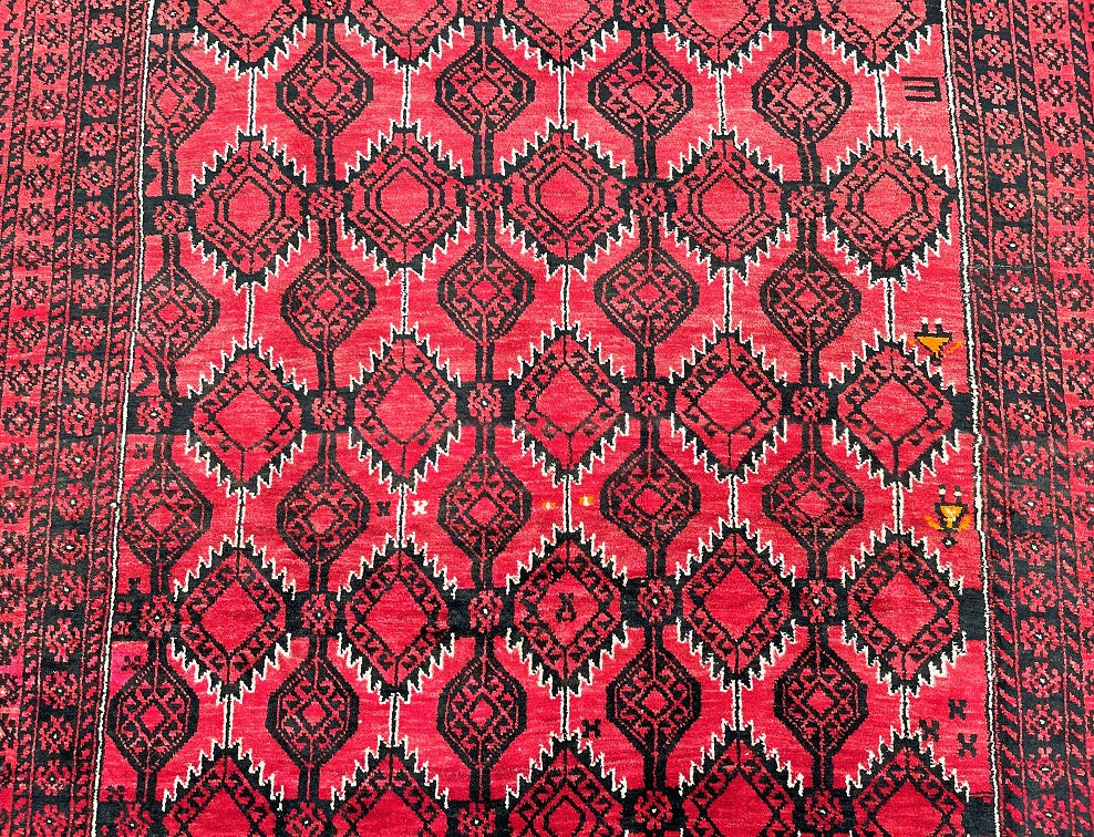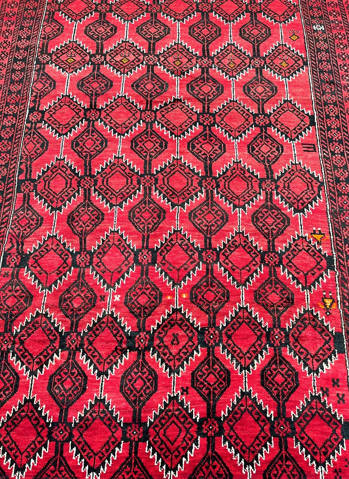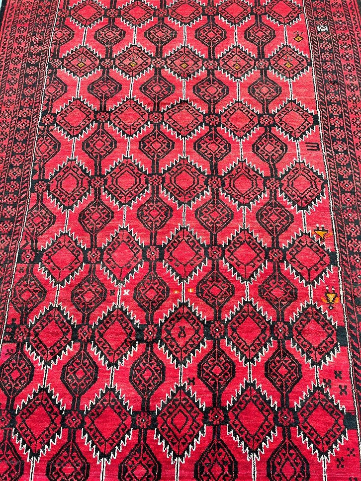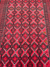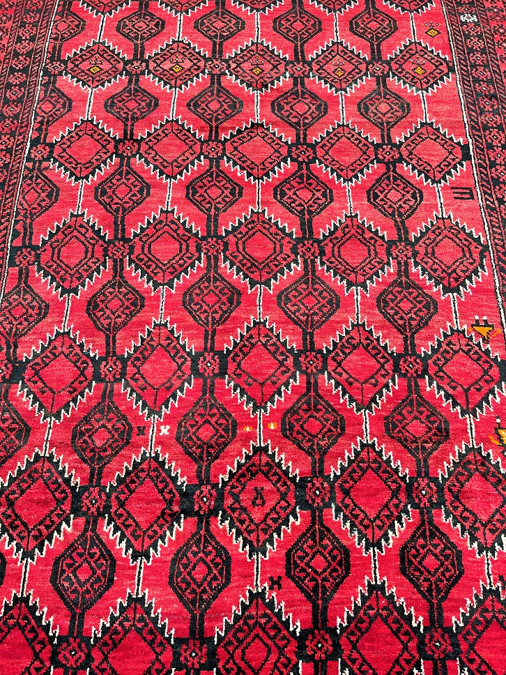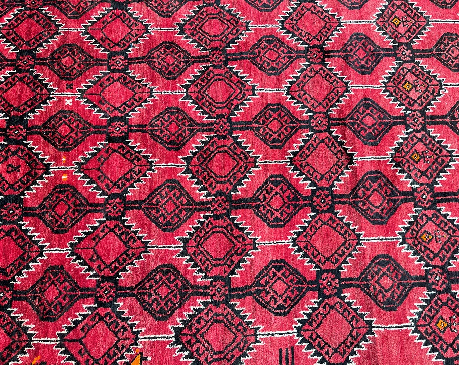 Rare Full Room Size Authentic Handmade Persian Balouchi Rug. Pure Hand Spun Wool Pile On Wool Base. Red, Beige And Black Tone Dyed Using Traditional Methods.
