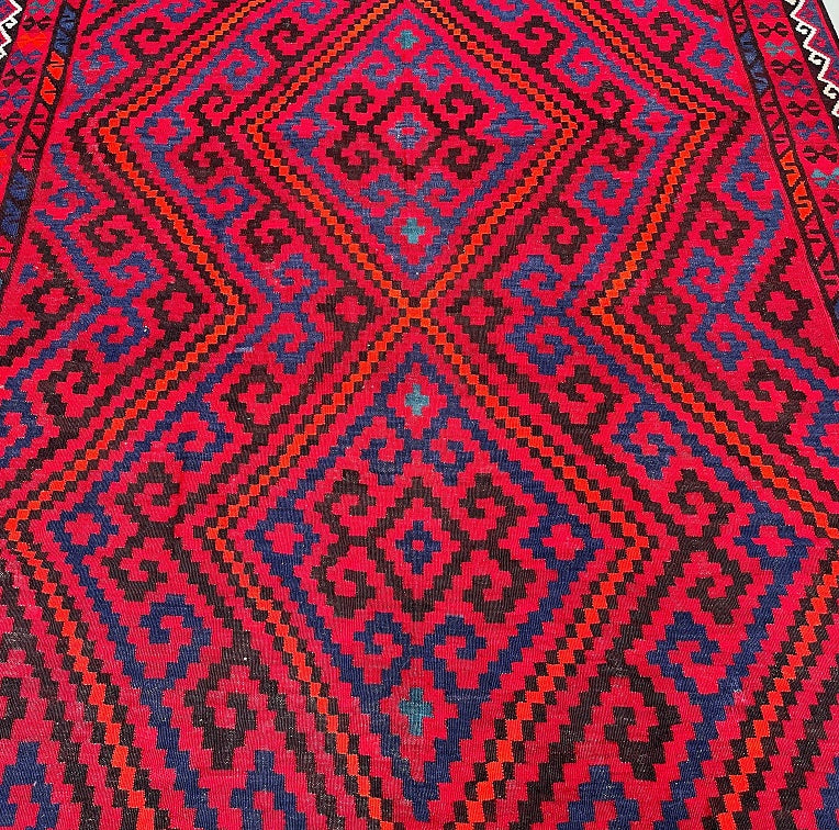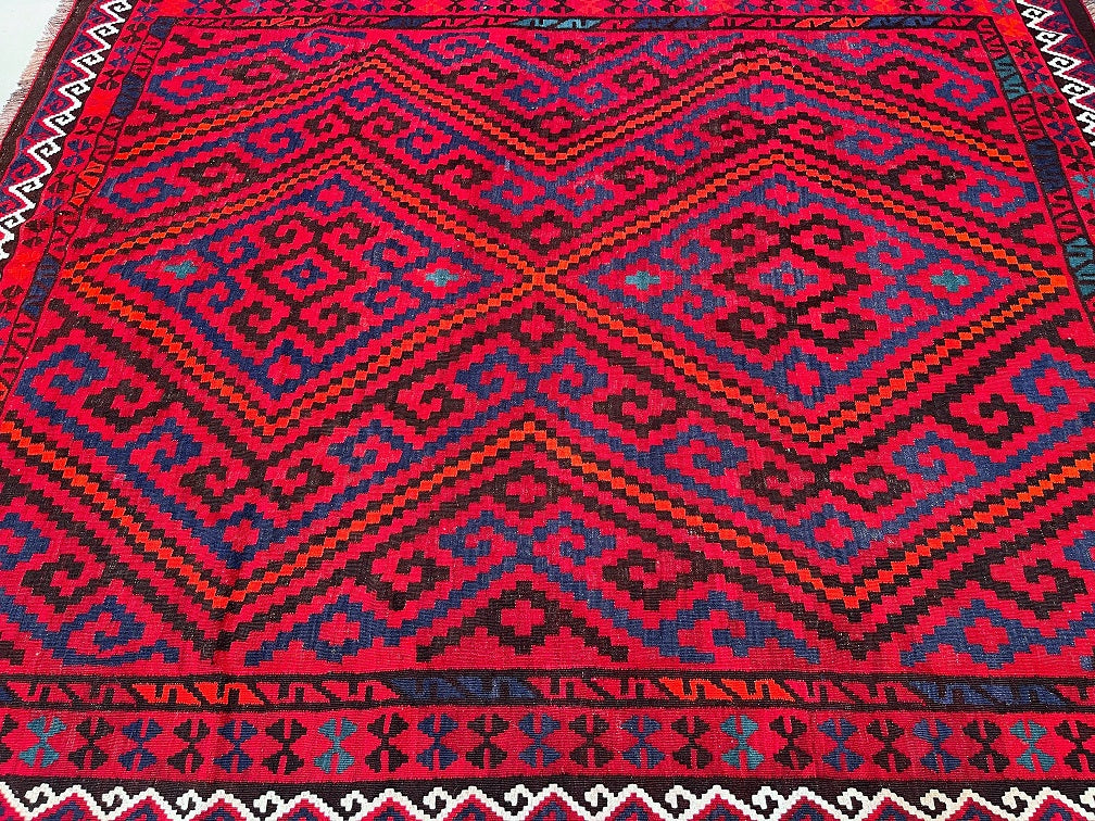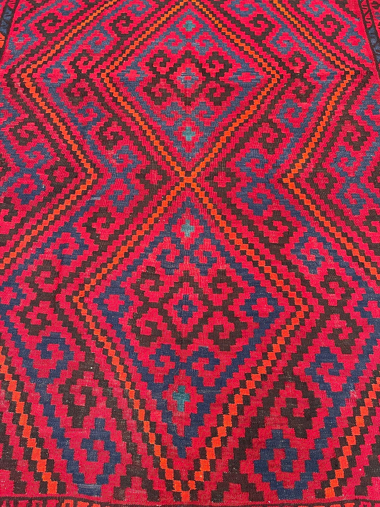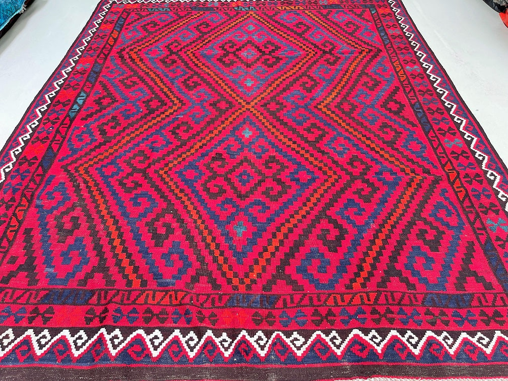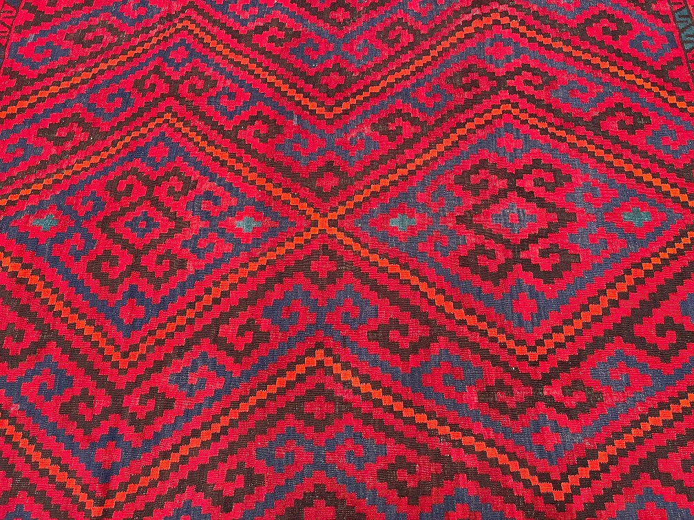Large Room Size Tribal Hand Woven Afghan Maymana Kilim Rug. Above All It Has A Pure Hand Spun Wool Pile On Wool Base. Maroon, Red, Black, White, Indigo Blue And Orange Tone Dyed Using Traditional Methods.