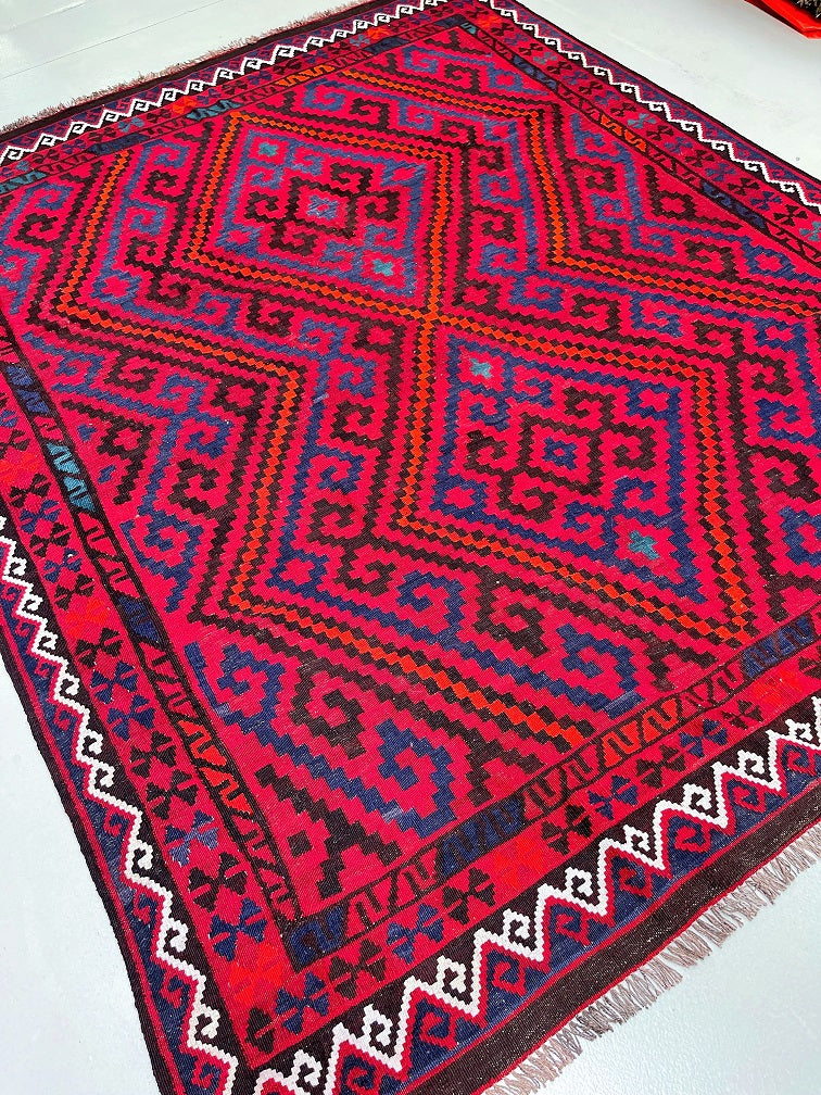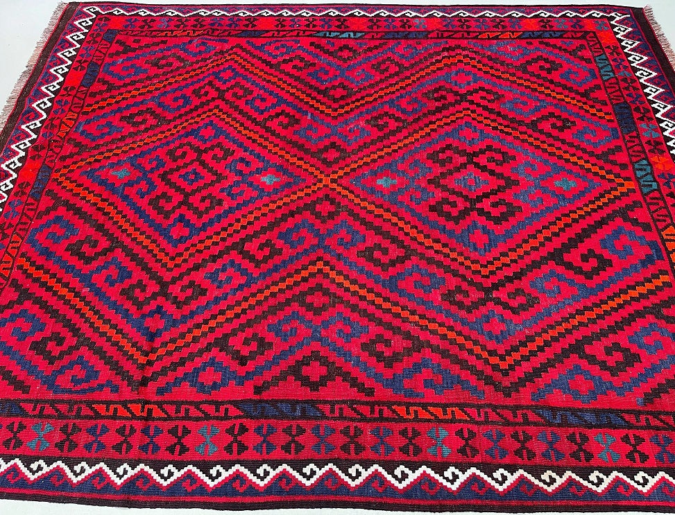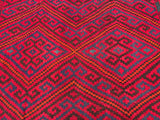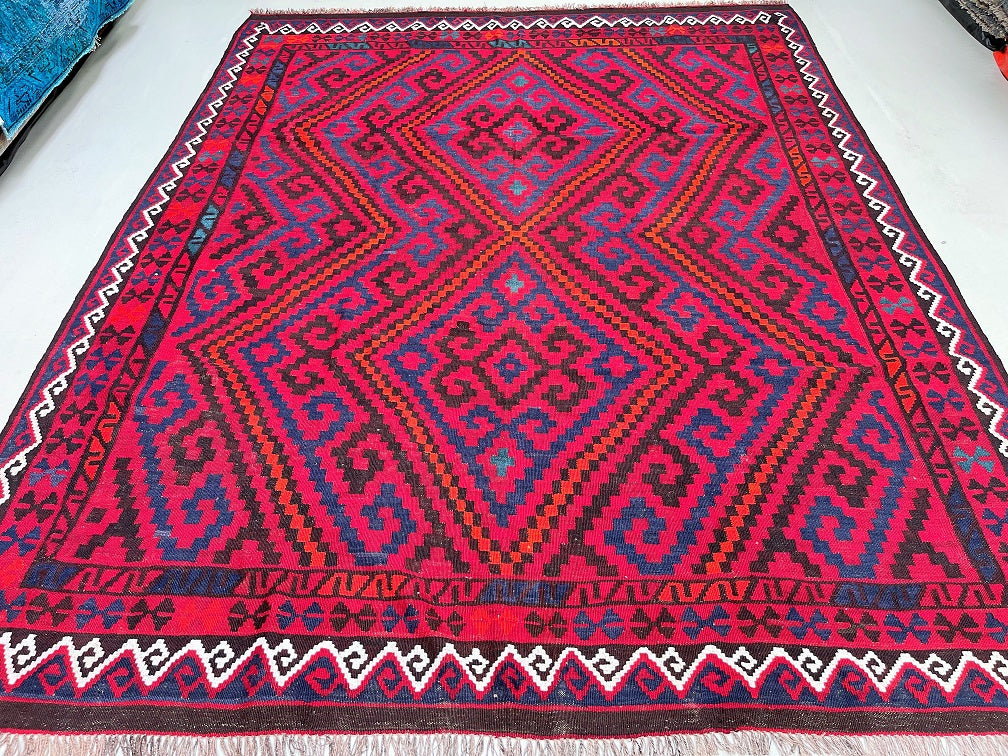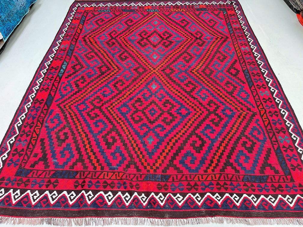 Large Room Size Tribal Hand Woven Afghan Maymana Kilim Rug. Above All It Has A Pure Hand Spun Wool Pile On Wool Base. Maroon, Red, Black, White, Indigo Blue And Orange Tone Dyed Using Traditional Methods.