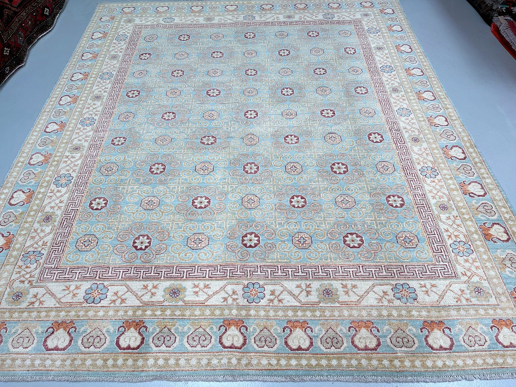 Gorgeous Large Room Size Authentic Hand Knotted Afghan Chobi Rug. Above All It Is Pure Hand Spun Wool Pile On Cotton Base. Beige, Light Blue, Caramel And Maroon Tone Dyed Using Traditional Methods (Vegetable Dyes). Last of True Woven Nomadic Art.